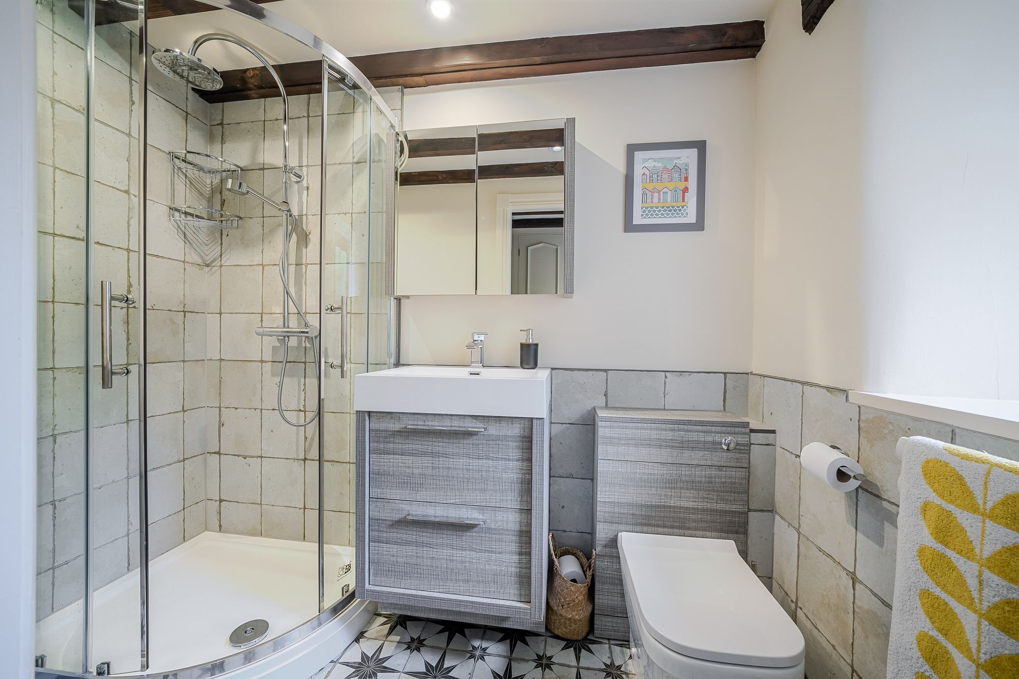 Shower RoomThe shower room features a modern contemporary three piece suite which comprises of a wet room style shower with thermostatic reinforced shower head and with separate handheld attachment, a broad wash hand basin with vanity drawers beneath and monobloc mixer tap over and a low level WC with concealed cistern and push button flush. There is attractive tiled flooring and brick effect tiling to the walls, inset spotlight into the ceilings and an extractor fan. Additionally, there is a beautiful exposed timber beam to the ceilings and an anthracite ladder style radiator.