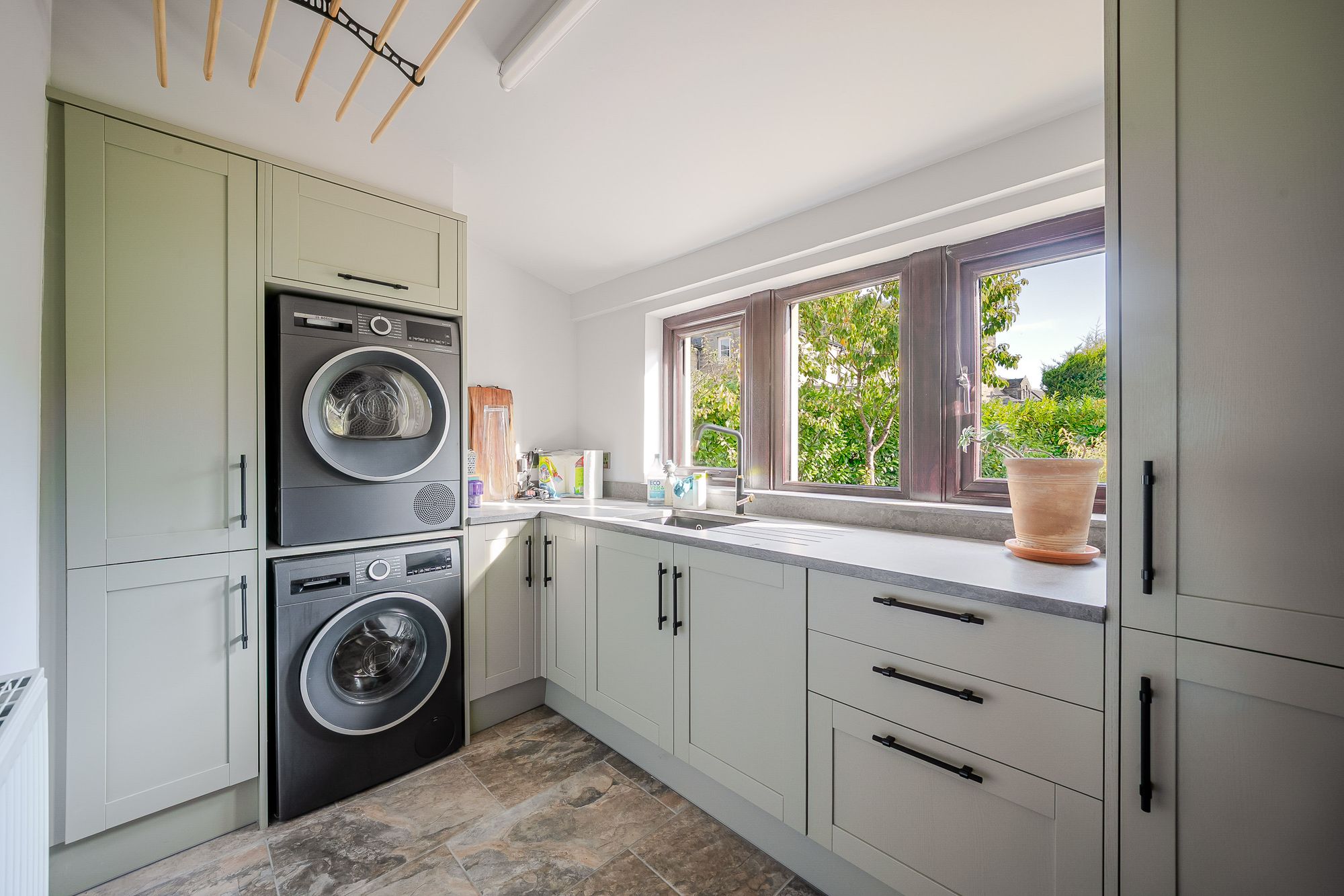 Utility RoomThe attractive tiled flooring with central heating radiator continues through from the open plan dining kitchen into the utility, which features a double glazed composite door to the side elevation leading out to the gardens. There are a bank of double glazed mullioned windows to the rear elevation, a LED tube light point and a radiator. The utility features fitted wall and base units, again with attractive shaker-style cupboard fronts and with complimentary granite work surfaces over, which incorporates a 1 1/2 bowl composite inset sink unit with level drainer and mixer tap over. There is plumbing and provisions for an automatic washing machine, a tumble dryer and a cupboard houses the Proper Safe boiler.