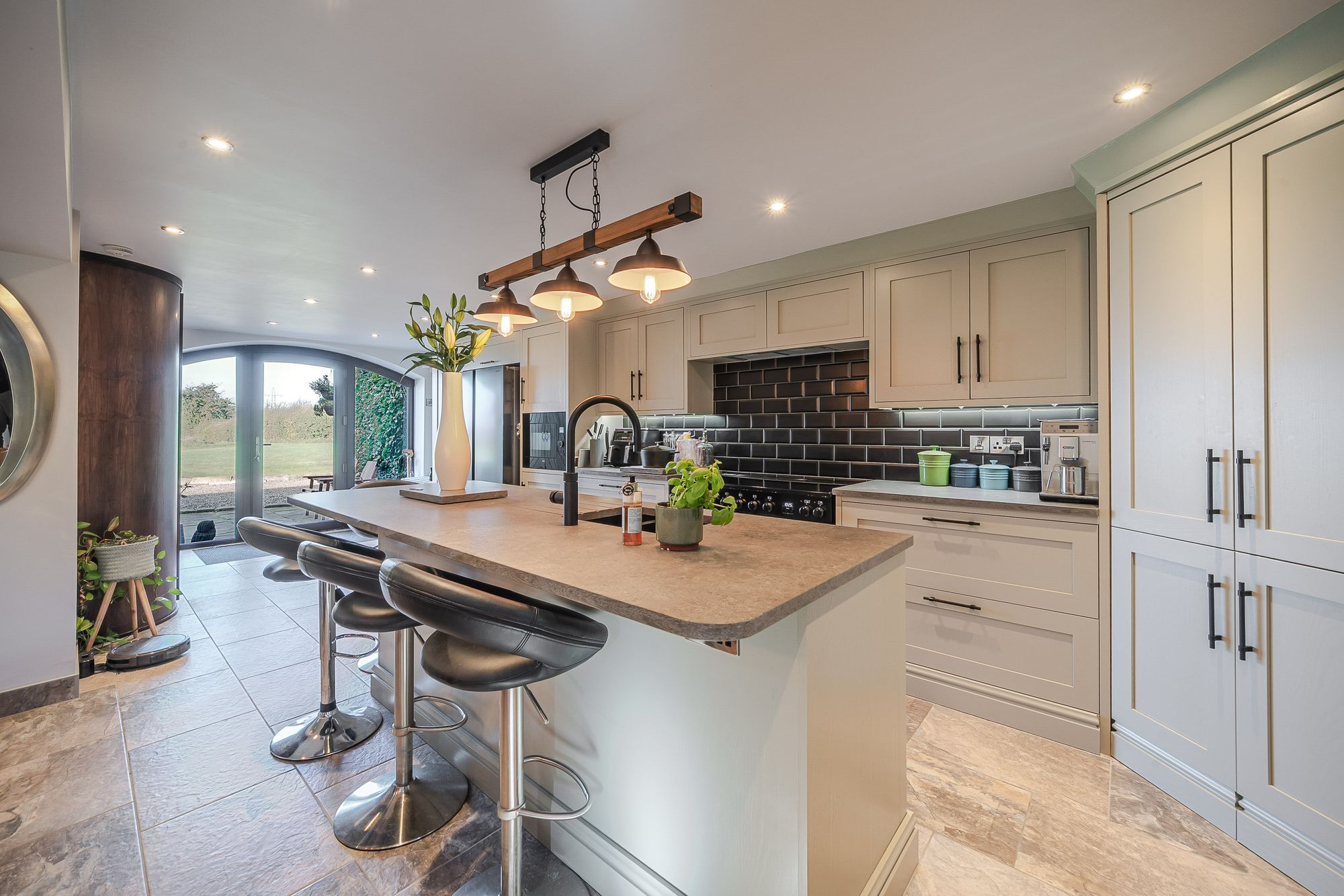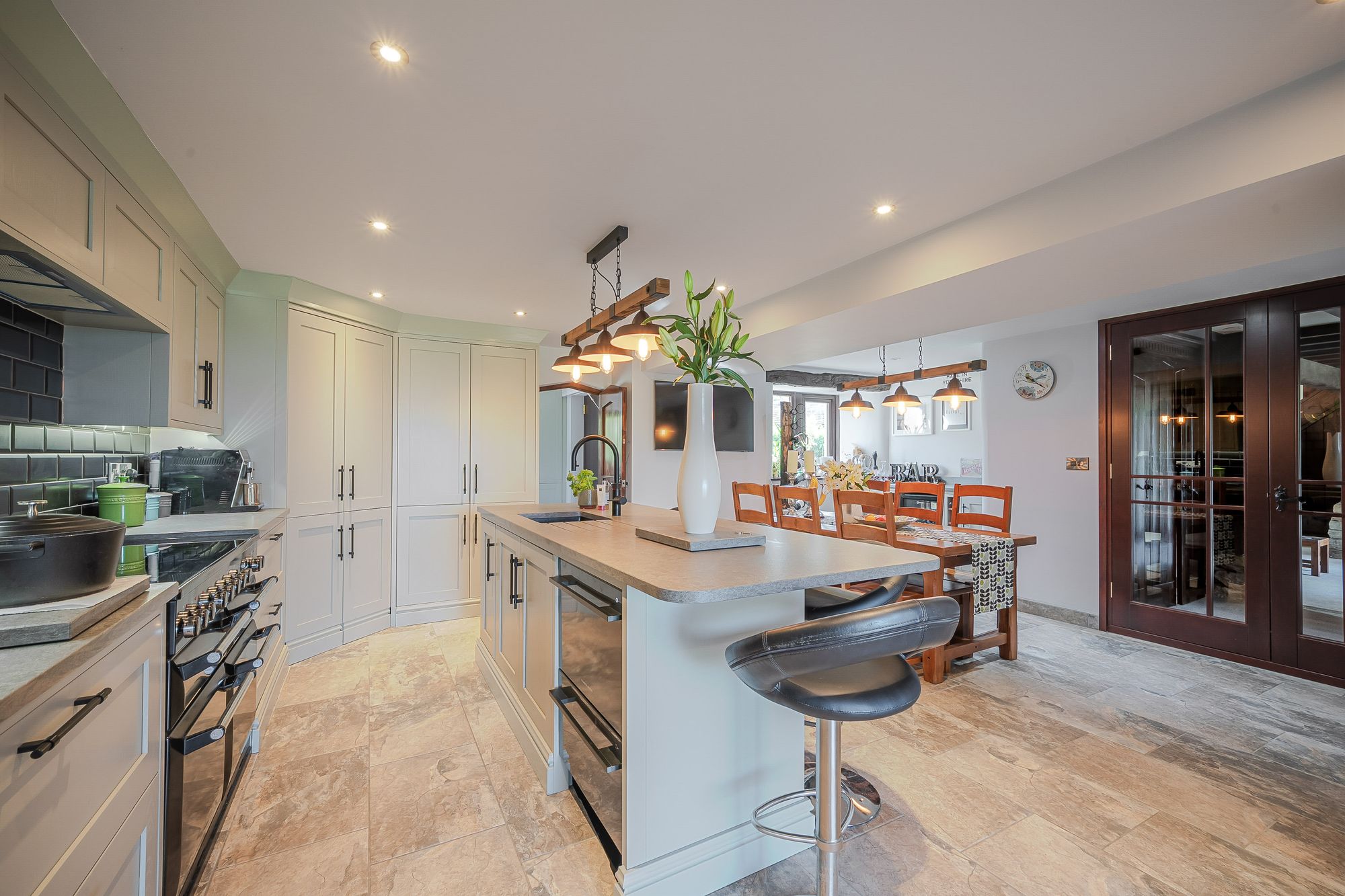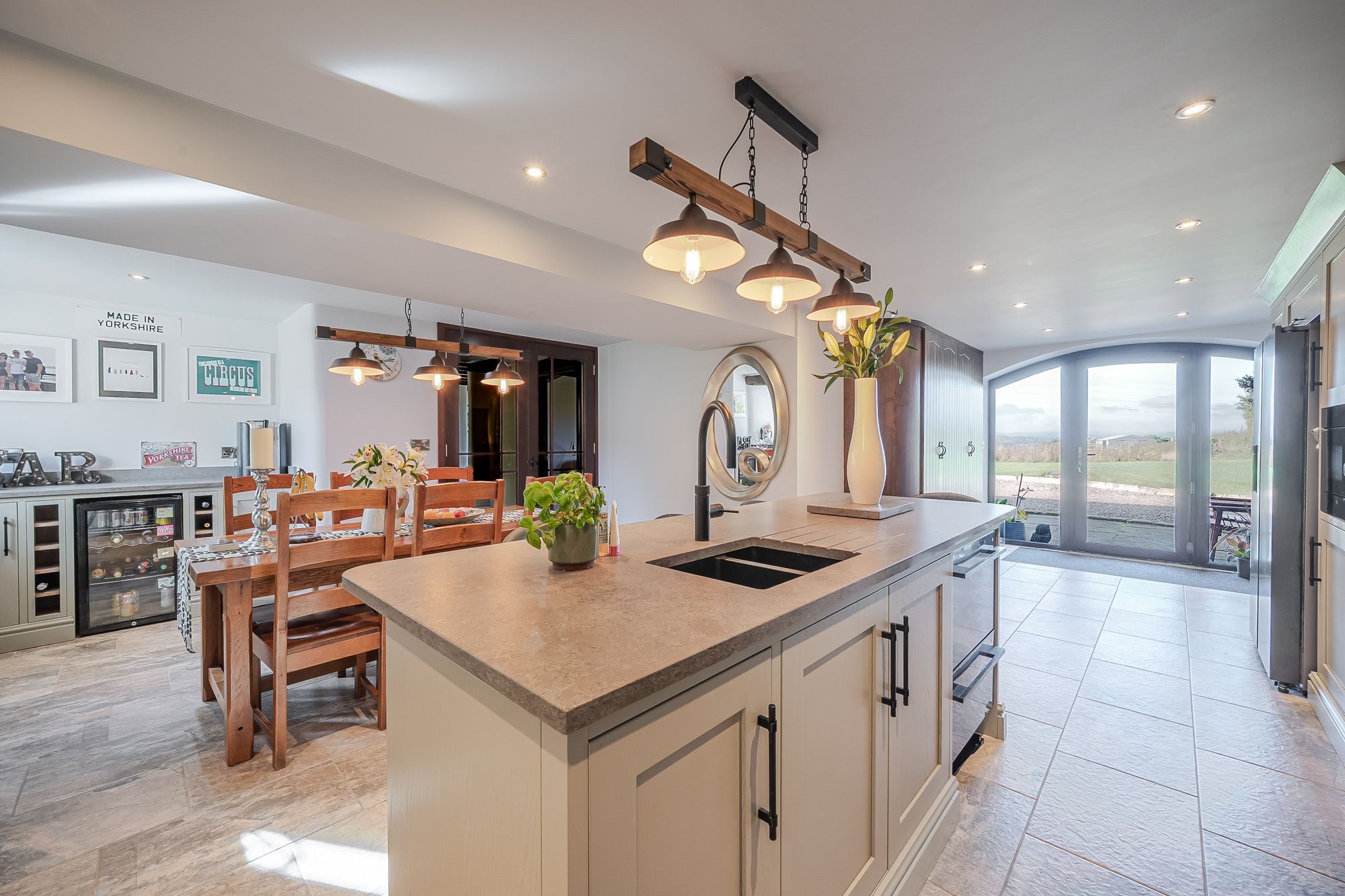 Dining AreaThere is a fitted bar unit with wine storage and cupboards at either side, again with matching granite work surface and upstand. There is a bank of double glazed mullioned windows to the rear elevation with pleasant views onto the gardens and of St Peter's Church. There are twin timber and glazed doors which provide access to an inner vestibule and an arched timber door leads to the utility.