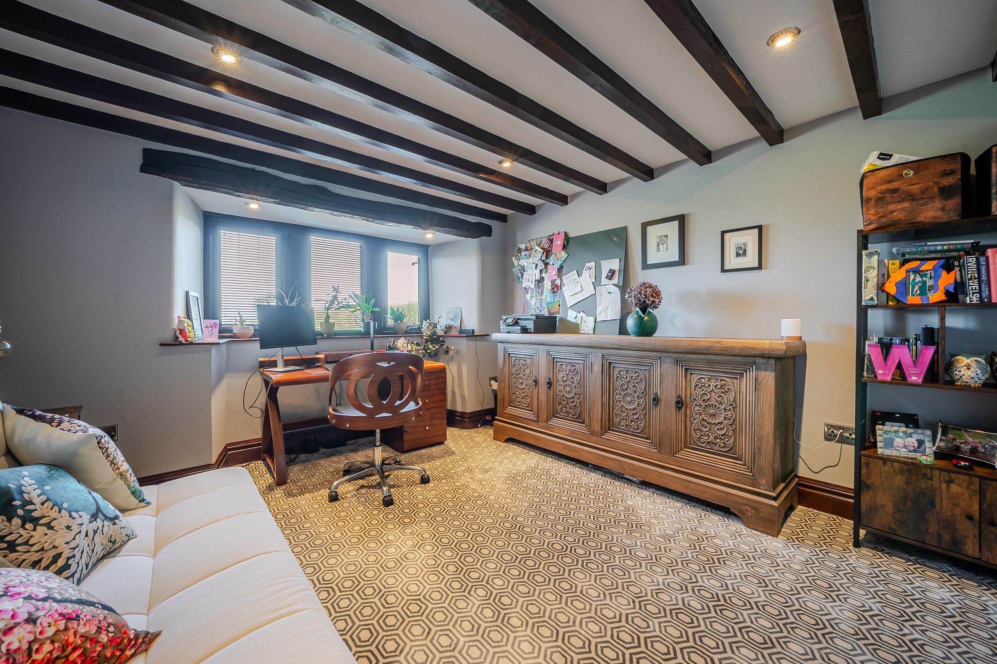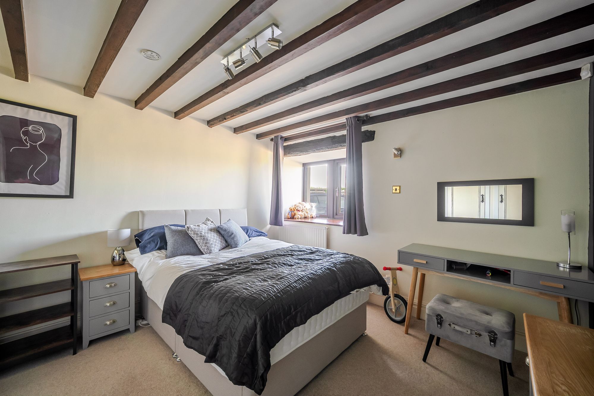 Home Office/Bedroom ThreeThis versatile space can be utilised for a variety of uses. It features a bank of double glazed mullioned windows to the front elevation, again offering pleasant open aspect views across the properties gardens and with far reaching views into the distance. There is a beautiful exposed timber lintel above and timber battens to the ceilings with inset spotlighting, central heating and the room can accommodate a double bed with ample space for freestanding furniture.
