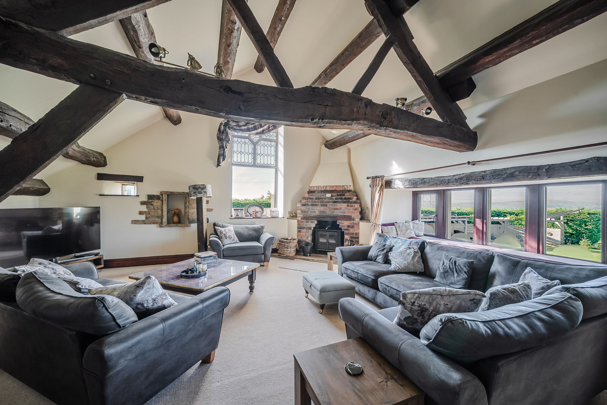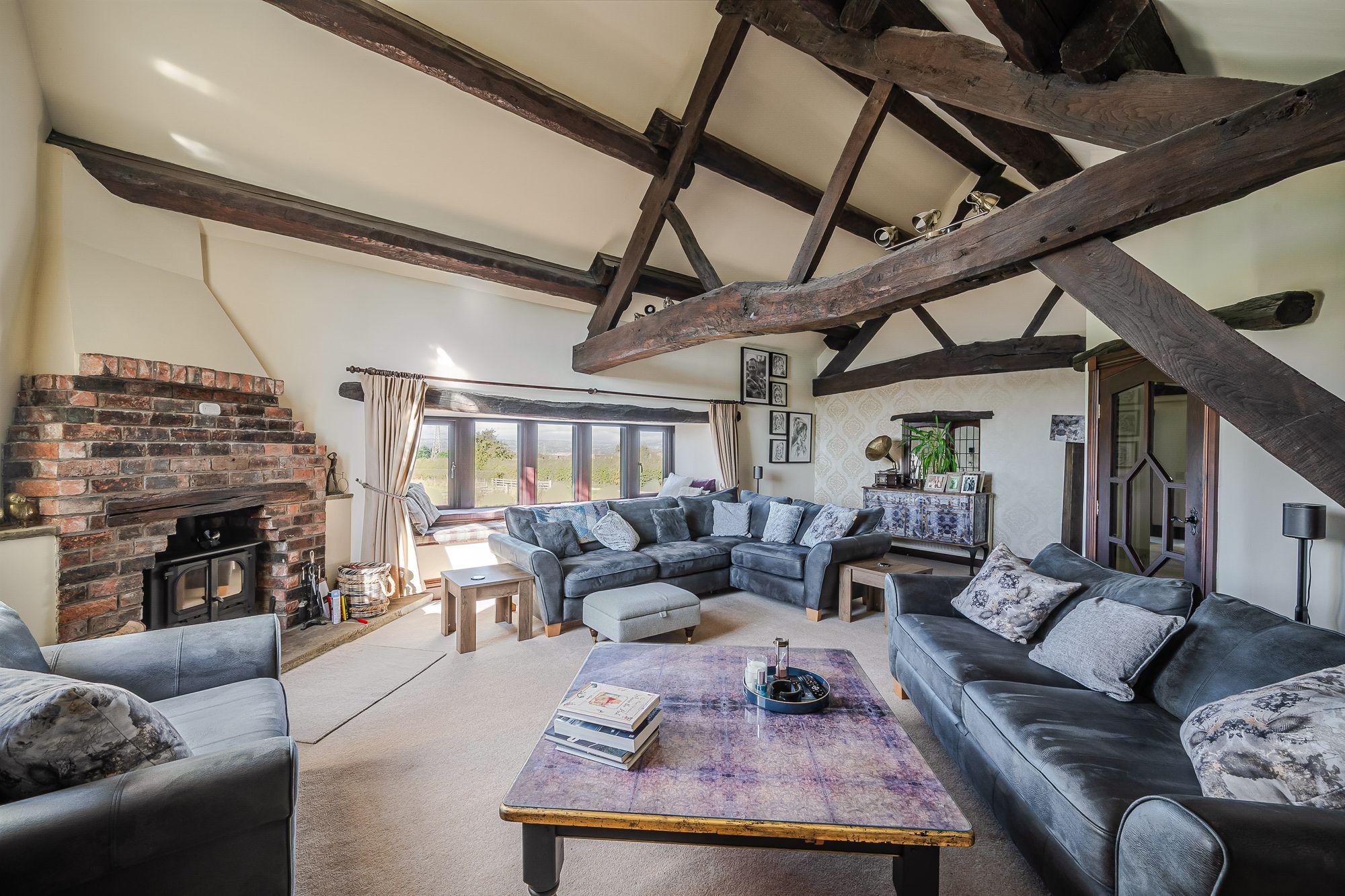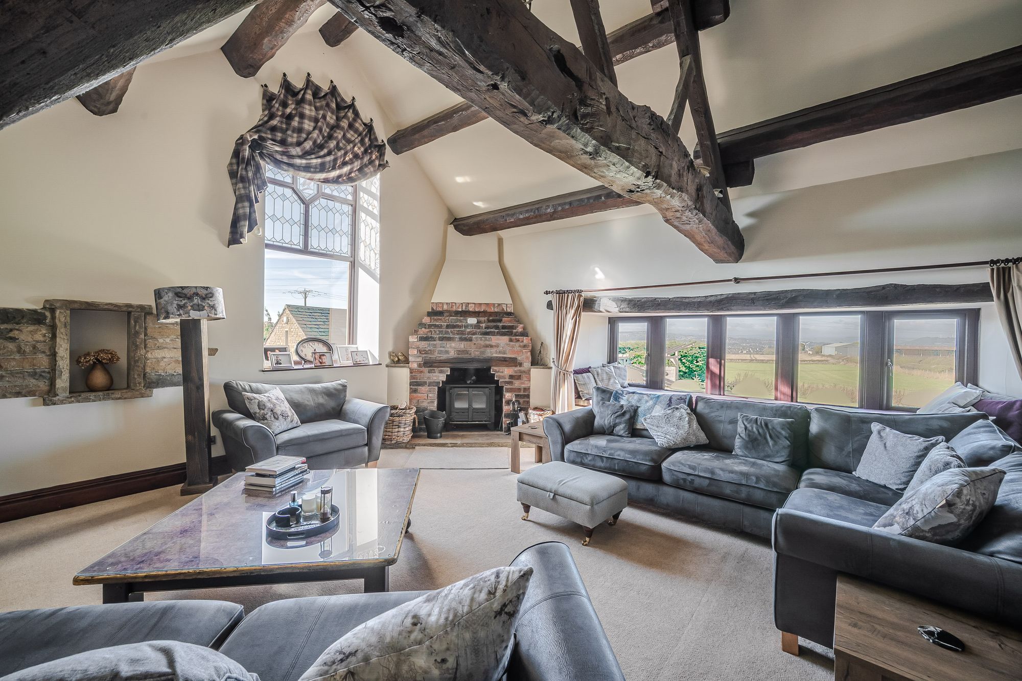 Sitting RoomThe lounge enjoys a great deal of natural light, which cascades through the dual aspect windows with a fabulous part stained glass and leaded detailed arch window to the side elevation and a five bank of double glazed mullioned windows with window seat beneath to the front elevation. The window to the front enjoys superb panoramic open aspect views across open countryside and with far reaching views into the distance. There is a superb vaulted ceiling with timber beams on display, two radiators and two doors which enclose useful under eaves storage areas. The focal point of the living room is the beautiful brick, vintage fireplace with a twin door cast iron multi-fuel burning stove which is set upon a raised stone heart. Additionally, the room features a beautiful partly exposed stone recess and surround, a further double glazed window to the side elevation and a bay window to the side of the lounge providing borrowed light to and from the landing.