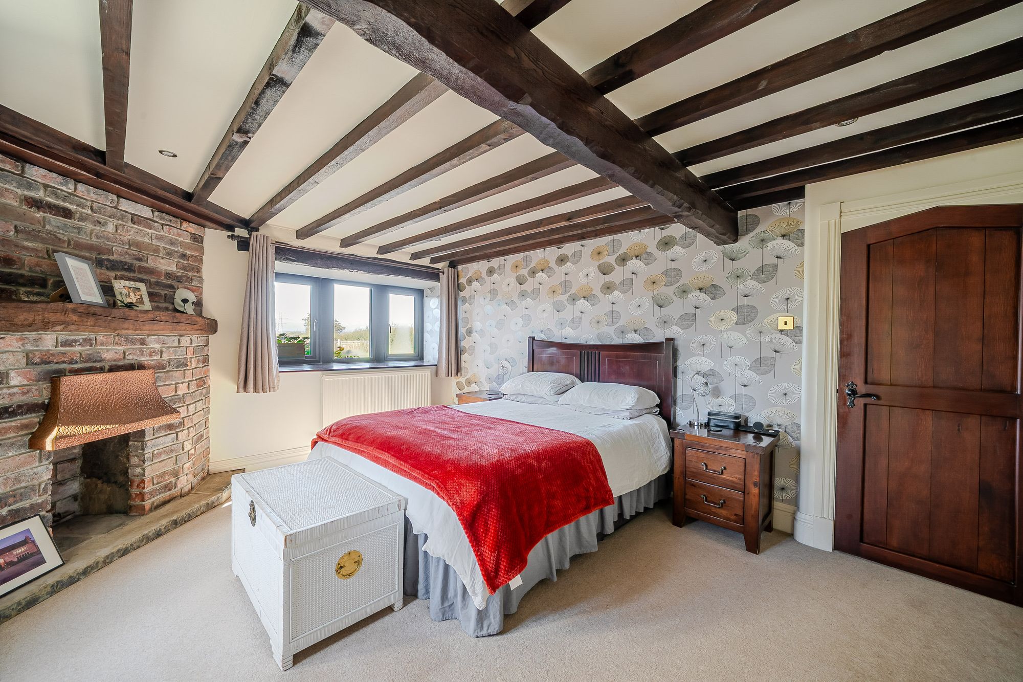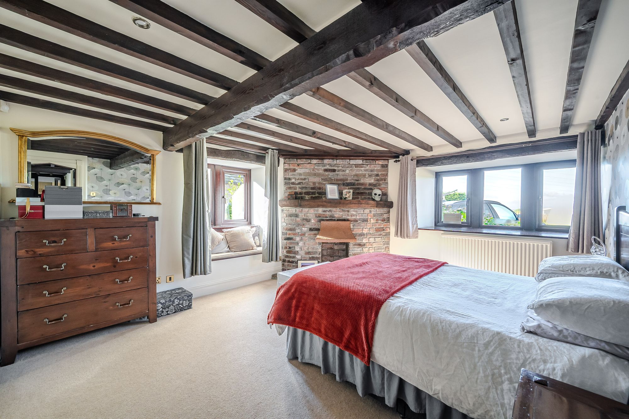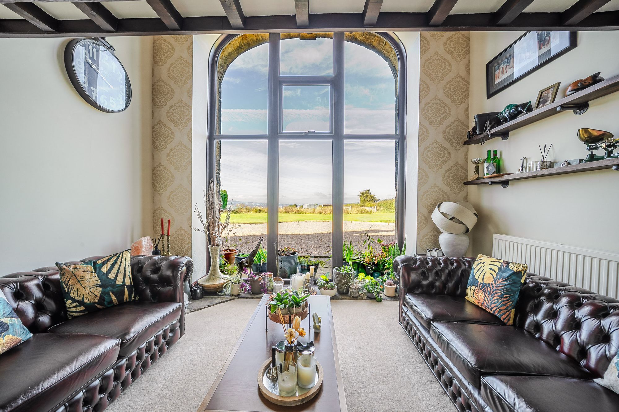 Sitting RoomThe lounge enjoys a great deal of natural light, which cascades through the dual aspect windows with a fabulous part stained glass and leaded detailed arch window to the side elevation and a five bank of double glazed mullioned windows with window seat beneath to the front elevation. The window to the front enjoys superb panoramic open aspect views across open countryside and with far reaching views into the distance. There is a superb vaulted ceiling with timber beams on display, two radiators and two doors which enclose useful under eaves storage areas. The focal point of the living room is the beautiful brick, vintage fireplace with a twin door cast iron multi-fuel burning stove which is set upon a raised stone heart. Additionally, the room features a beautiful partly exposed stone recess and surround, a further double glazed window to the side elevation and a bay window to the side of the lounge providing borrowed light to and from the landing.