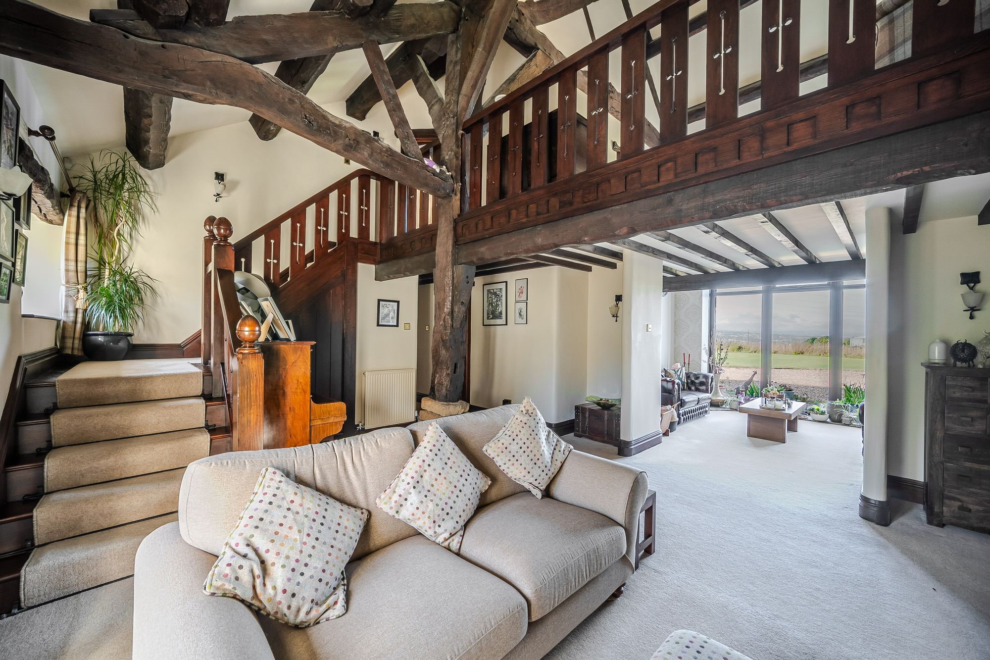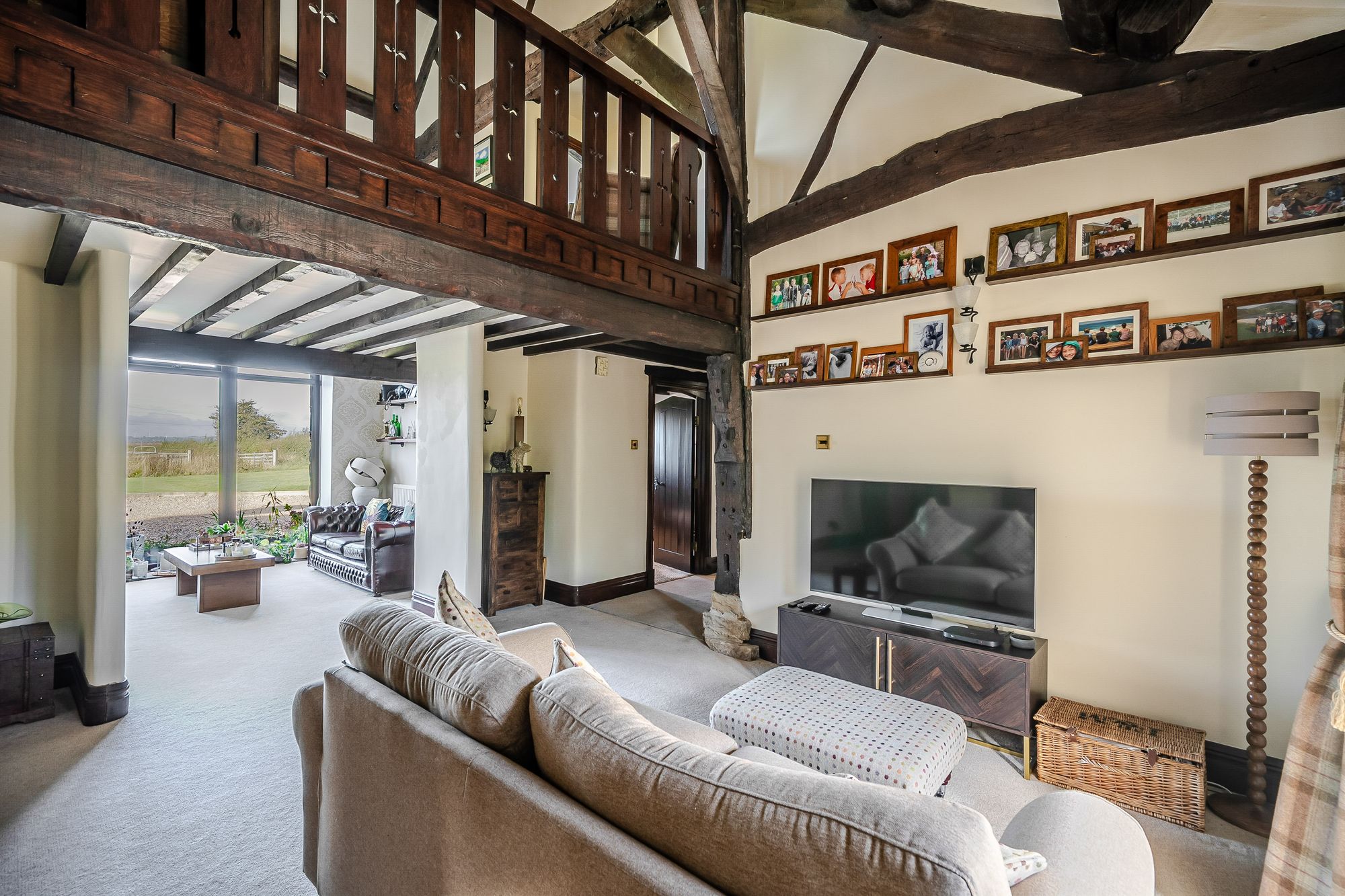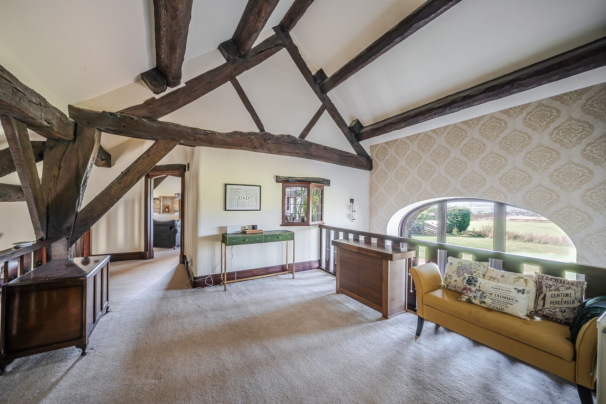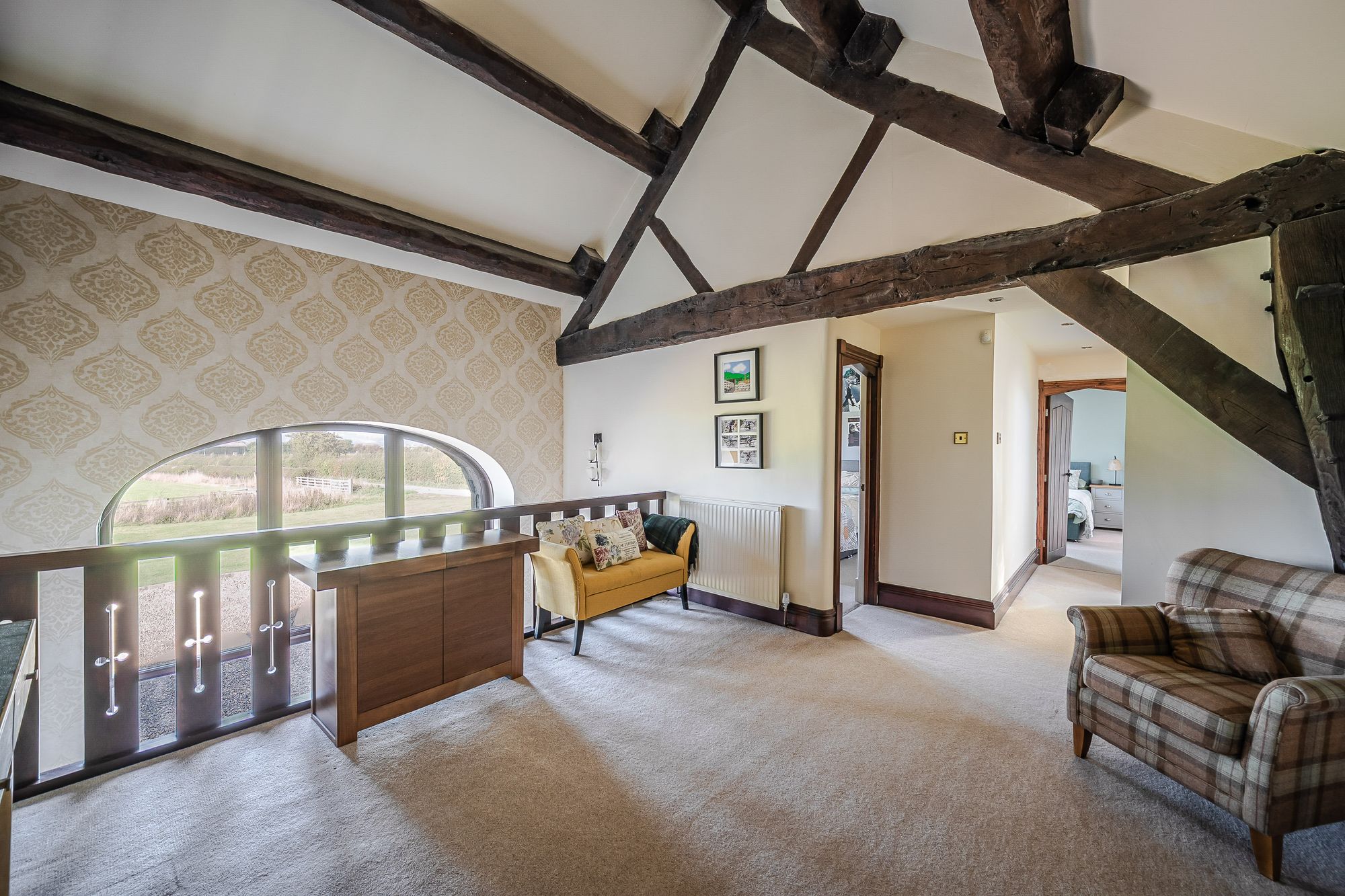 Galleried LandingThe galleried landing again offers a multitude of potential uses such as a home office, study area or recreational space. It benefits from natural light cascading through the barn arch to the front elevation and the integral bay window providing borrowed light to and from the lounge. There are fabulous exposed timber beams and trusses on display, a radiator, various wall light points and doors providing access to further bedroom accommodation and the lounge.