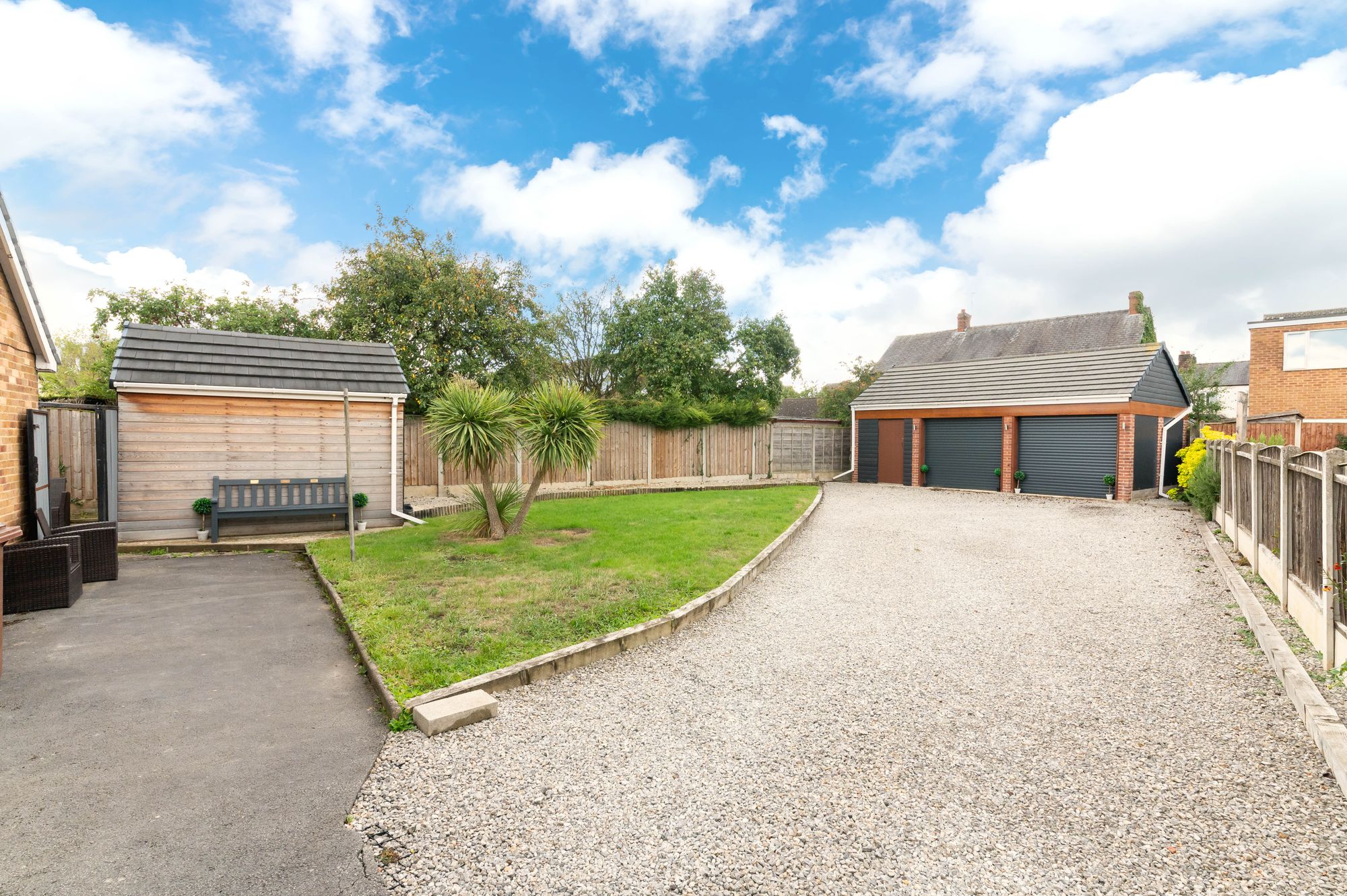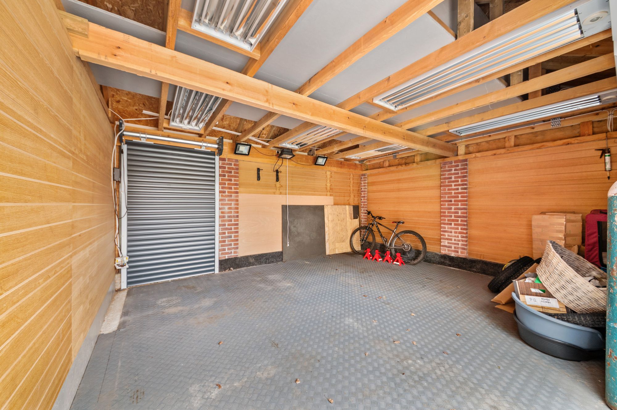 The double garage features two electric remote controlled roller shutter doors, internally there is ample lighting and PowerPoints with various LED security lights in situ there is part boarding providing additional storage in the rafters and there is an additional roller shutter door to the rear of the garage which provides access to the rear elevation of the building.
