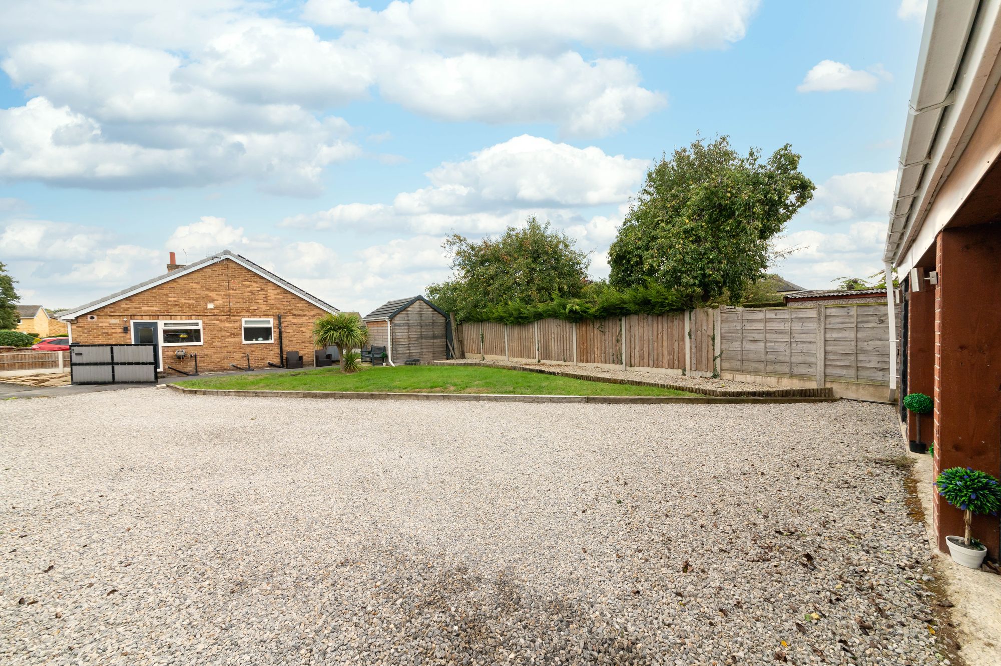 The shed features lighting and power, fitted shelving and a worksurface which has space and provisions for a washing machine and tumble dryer. There is additional storage available in the rafters with loose boarding.