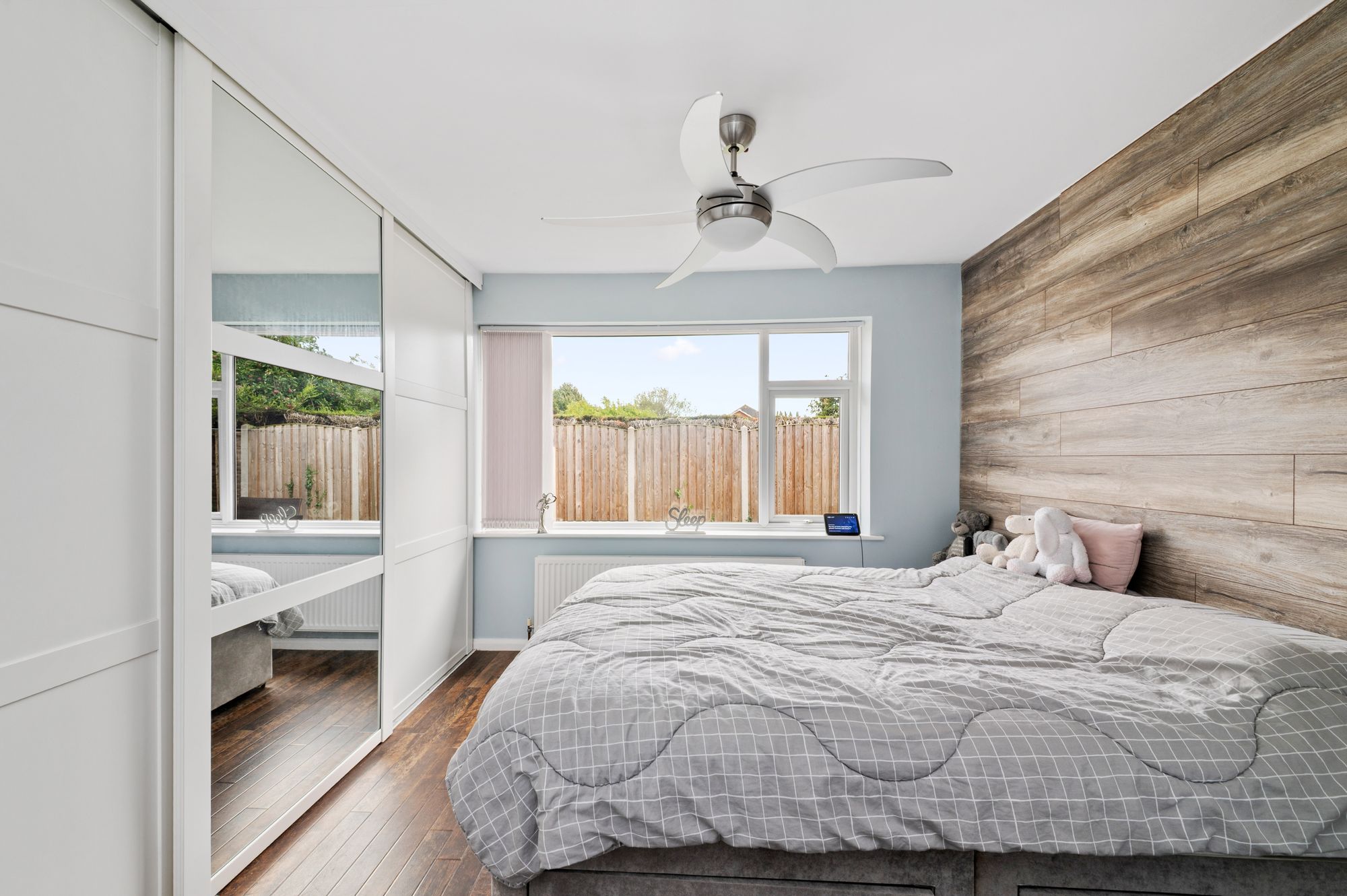 Bedroom one is a generously proportioned, light and airy double bedroom which has ample space for free standing furniture. There is high quality flooring, a bank of double glazed windows to the rear elevation with pleasant views to the gardens, a ceiling light point, a radiator and bank of wall to wall fitted wardrobes which have sliding doors, hanging rails and shelving in situ.