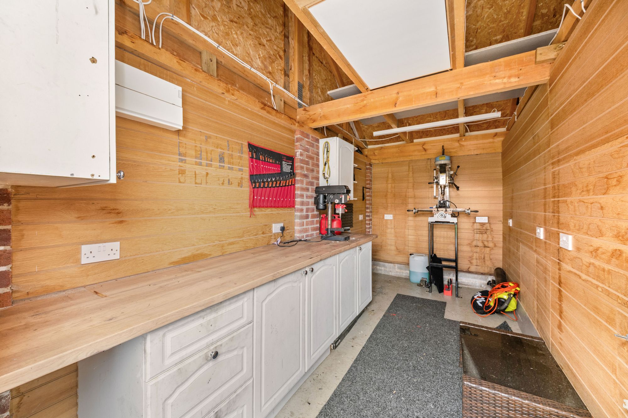 The workshop has a separate pedestrian access door there is lighting and power in situ and a loft hatch with drop down ladder that provides access to the storage area in the rafters. The workshop has ample plug points in situ an also features fitted wall and base units with a work surface over providing a great deal of storage.