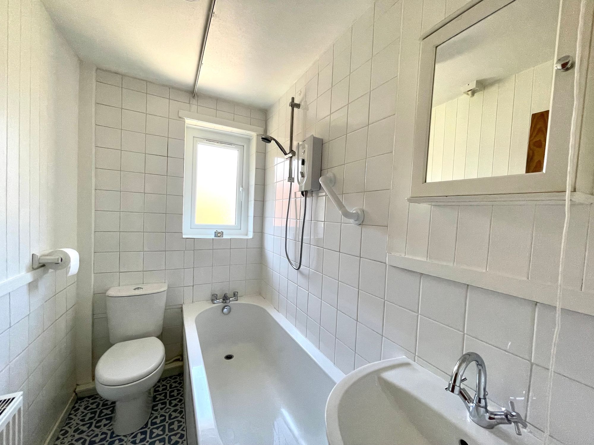 With a ceiling light point, frosted uPVC double glazed window, part tiled walls which are floor to ceiling in sections, central heating radiator, tile effect flooring and fitted with a suite comprising timber panelled bath with Bristan electric shower fitting over, pedestal wash basin with chrome mixer tap and low flush w.c.