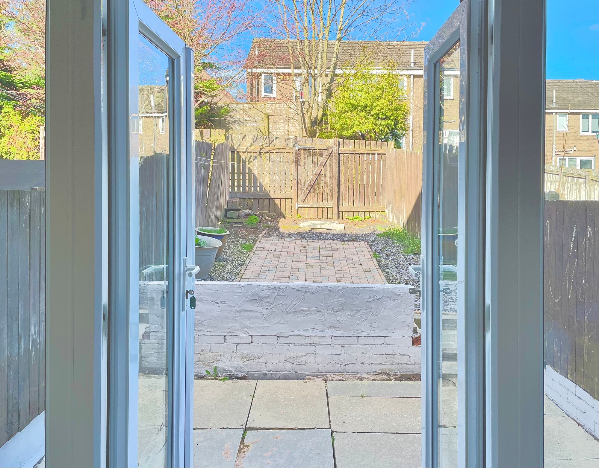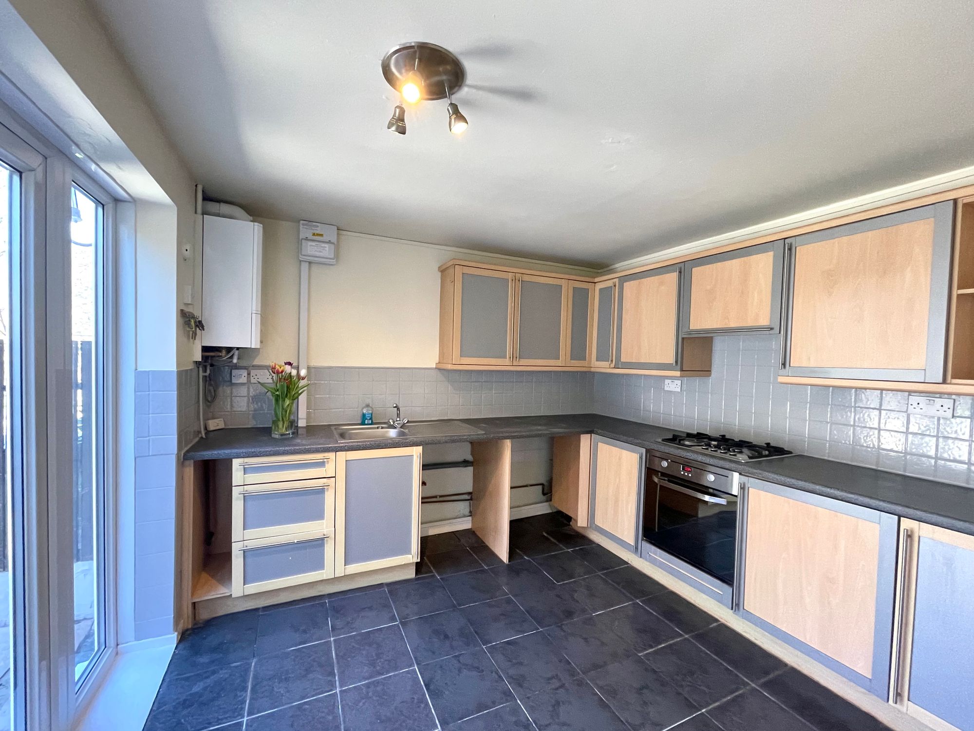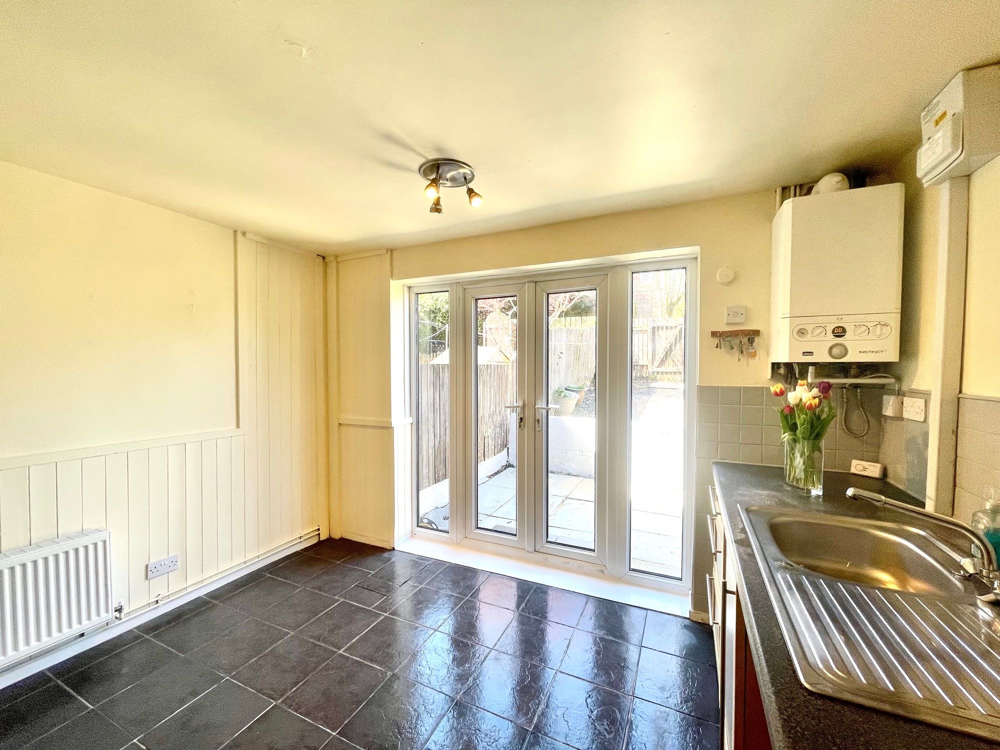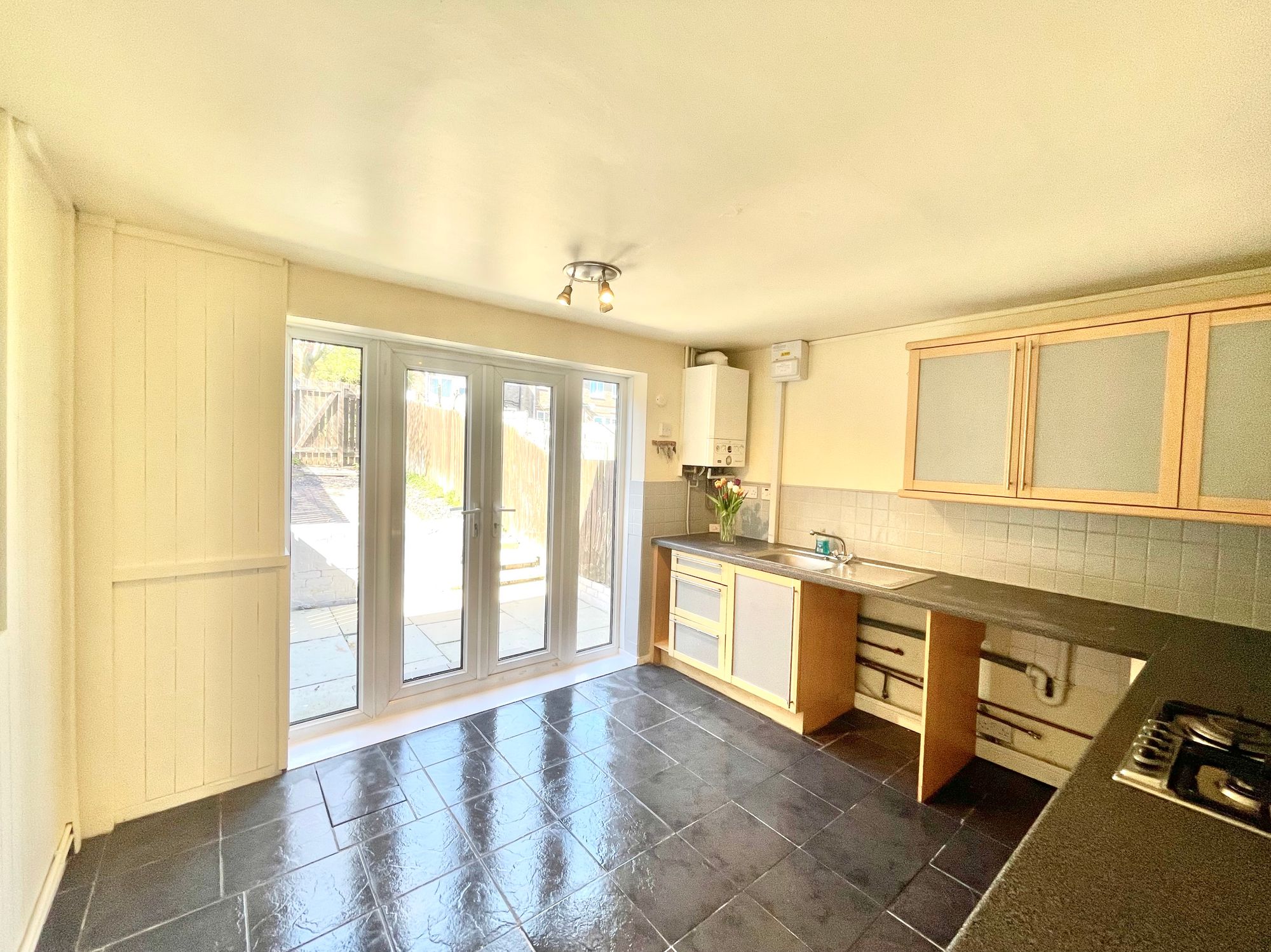 With a uPVC double glazed windows with central French doors once again providing plenty of natural light and looking out over the rear garden. There is a ceiling light point, central heating radiator, tiled floor and fitted with a range of base and wall cupboards, drawers, overlying worktops with tiled splashbacks, inset single drainer stainless steel sink with chrome mixer tap, four ring stainless steel gas hob with extractor hood over and stainless steel electric and smoked glass fan assisted oven beneath, there is under counter space for washing machine and fridge and a wall mounted ideal gas fired central heating boiler.