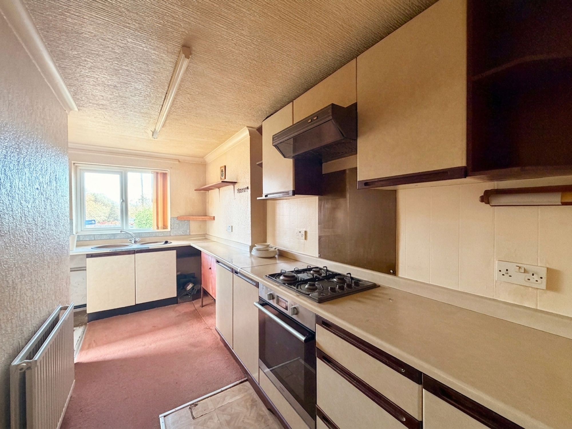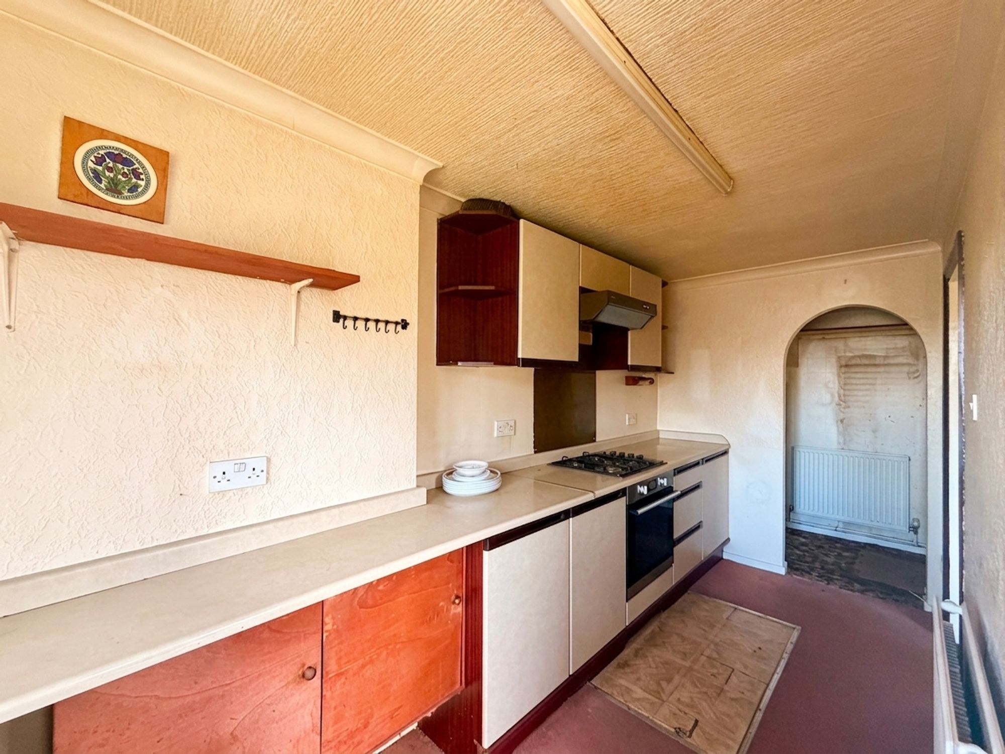 KITCHENFeaturing a range of wall and base units in a shaker style with laminate worktops. There is an integrated cooker with a four-burner gas hob and extractor hood over. The room benefits from a ceiling light, central heating radiator, and plumbing for a washing machine. An archway leads to an open understairs area providing space for a fridge and freezer. Natural light is gained via a uPVC double glazed window to the front, and a door gives access through to the living/dining room.