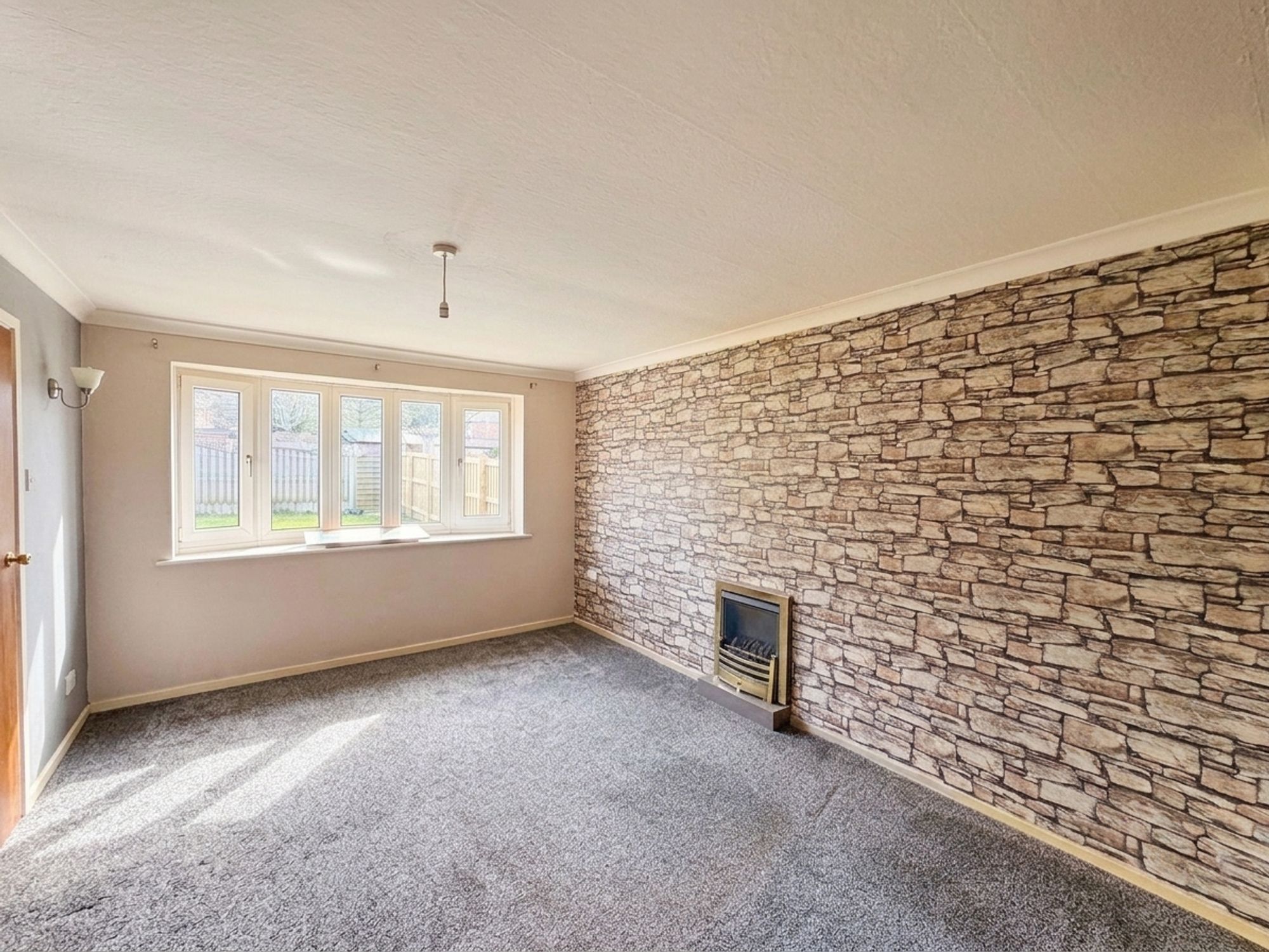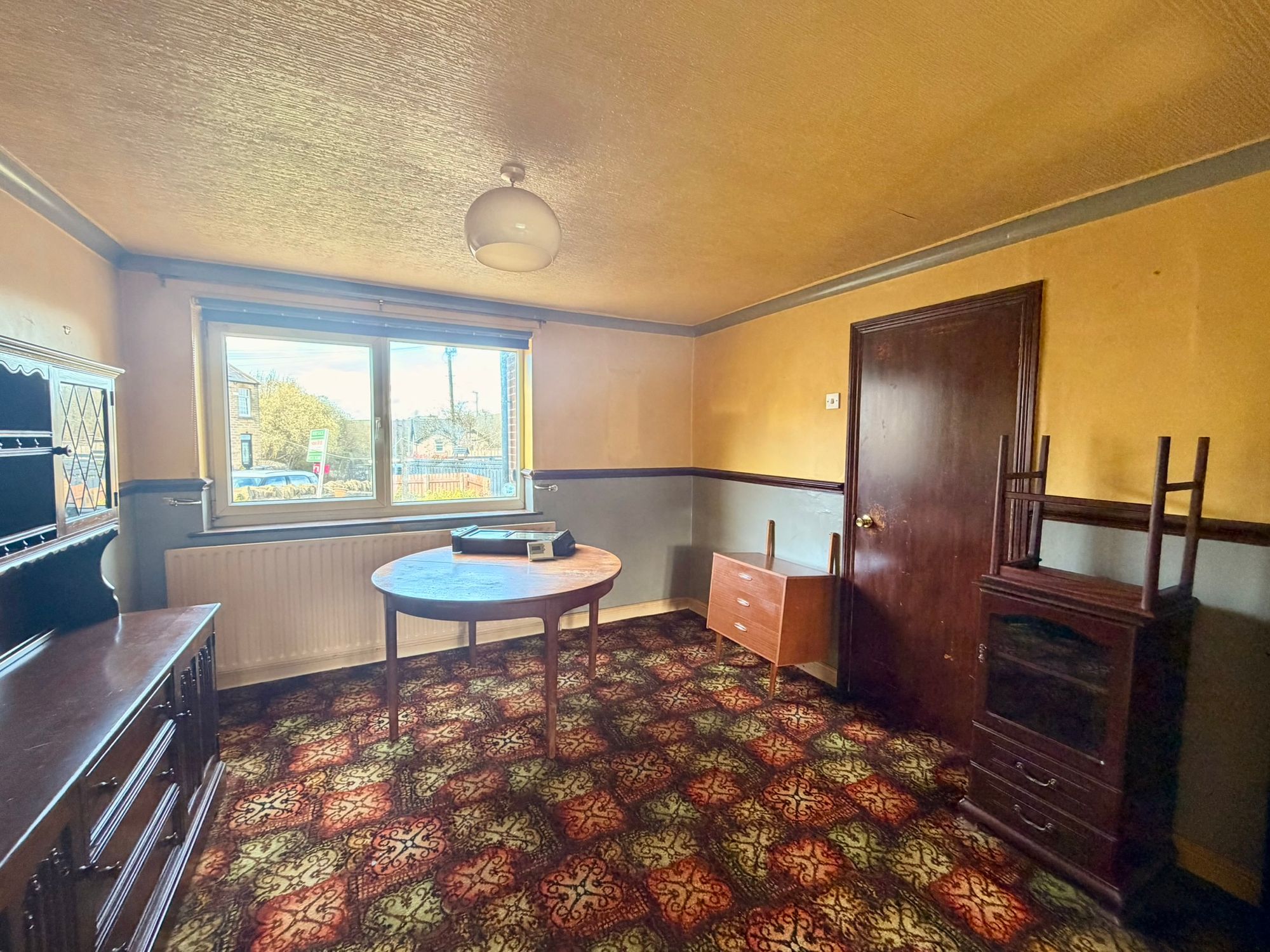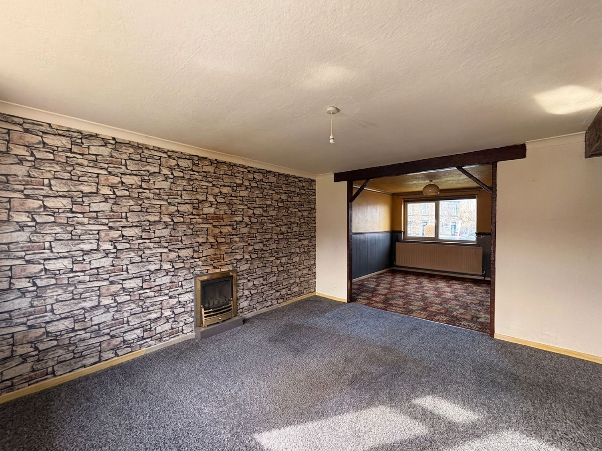 LIVING / DINING ROOMA spacious main reception room with a dual-aspect outlook, offering ample space for both lounge furniture and a dining table and chairs. The dining area benefits from a ceiling light and a uPVC double glazed window to the front. The lounge area features a further ceiling light, exposed beams, and a uPVC multi-panel bay window to the rear. A door provides access to the rear entrance hall.