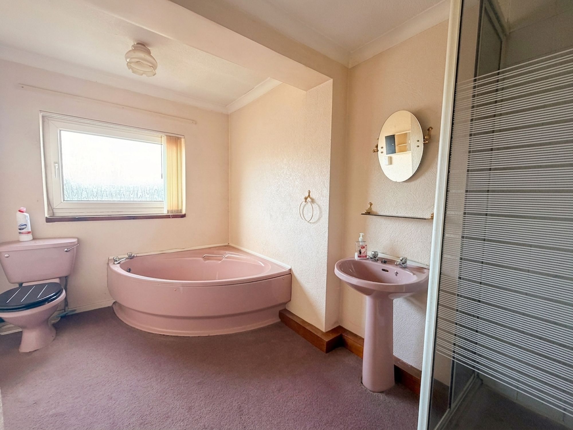 BATHROOMComprising a four-piece suite in the form of a close-coupled W.C., pedestal wash basin with mixer taps over, a corner bath with mixer taps and a separate shower cubicle with shower attachement.