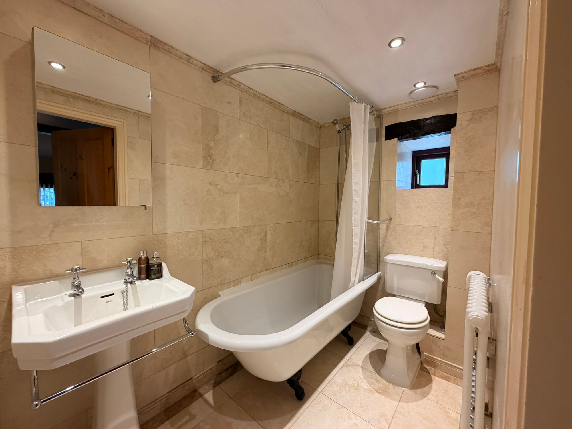 HOUSE BATHROOMComprising a three-piece white suite in the form of a close-coupled W.C., pedestal wash basin with chrome mixer tap over, and a bathtub with mains-fed shower and attachment. There are inset ceiling spotlights, full tiling to both walls and floor, and an obscured solid wood triple glazed window to the rear elevation.