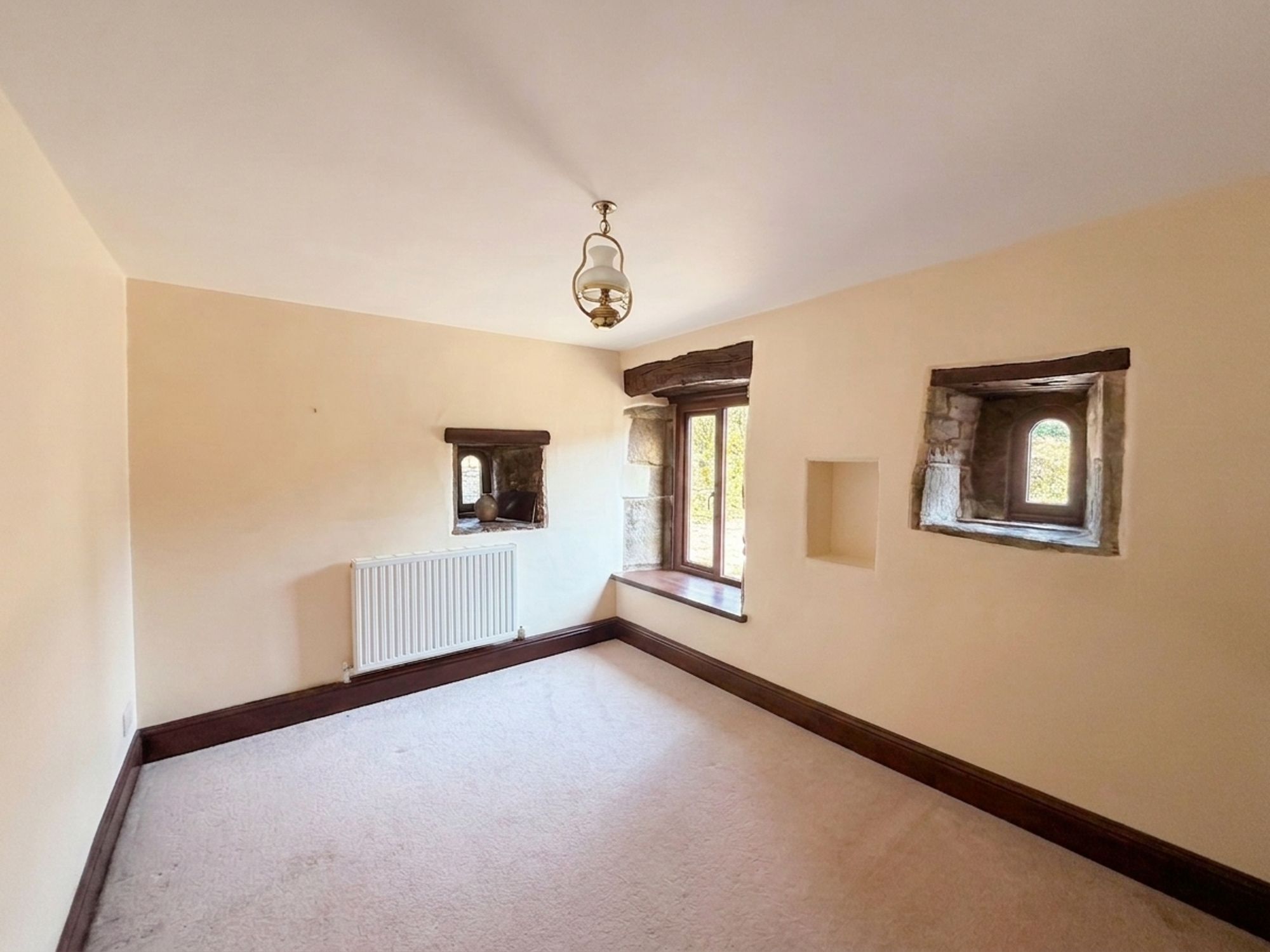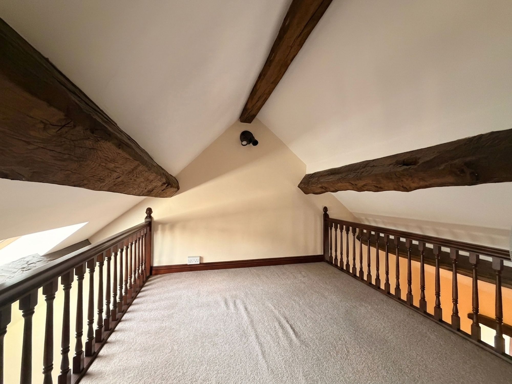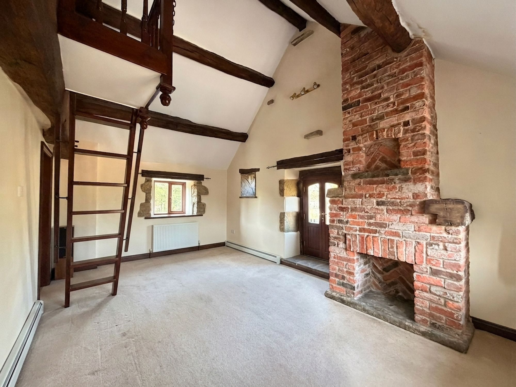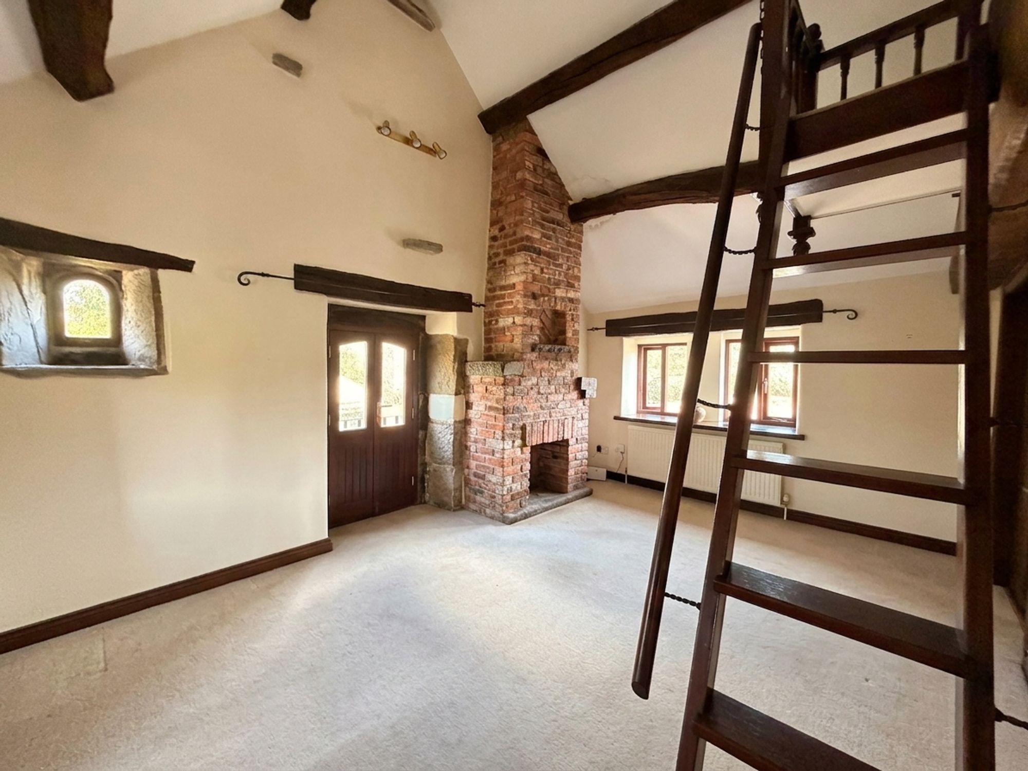 LIVING ROOMA fantastic main reception room, with the principal focal point being an exposed brick-built fireplace with chimney breast, creating a warm and characterful feature. There are two solid wood triple glazed windows to both the front and rear elevations, allowing an abundance of natural light, as well as a Juliette balcony accessed via a wood and glazed door. The room also benefits from exposed stonework throughout and a high vaulted ceiling, enhancing the sense of space and character. Access is provided to a mezzanine level via a wooden staircase; while head height is restricted in places, it offers a useful additional space currently used as a study.