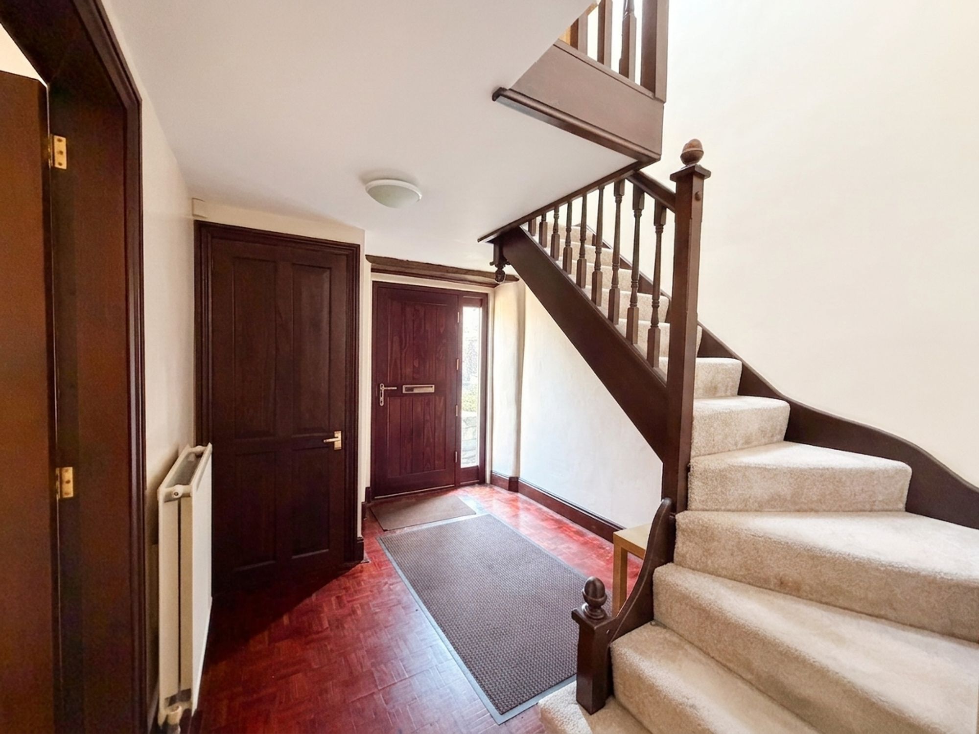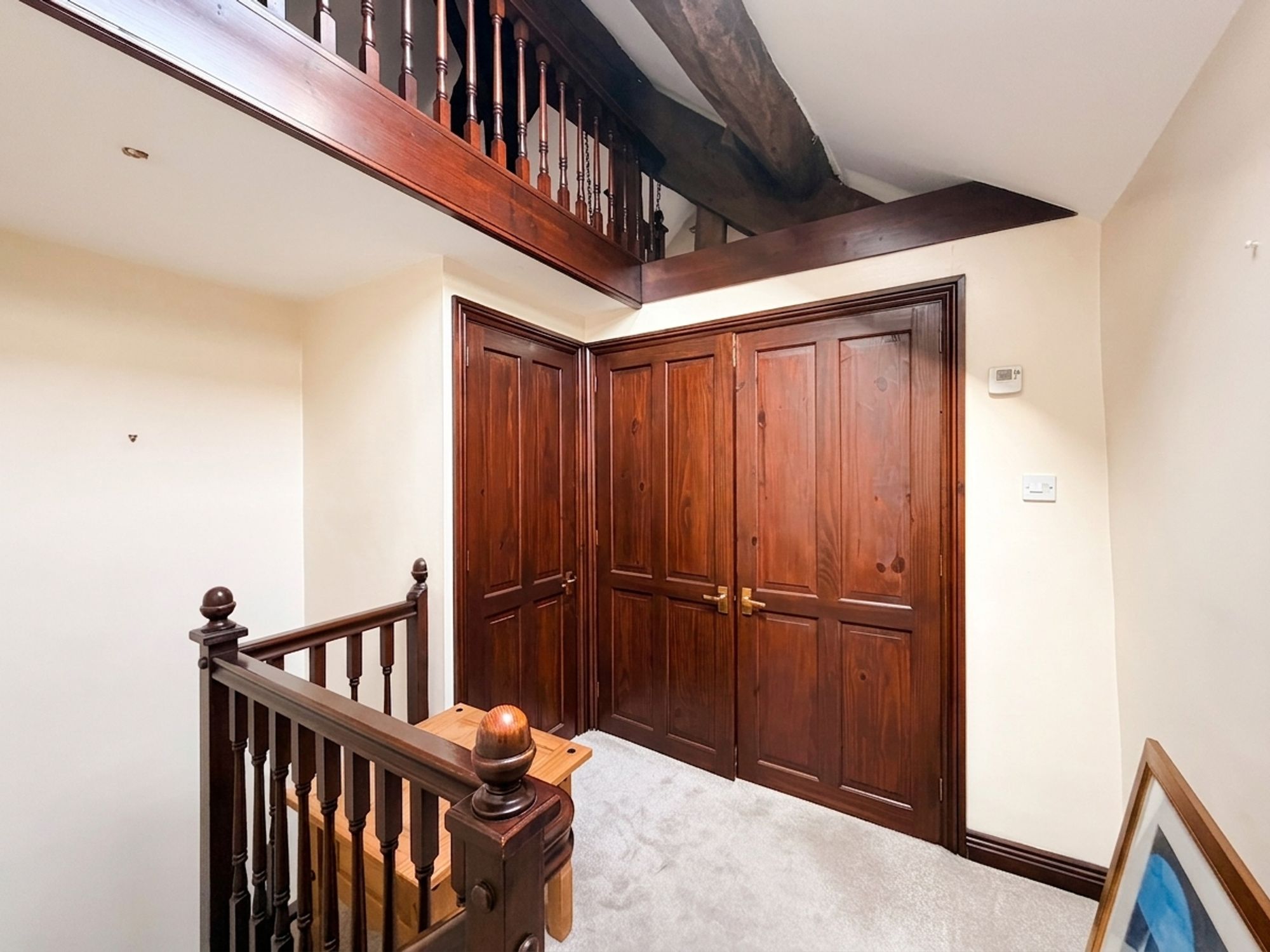 FIRST FLOOR LANDINGFrom the entrance hall, a staircase with solid wood spindle balustrade rises and turns to the first-floor landing, featuring a ceiling light and access to a useful storage cupboard, along with access to the living room via twin solid wood doors.