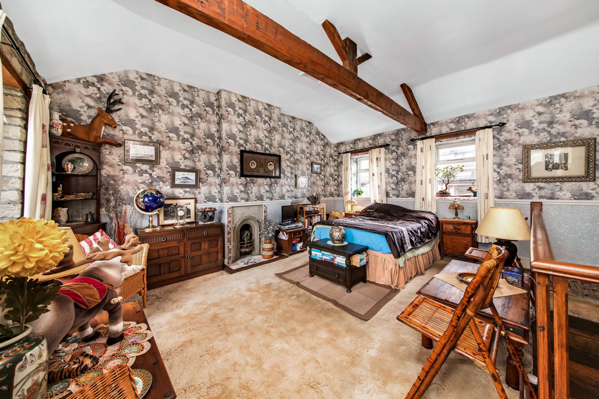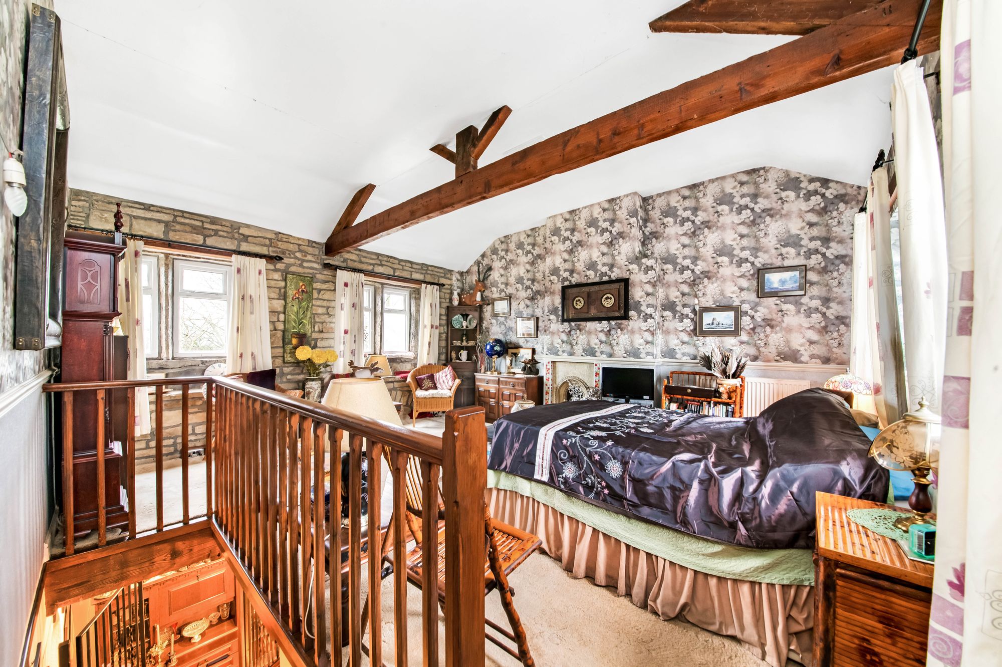 Taking the staircase from the dining room, you reach the principal bedroom suite. This very large, double bedroom features a wall of exposed stone and a bank of lovely mullioned windows to the front, a high ceiling line with beams and timbers on display, two further windows to the rear, a dado rail, and a period-style fireplace.