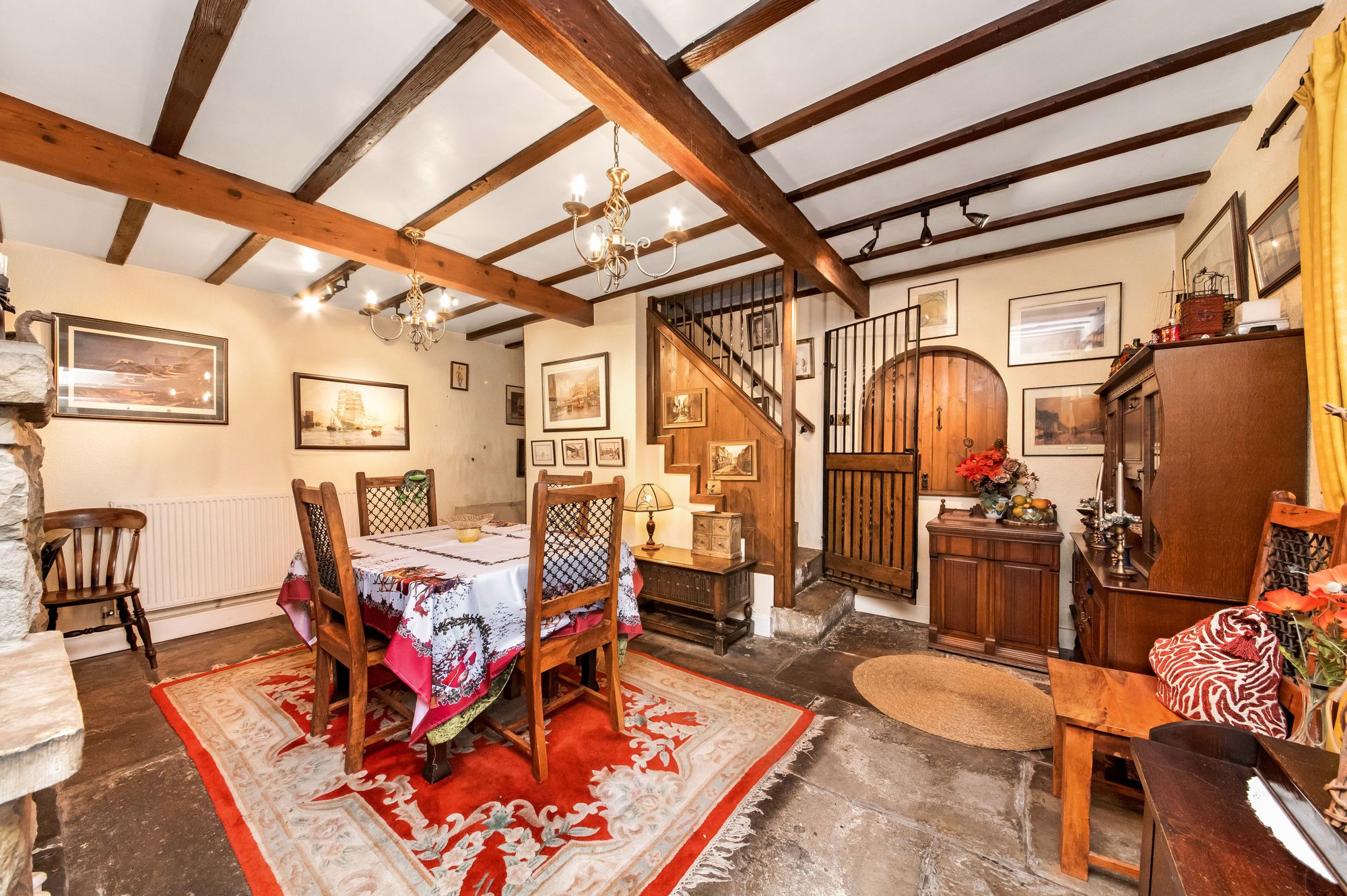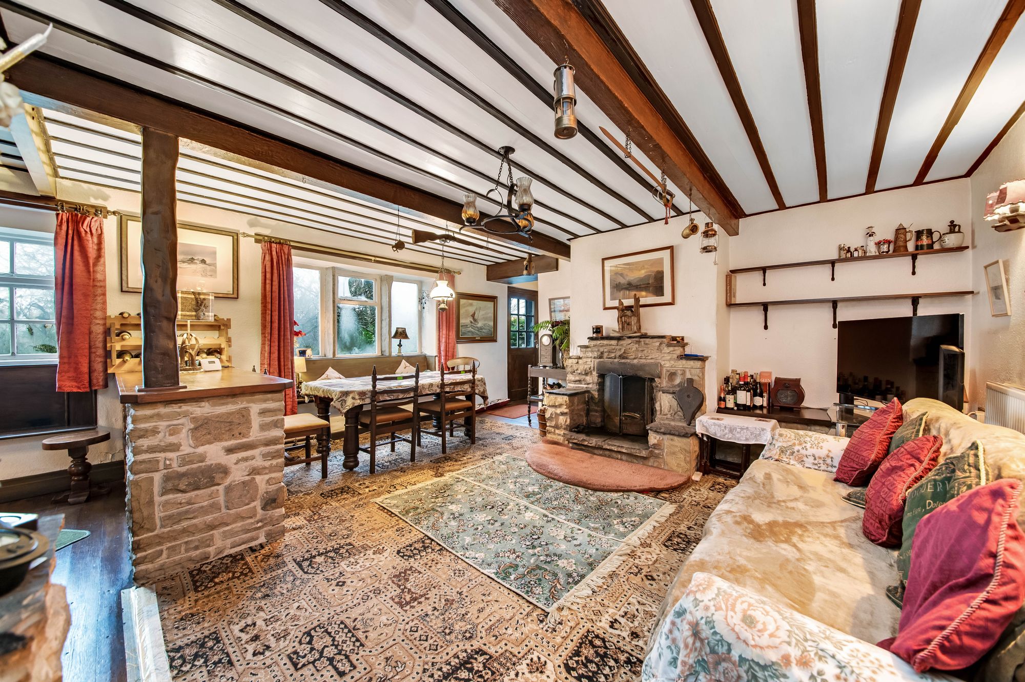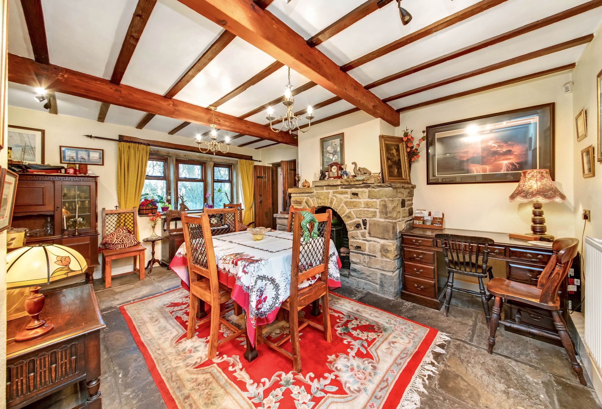 The dining room is an extremely characterful room featuring stone flagged flooring, beams and timbers to the ceiling, a stone fireplace with raised stone hearth, and stone mantel. There is a lovely view out over the gardens courtesy of windows with stone mullions. The dining room also features a serving facility through to the kitchen and a staircase which leads up to the first floor. Timber doors then lead through to the living room.