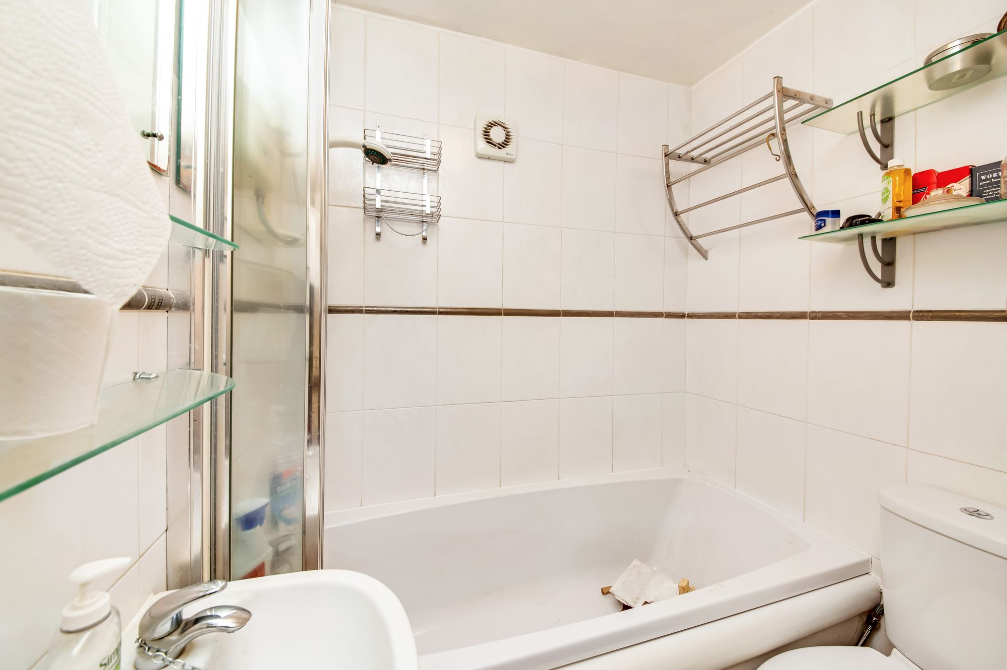 The bathroom is fitted with a three-piece suite comprising a low-level WC, a pedestal wash hand basin, and a bath with shower over. There is ceramic tiling, an extractor fan, and a cylinder airing cupboard.
