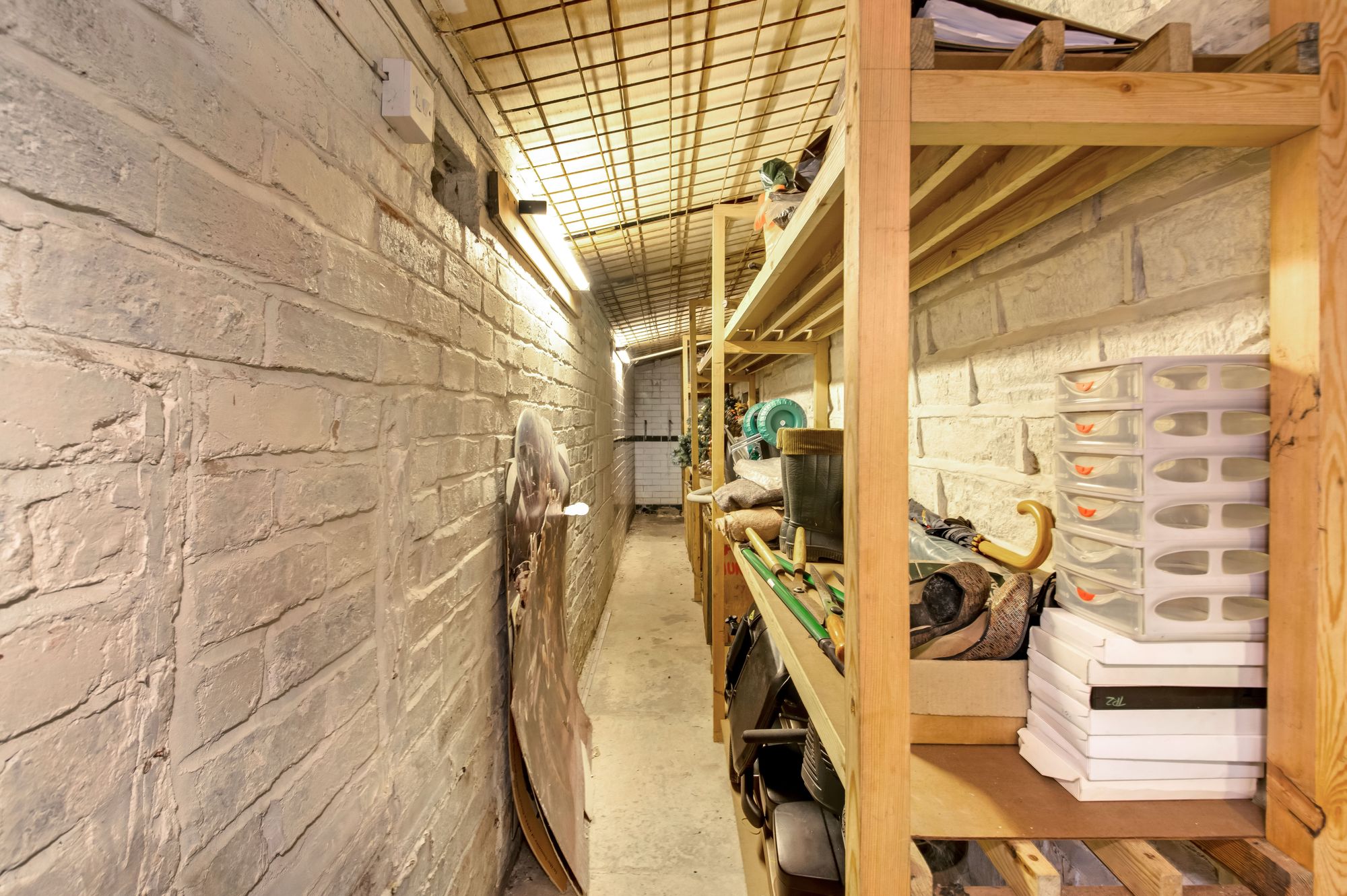 Off the kitchen is a utility room / pantry which features two windows to the lane side, an angled ceiling line, and quarry tiled flooring.