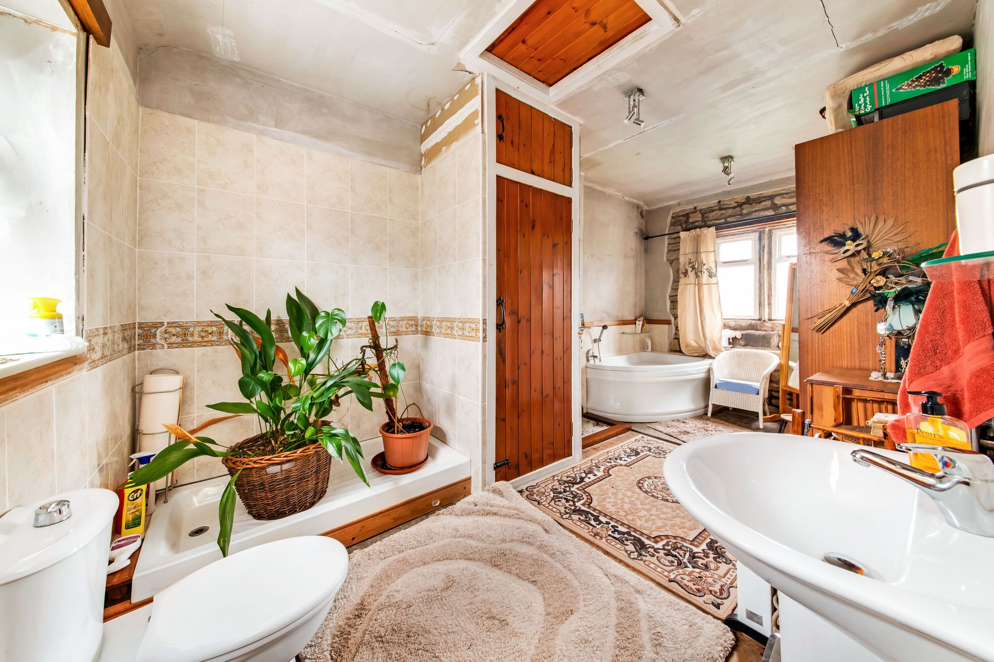 A doorway leads through from bedroom one in the en-suite, which is exceptionally large and fitted with a low-level WC, a pedestal wash hand basin, a bath, and space for a shower (a shower tray has already been fitted). There is a period-style fireplace, twin windows with stone mullions to the front, exposed stonework, and a further obscure glazed window to the rear.