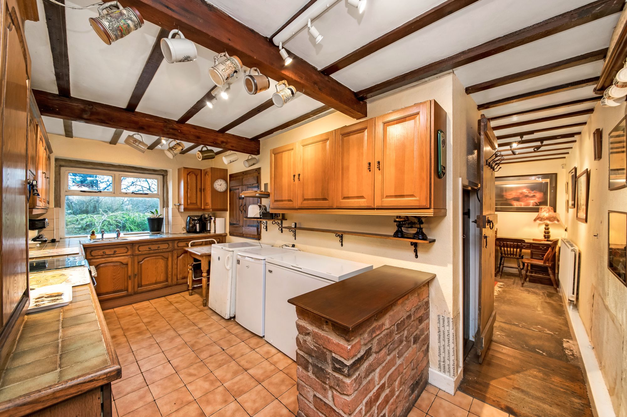 Enter into the property via a four-panel timber door which leads into the kitchen. The kitchen is of a good size and boasts a lovely view over the property's delightful gardens courtesy of a well-proportioned window. There are beams and timberwork to the ceiling, a range of units to the high and low levels, tiled working surfaces with tiled splashback, an inset stainless-steel sink unit, a cooker point with extractor fan over, and a cupboard which is home to the gas-fired central heating boiler.