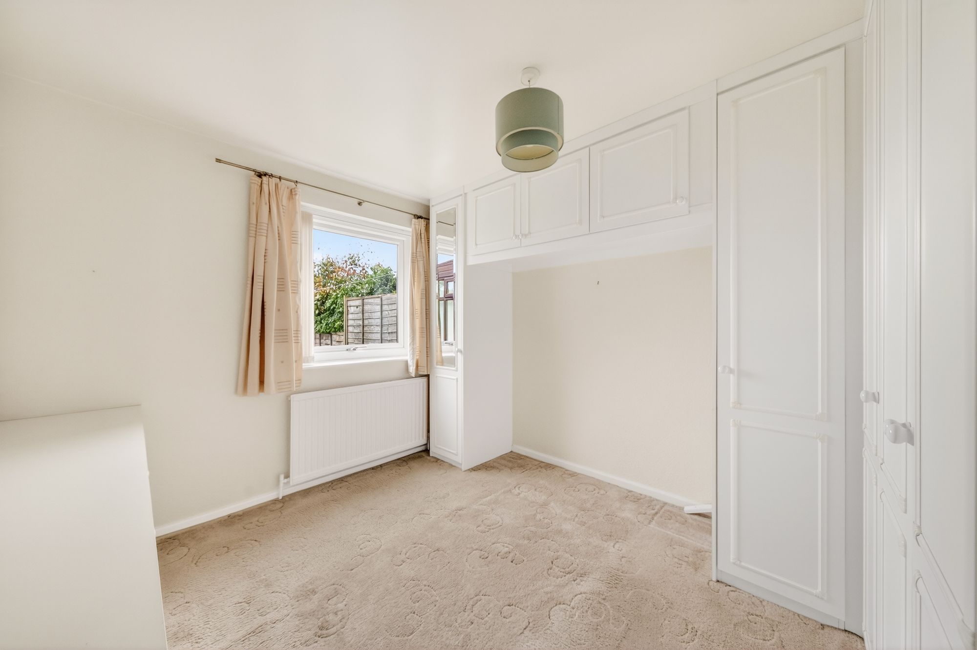 Bedroom one is a light and airy double bedroom which benefits from an array of fitted furniture, including floor-to-ceiling fitted wardrobes with overhead cabinets and a bank of fitted base units with drawer units above. There is a ceiling light point, a radiator, and a double-glazed window to the rear elevation with pleasant views onto the gardens.