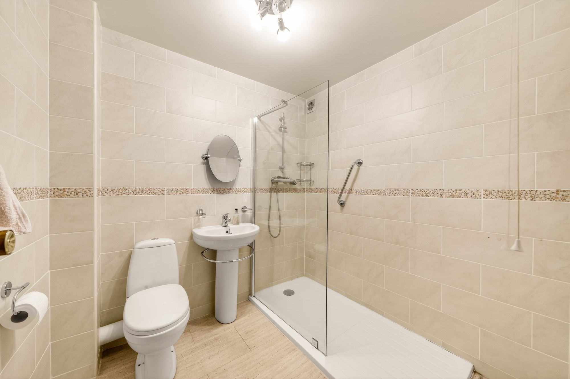The shower room features a modern, contemporary three-piece suite which comprises a fixed-frame shower with a glazed shower screen, a pedestal wash hand basin with a chrome mixer tap and chrome towel rail, and a low-level WC with a push-button flush. There is vinyl tiled flooring, tiling to the walls, a ceiling light point, a chrome ladder-style radiator, and an extractor fan.