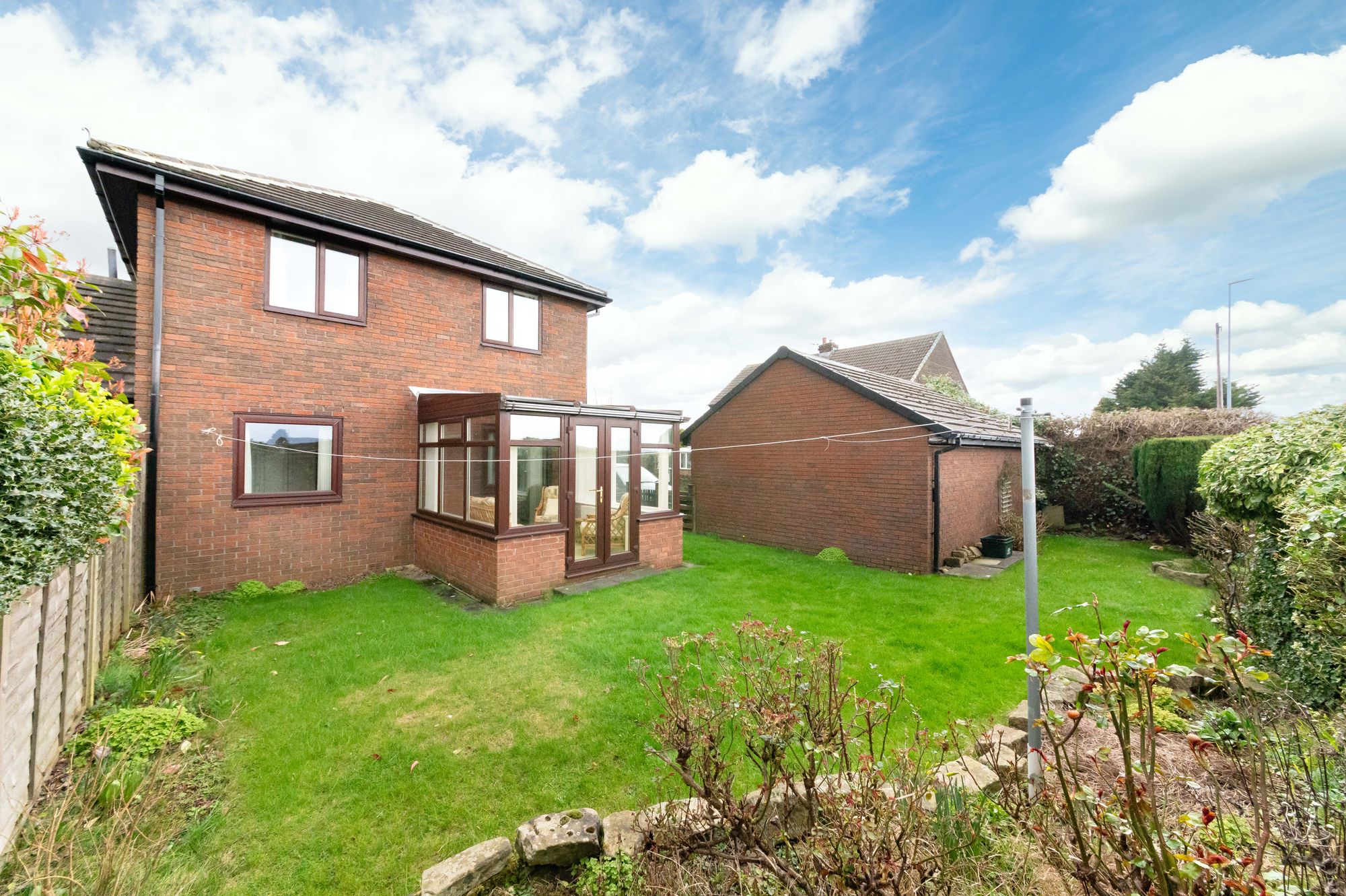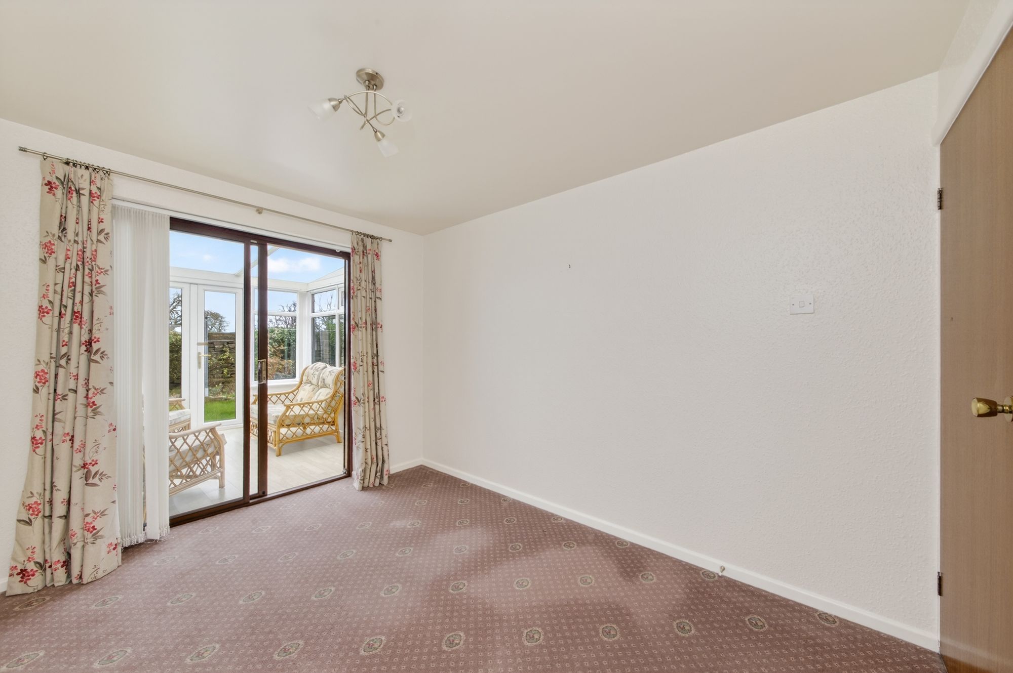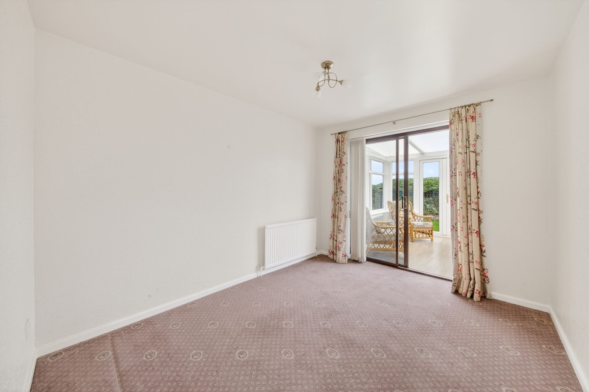 Bedroom two could be utilised as a formal dining room or a home office, or it can accommodate a double bed with space for freestanding furniture. There is a ceiling light point, a radiator, and double-glazed sliding patio doors to the rear elevation which give access to the conservatory.
