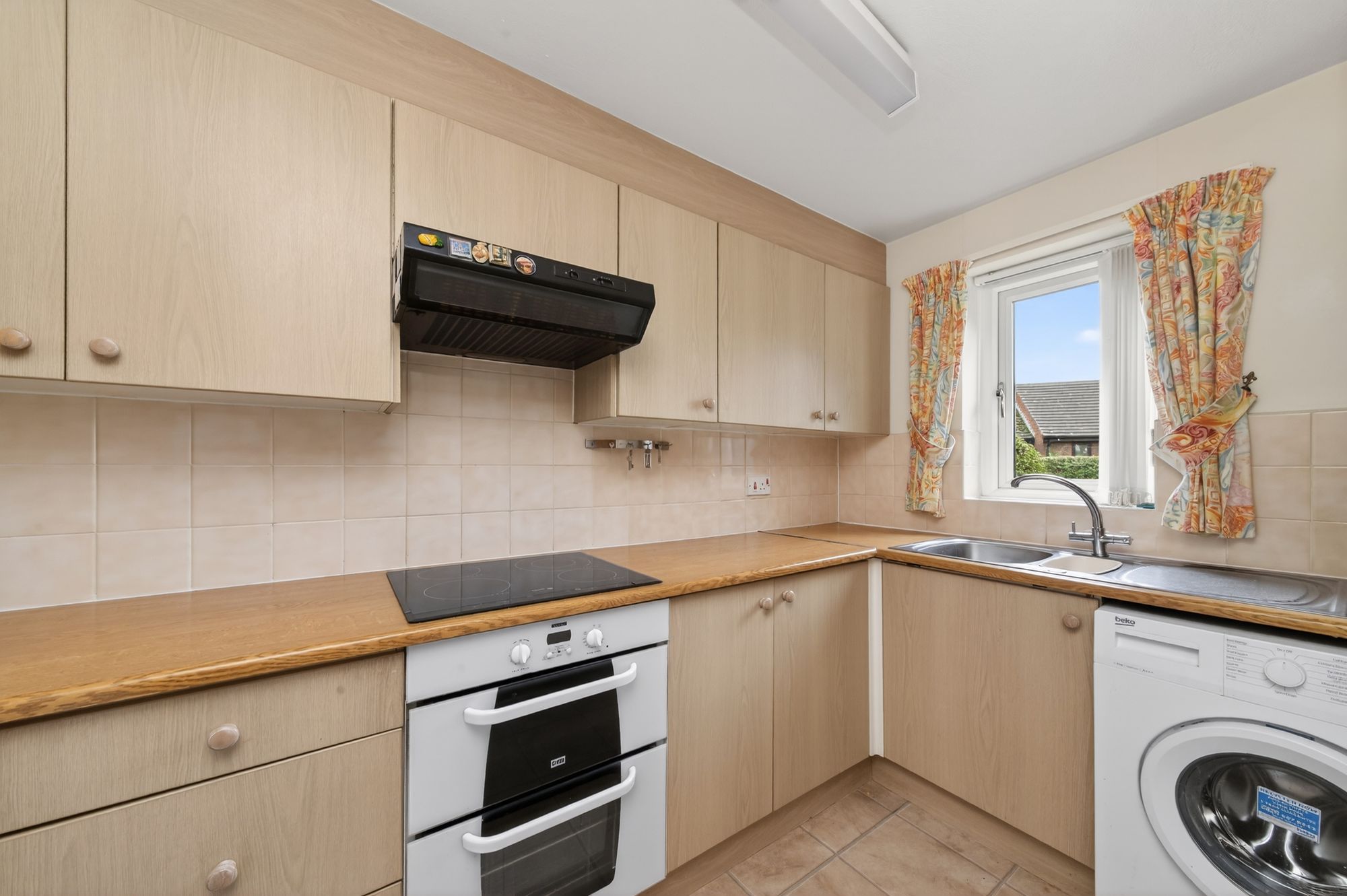The kitchen features a range of fitted wall and base units with rolled-edge worksurfaces over, incorporating a one-and-a-half-bowl stainless steel sink and drainer unit with a chrome mixer tap. There is a double-glazed window to the front elevation with a tiled sill, a fluorescent tube light point, a radiator, and LVT flooring. The kitchen is equipped with built-in appliances including a four-ring ceramic hob with a cooker hood over, a built-in double oven, and space for a tall-standing fridge and freezer unit. There is also display shelving, tiling to the splash areas, plumbing and provision for an automatic washing machine, and a tall pantry cupboard.