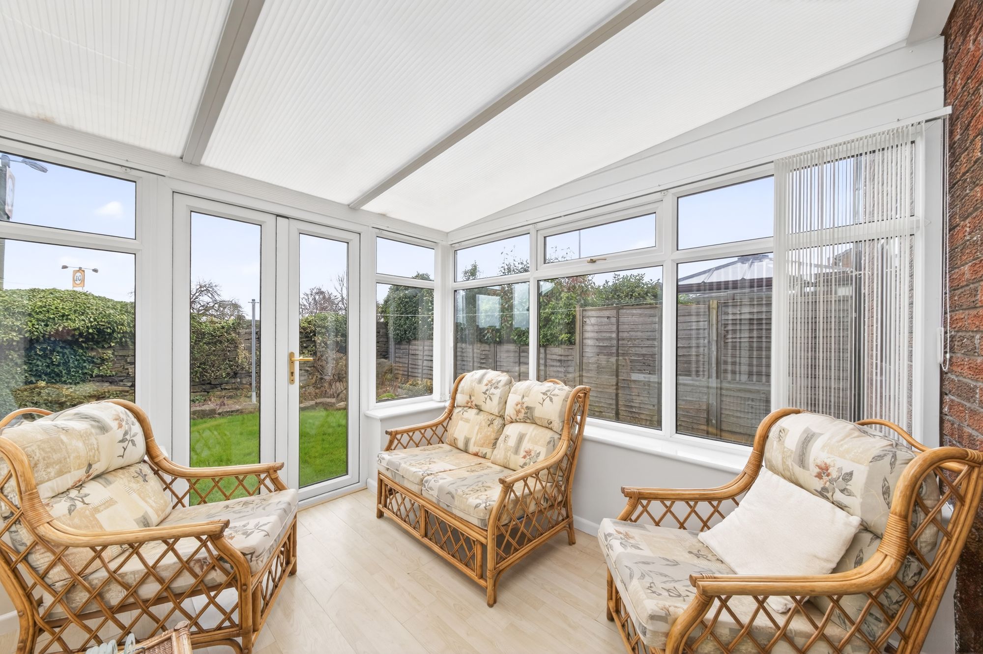 The conservatory enjoys a great deal of natural light cascading through the triple-aspect banks of double-glazed windows to either side elevation and the rear elevation. There is laminate flooring, a radiator, and double-glazed French doors to the rear elevation providing direct access to the gardens.