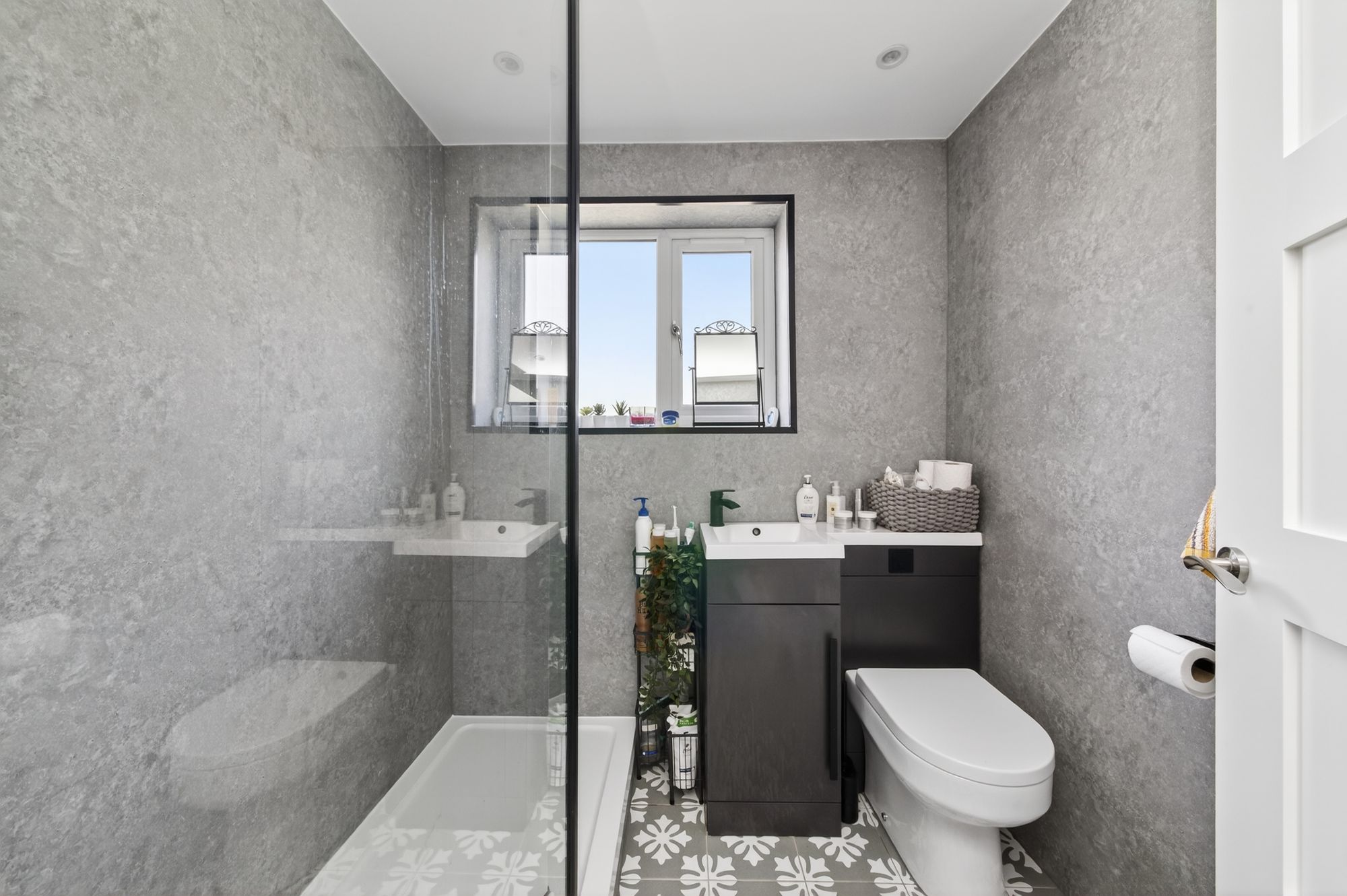 The shower room features a modern, contemporary three-piece suite which comprises of a fixed-frame walk-in shower with a thermostatic rainfall shower head and separate handheld attachment, a broad wash hand basin with a vanity drawer beneath and mixer tap over, and a low-level WC with concealed cistern and push-button flush. The room benefits from attractive tiled flooring, contrasting wall panelling, a ladder-style radiator, inset ceiling spotlights, and a bank of double-glazed windows to the rear elevation with obscure glazed inserts.