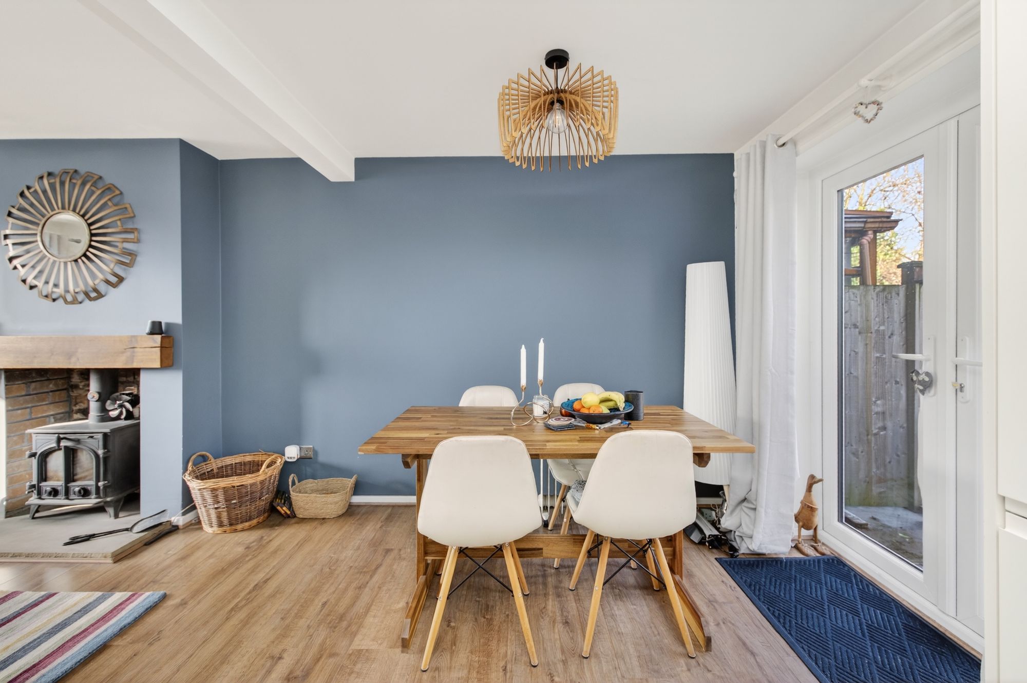 As the photography suggests, the lounge is a generously proportioned, light and airy reception room featuring a bank of double-glazed windows to the front elevation. The room benefits from high-quality flooring, a central ceiling light point, and a radiator. The focal point is the inset fireplace, housing a twin-door cast-iron multi-fuel burning stove set upon a raised stone hearth with a timber lintel above. The lounge area then seamlessly leads into the open-plan dining kitchen, where the high-quality flooring continues throughout.