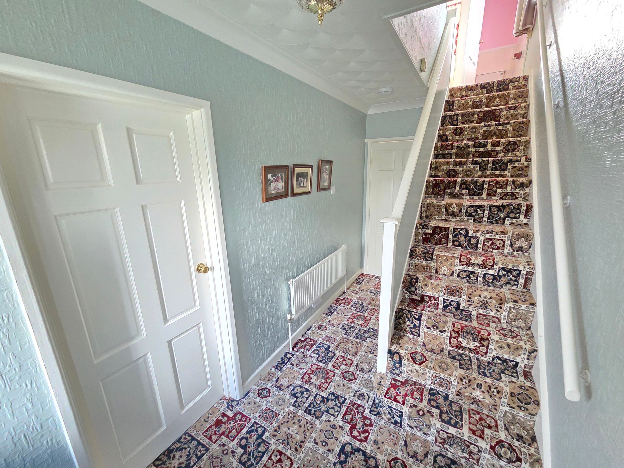 Entry is gained via composite door with inset opaque leaded glass panels with matching side glass panels into the entrance hall. The entrance hall has a ceiling light, coving to the ceiling, central heating radiator, and a staircase leading to the first-floor landing with under stairs storage.