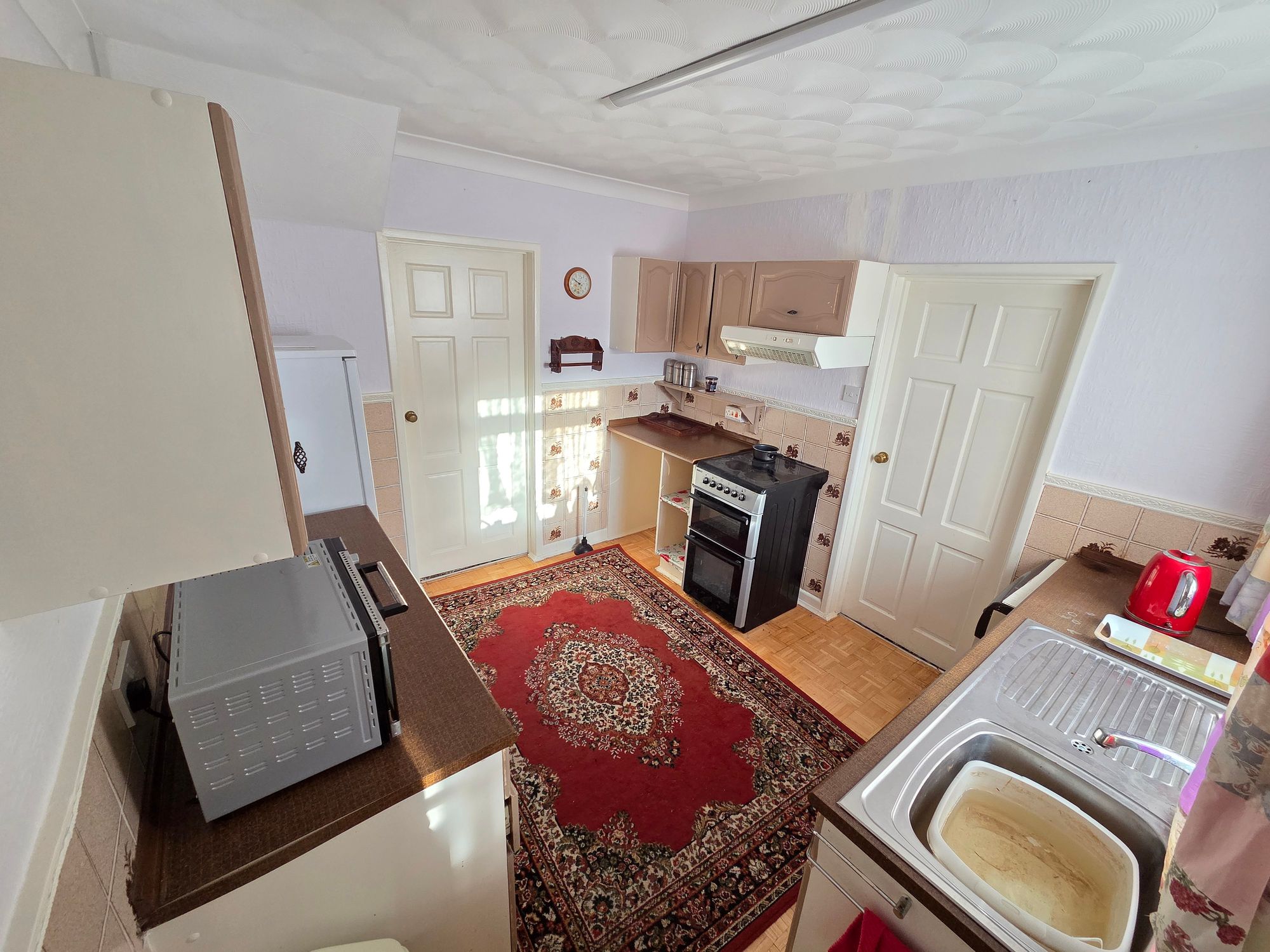 KITCHENThe kitchen has a range of wall base units and wall mounted units in a shaker style with contrasting laminate worktop over. There is space for freestanding appliances such as an oven, tumble dryer and fridge freezer. There is plumbing for a washing machine, stainless steel sink with stainless steel mixer tap over top, ceiling strip light, coving to the ceiling, uPVC double glazed window and access to the rear porch.