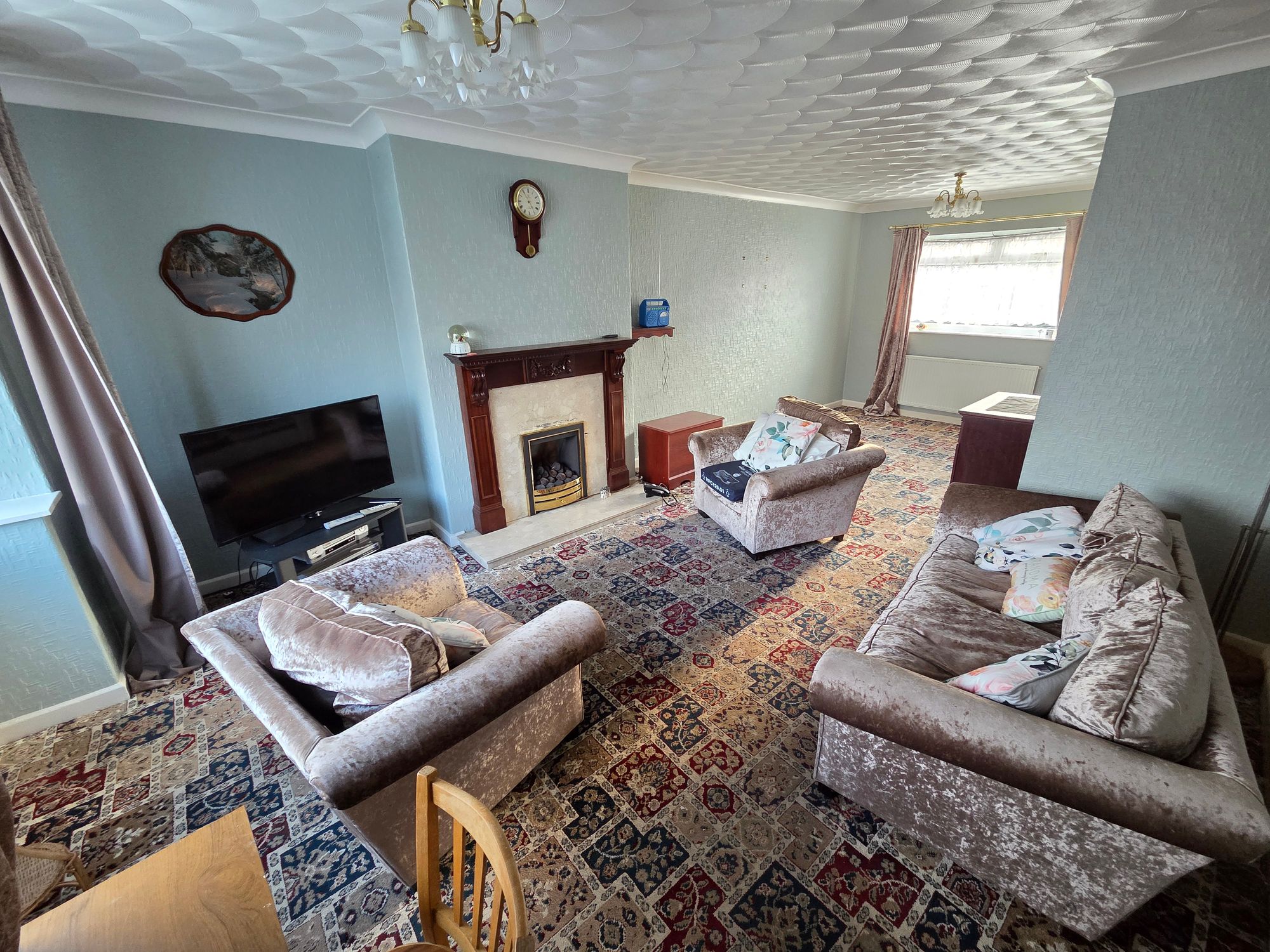 LIVING / DINING ROOMA well-proportioned front facing reception room with the main focal point of the room being a gas fireplace set within marble surround with marble hearth and wooden mantelpiece. There are two ceiling lights, coving to the ceiling, two central heating radiators and uPVC double glazed windows to the front and rear of the property.