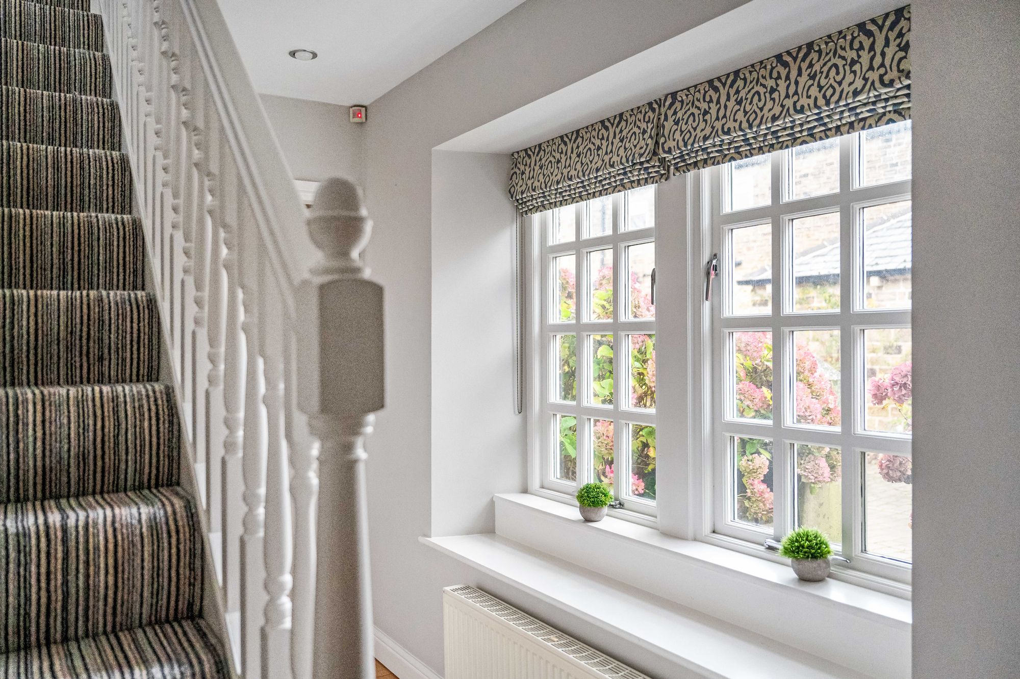 The first-floor landing, as the photographs demonstrate, is particularly well presented. It has wonderful beams and timbers on display and indeed the old iron wheel from the loading bay of the first floor from the property’s former usage. With spindle balustrading, this first floor landing has a window giving a pleasant outlook to the front and doorway leads to the property’s bedrooms and house bathroom.