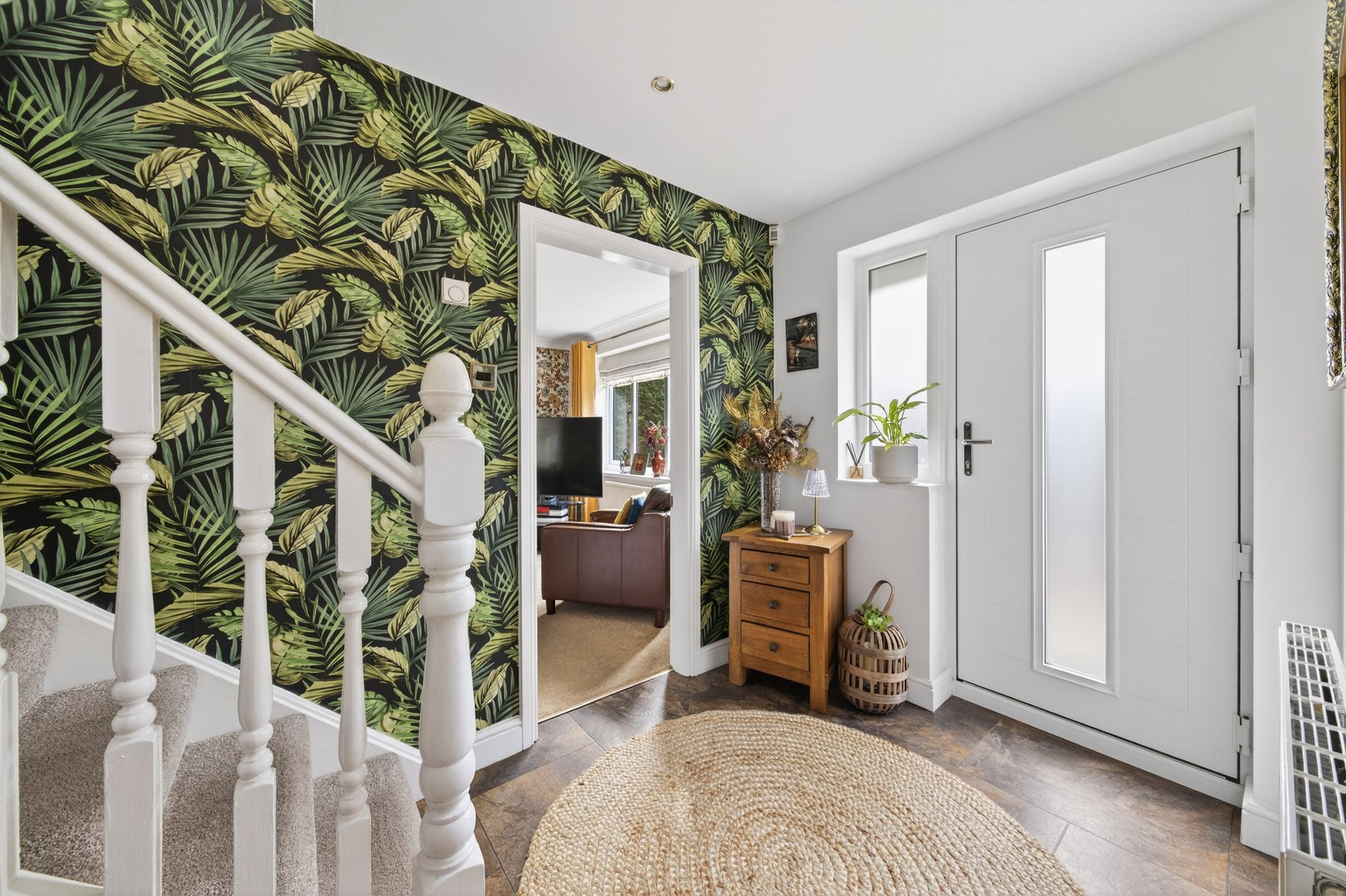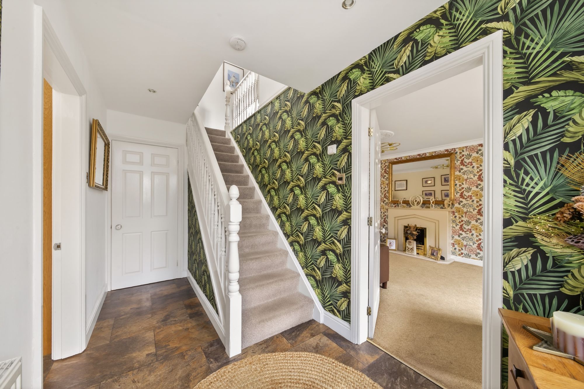 Entrance is gained via a composite door with obscured glazed panel and matching side screen, opening into an impressive reception hallway. A welcoming and well-appointed space, the hallway features inset ceiling spotlights, a central heating radiator, and stylish stone-effect Karndean flooring, which adds a contemporary and practical finish. A staircase rises to the first-floor landing, while the hallway itself provides a superb introduction to the home. From here, access is gained to the following rooms.