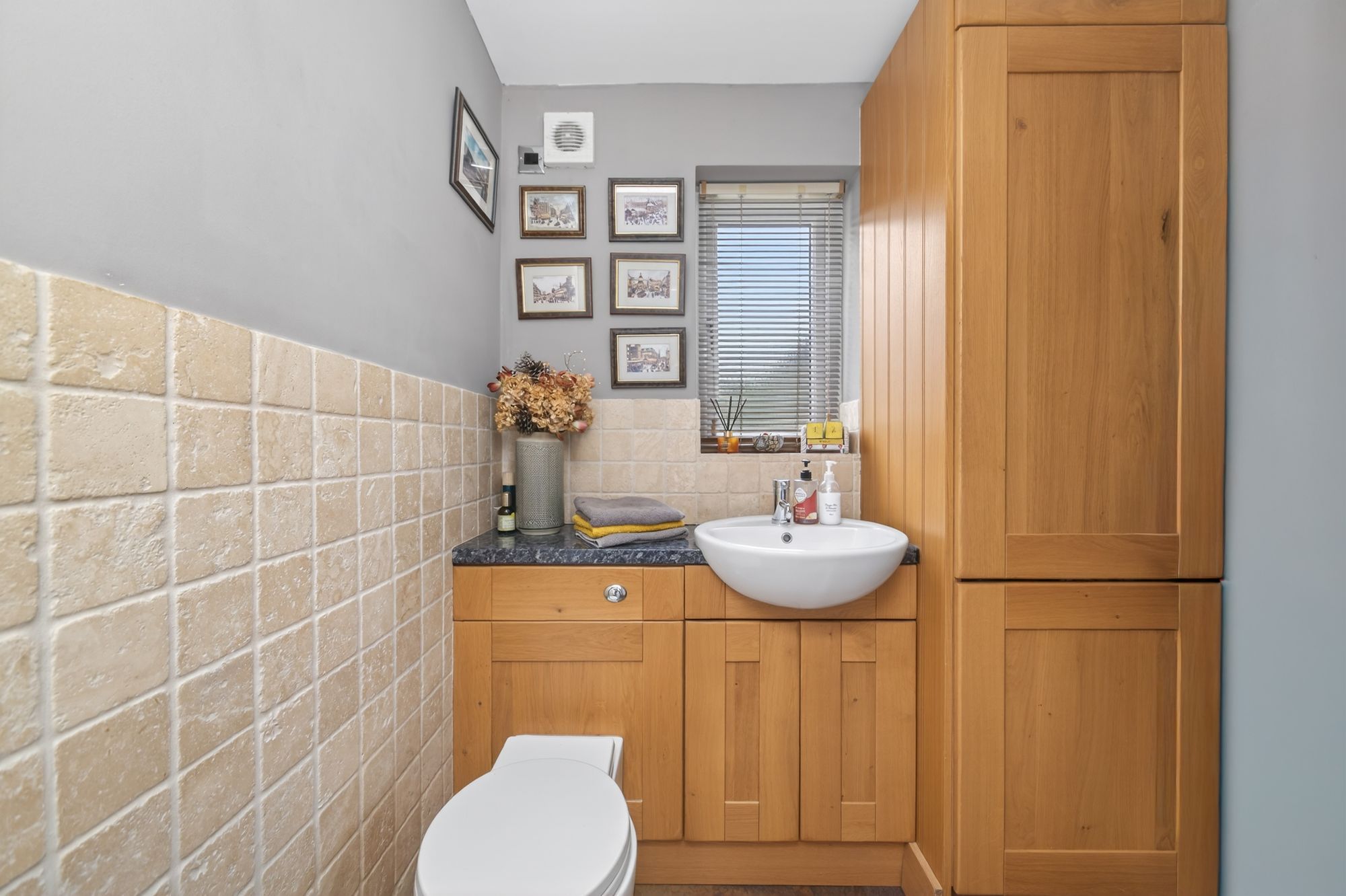 DOWNSTAIRS W.CThis beautifully presented cloakroom has been thoughtfully designed to maximise space, featuring bespoke oak shaker-style units with excellent storage, including a floor-to-ceiling cupboard. It incorporates a semi-recessed wash hand basin and low flush W.C. with concealed cistern, set within contrasting granite work surfaces. Finished with part stone-effect tiling, the room also benefits from a rear-facing uPVC double-glazed window and extractor fan.