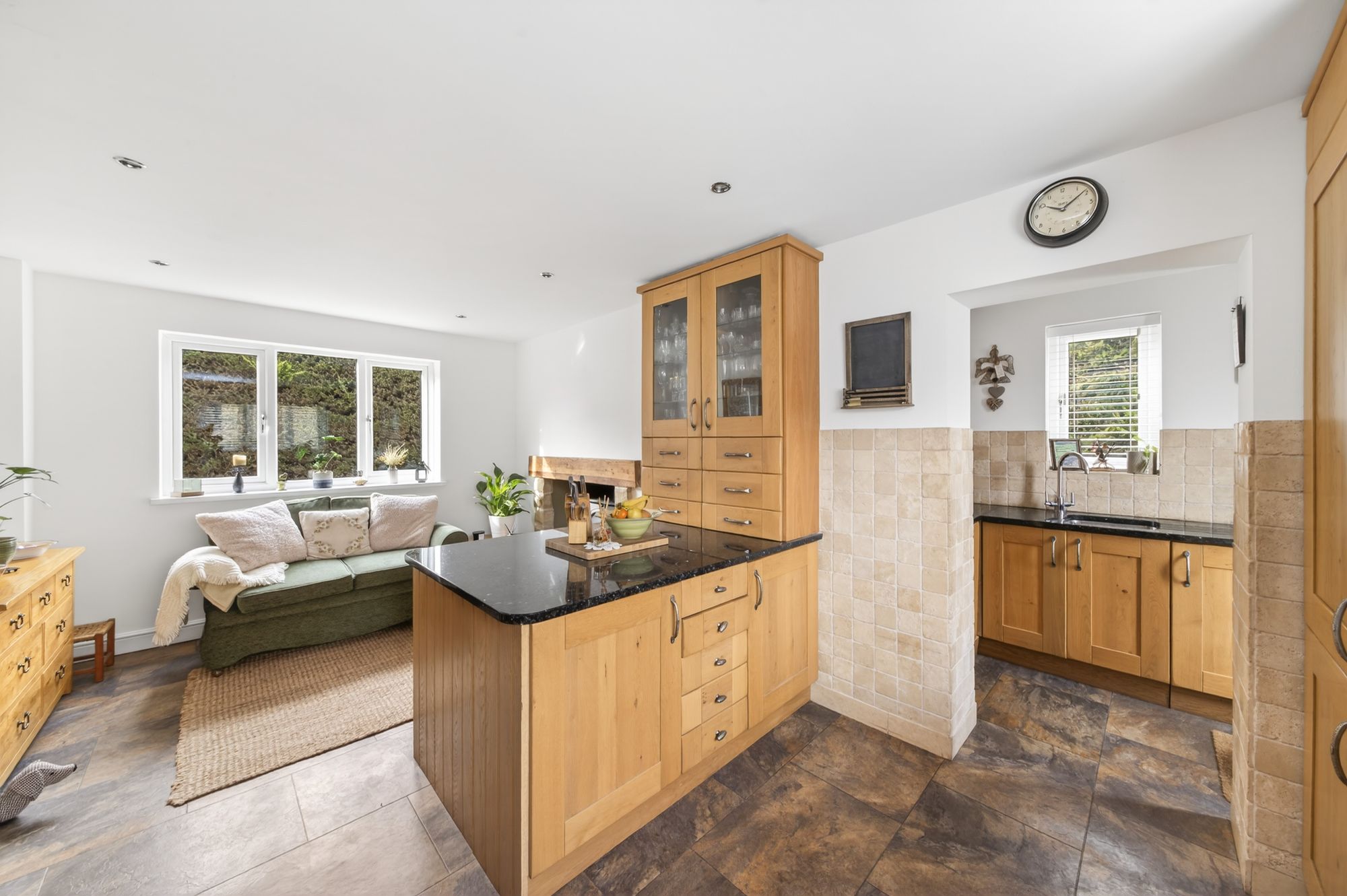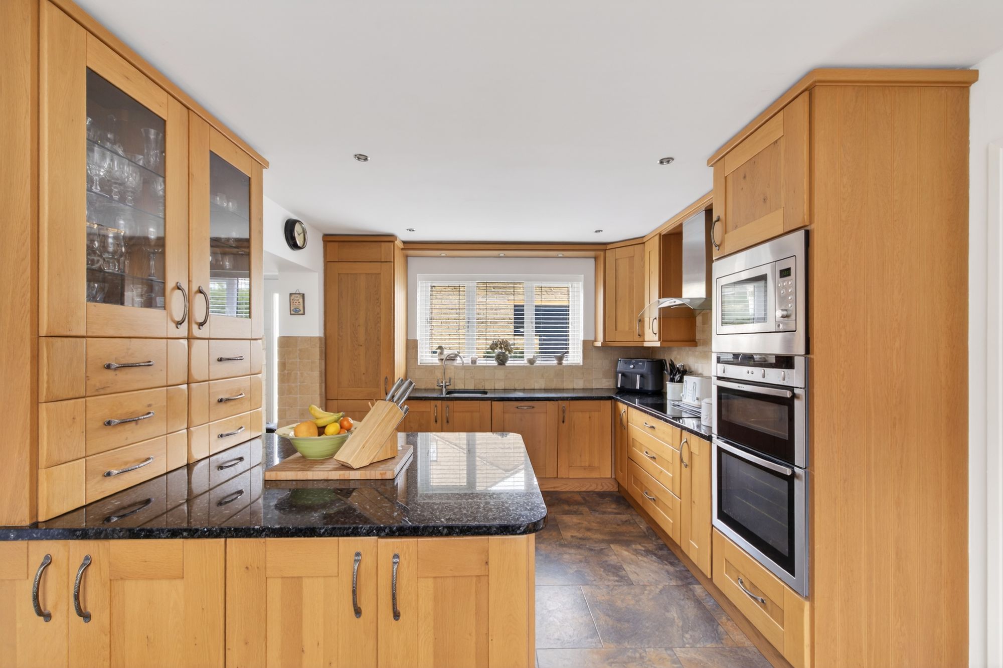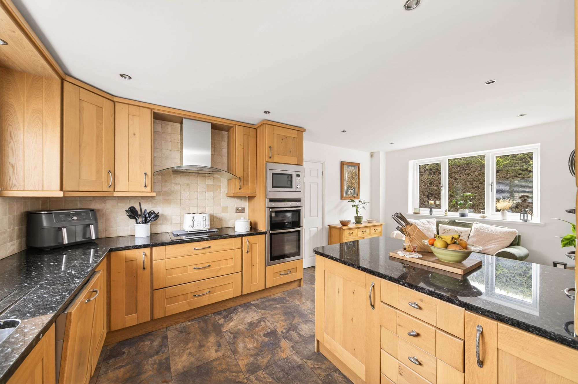 LIVING BREAKFAST KITCHENForming the heart of the home is this beautifully presented and generously proportioned breakfast kitchen, fitted with a range of solid oak shaker-style base and wall units, offering ample storage and preparation space. A central island unit provides further versatility, incorporating deep pan drawers and finished with contrasting granite work surfaces, which extend throughout to create a durable and elegant working area. The space is further enhanced by a characterful tiled splashback, with the walls part tiled, and a stainless-steel sink with chrome mixer tap, positioned beneath a uPVC double-glazed window to the rear. Additional features include inset ceiling spotlights, stone-effect Karndean flooring, and a comprehensive range of integrated appliances, including a fridge freezer, Neff oven and grill, integrated microwave, four-ring induction hob with curved glass chimney hood style extractor over, and an integrated dishwasher.