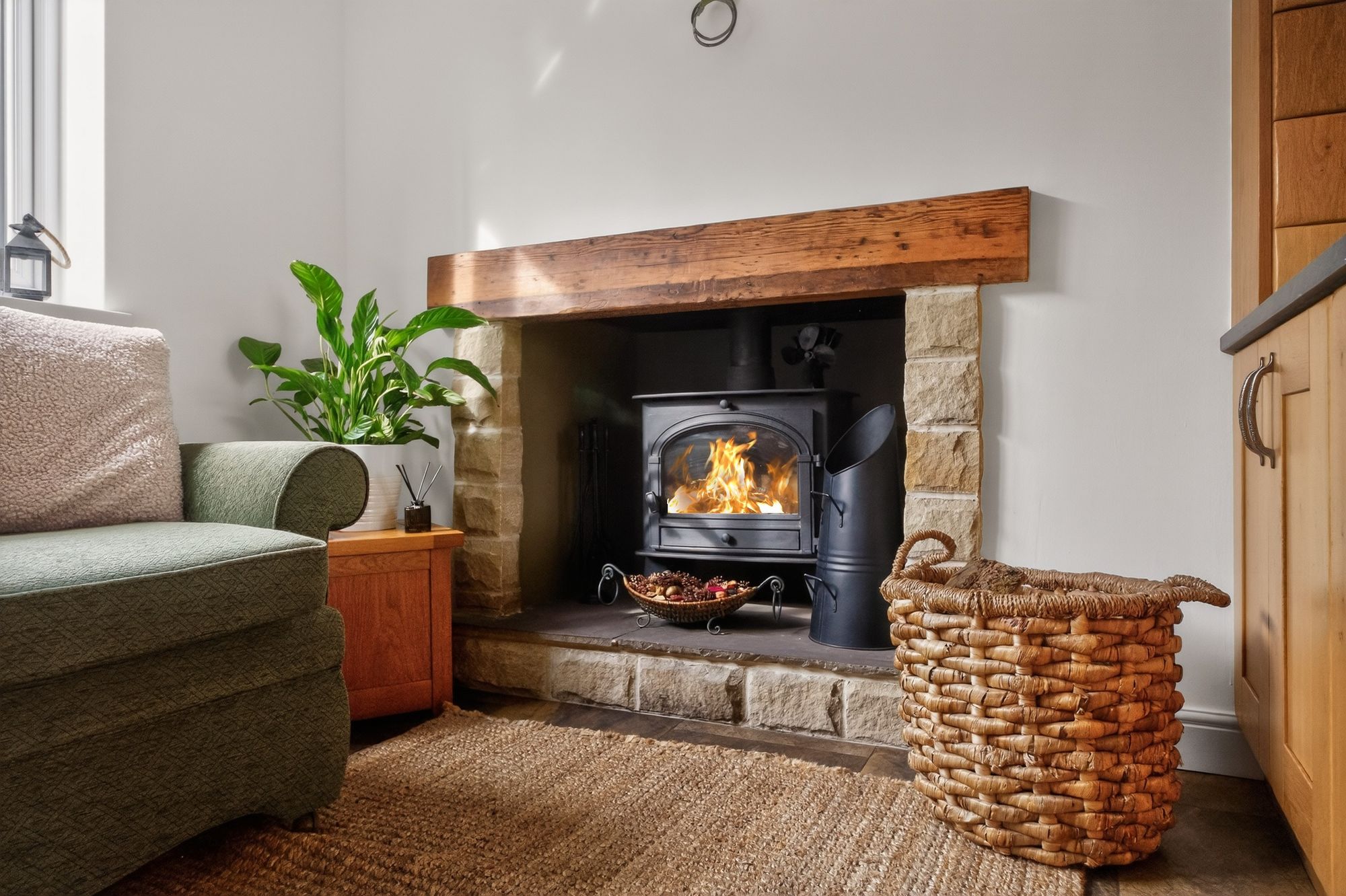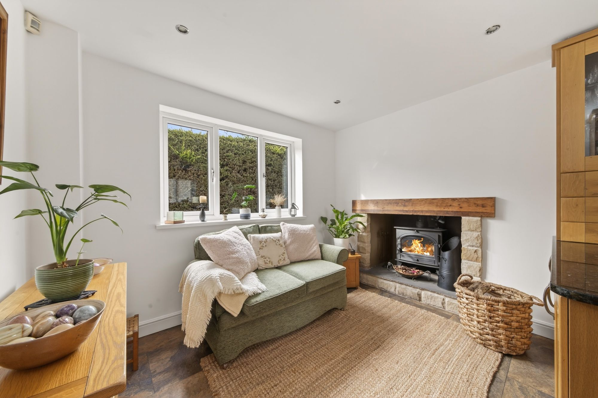 LIVING BREAKFAST KITCHENThe kitchen flows seamlessly into an open-plan living area, creating a superb space for both everyday family living and entertaining, and featuring a charming multi fuel wood-burning stove which provides a focal point to the room. This inviting area is flooded with natural light via a uPVC window to the front and continues the Karndean flooring, combining practicality with a high-quality finish. The overall layout provides a comfortable and highly sociable environment, perfectly suited to modern family living.