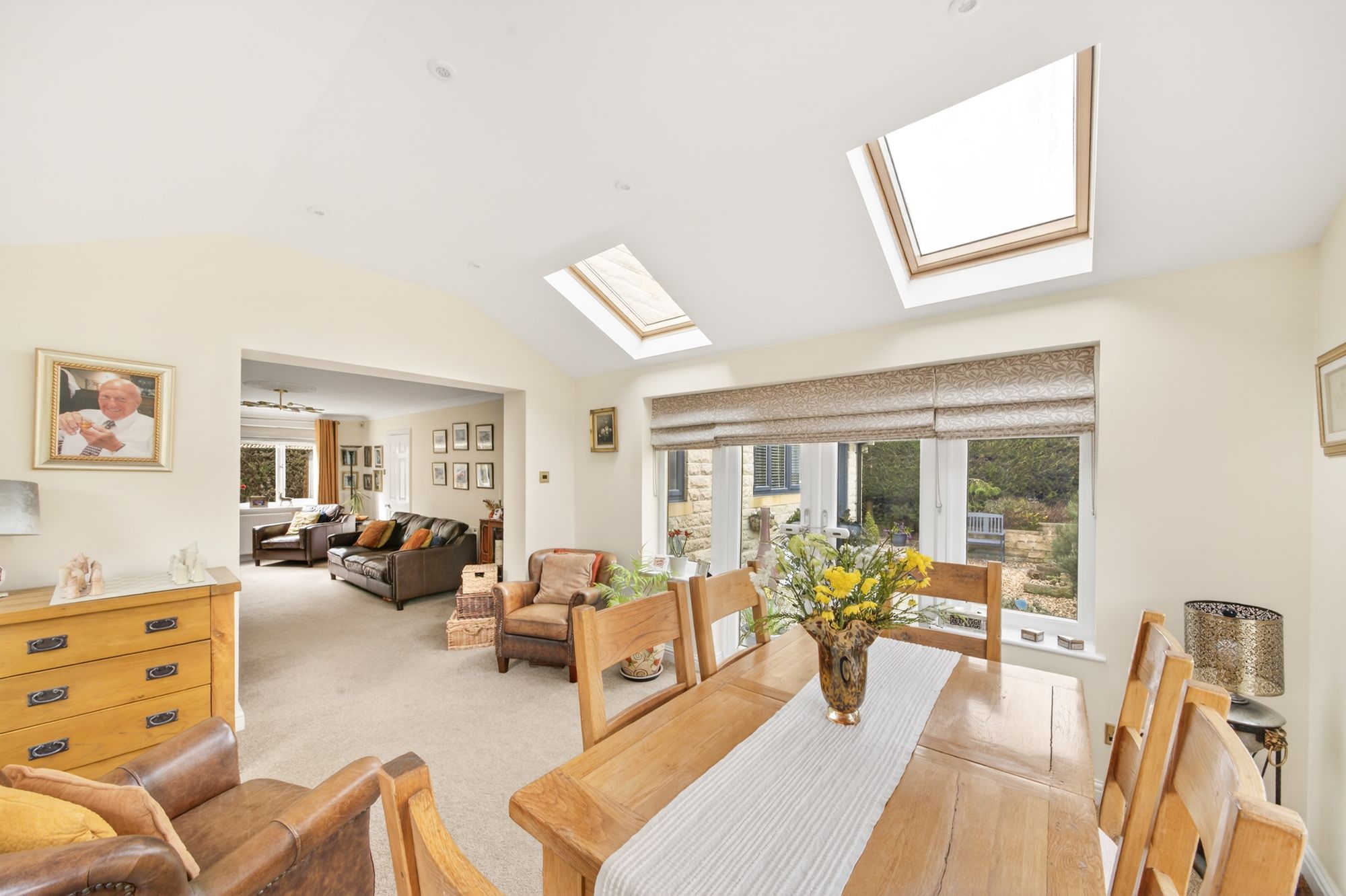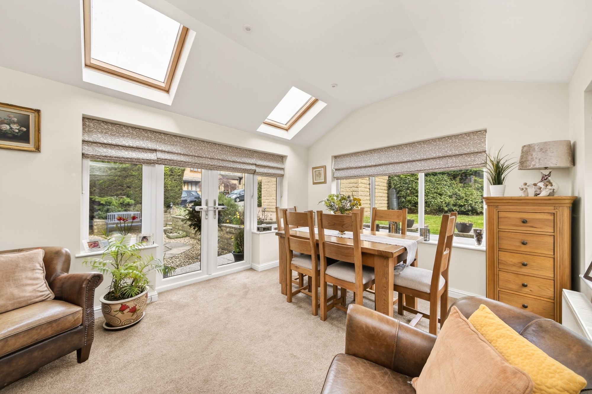 OPEN PLAN LIVING DINING ROOMForming part of the home’s extension and offering a wealth of versatile and generously proportioned ground floor accommodation, this room is currently utilised as a dining room but could equally serve as a garden room, secondary sitting area, or playroom. The space is flooded with natural light via two uPVC double-glazed windows to the side elevation, a further uPVC double-glazed window to the rear, and twin French doors with glazed side panels, providing direct access to the garden. Additional features include two Velux roof windows, inset ceiling spotlights, and a central heating radiator, creating a bright and inviting environment well suited to a variety of uses.
