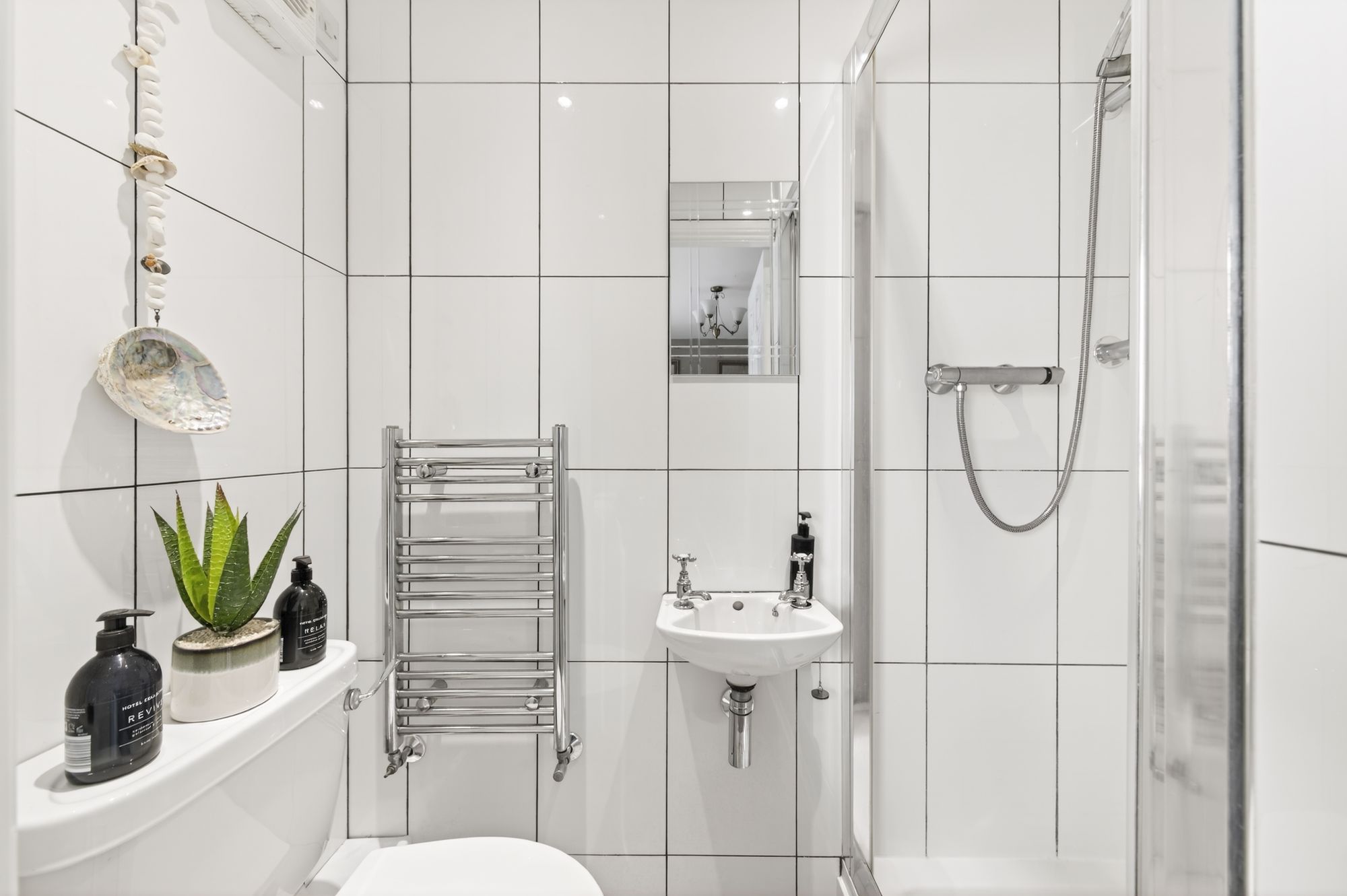 EN-SUITE SHOWER ROOMThe en-suite shower room is fitted with a low flush W.C. and a wall-mounted wash hand basin with chrome mixer tap. There is a shower enclosure with mains-fed shower and attachment, together with a chrome heated towel rail/radiator. The room is fully tiled to both walls and floor, with inset ceiling spotlights completing the space.