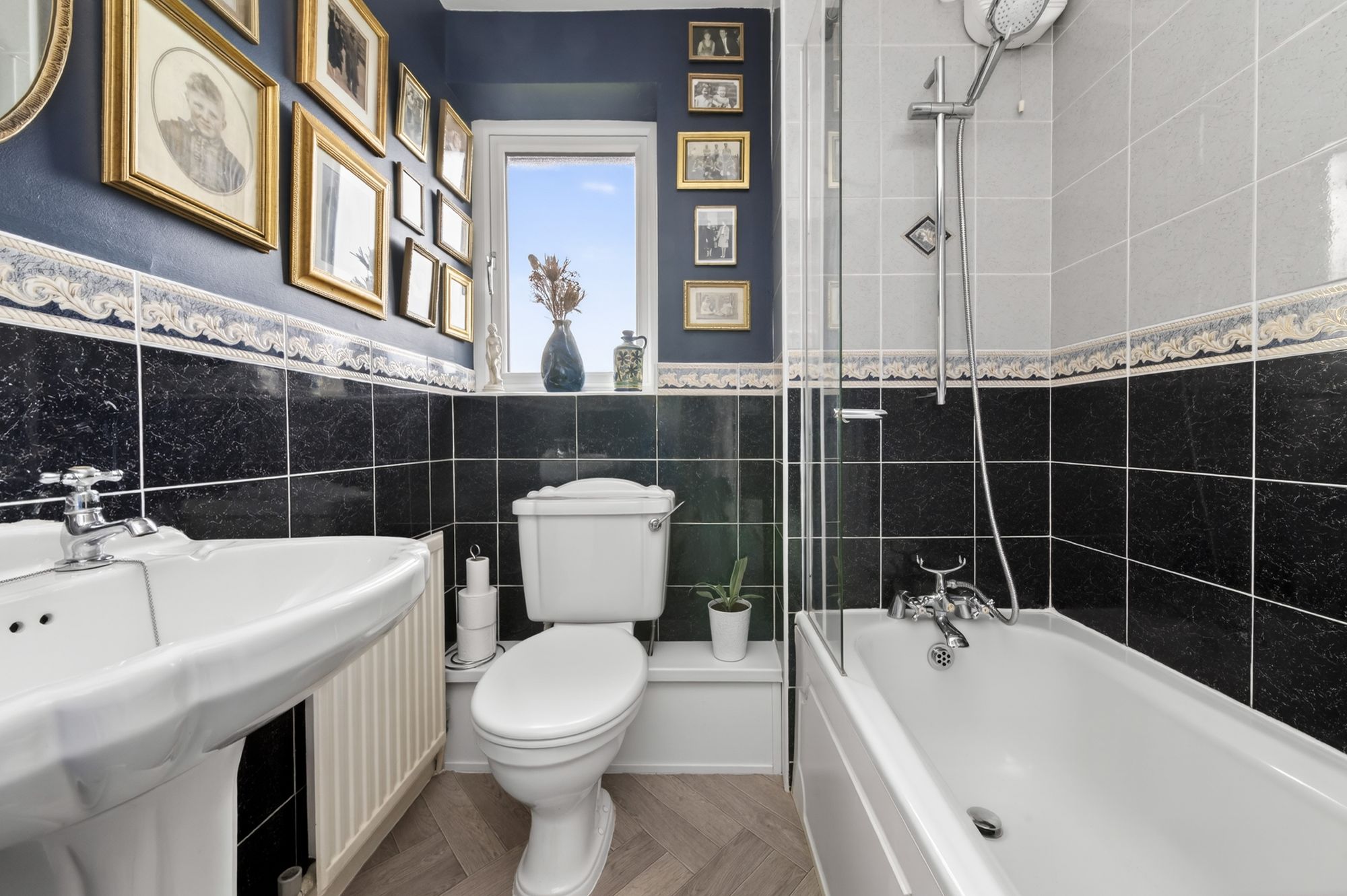 HOUSE BATHROOMComprising a three-piece white suite, including a close-coupled W.C., pedestal basin with chrome mixer taps, and a bathtub with chrome mixer taps and shower attachment. The room features an obscured uPVC double-glazed window to the front, a central heating radiator, and laminate flooring.