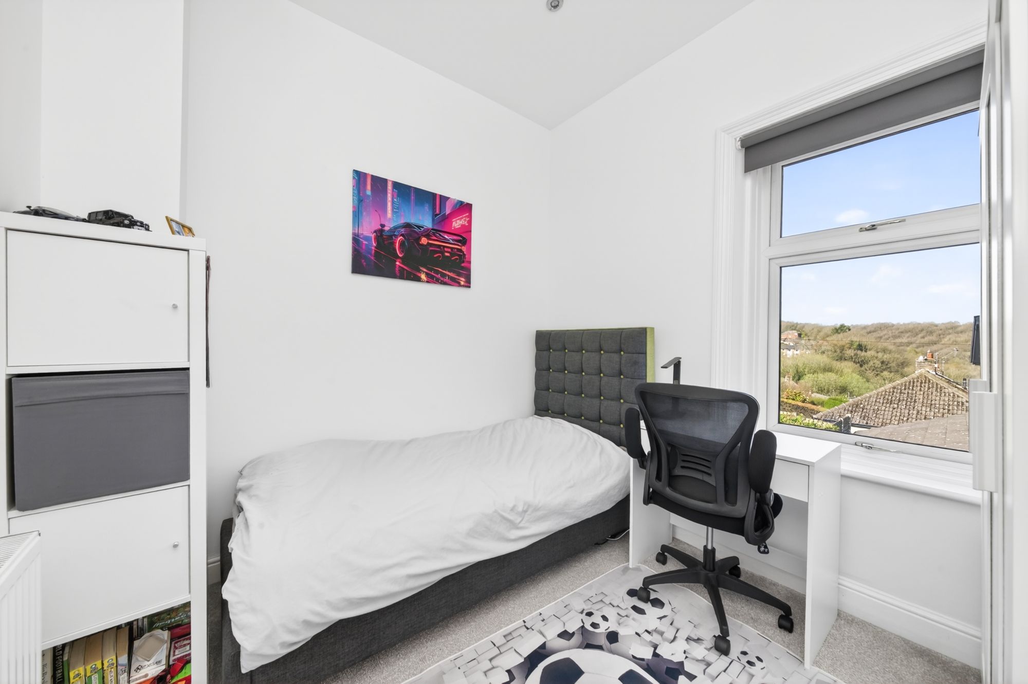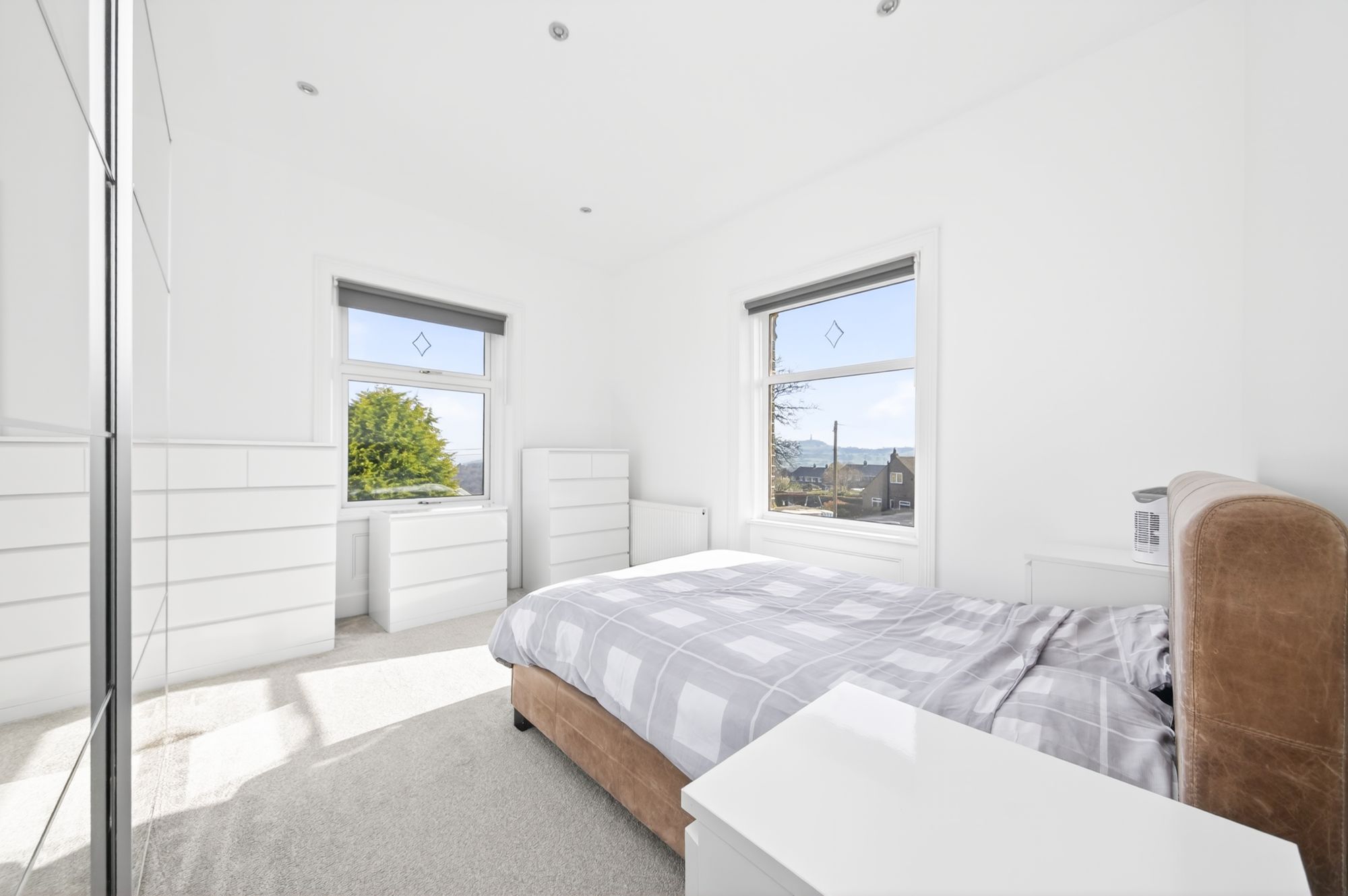 As the photography suggests, bedroom one is a particularly light and airy double bedroom with dual aspect windows to both the front and side elevations. The window to the side having a fabulous open aspect view over rooftops towards Castle Hill, and the window to the front elevation offering superb far-reaching views right across the valley as far as the eye can see. There is a tall ceiling with inset spotlighting and radiator.