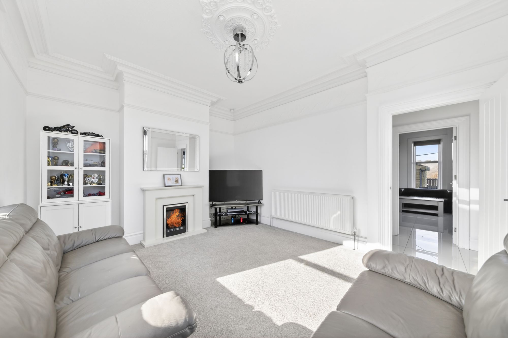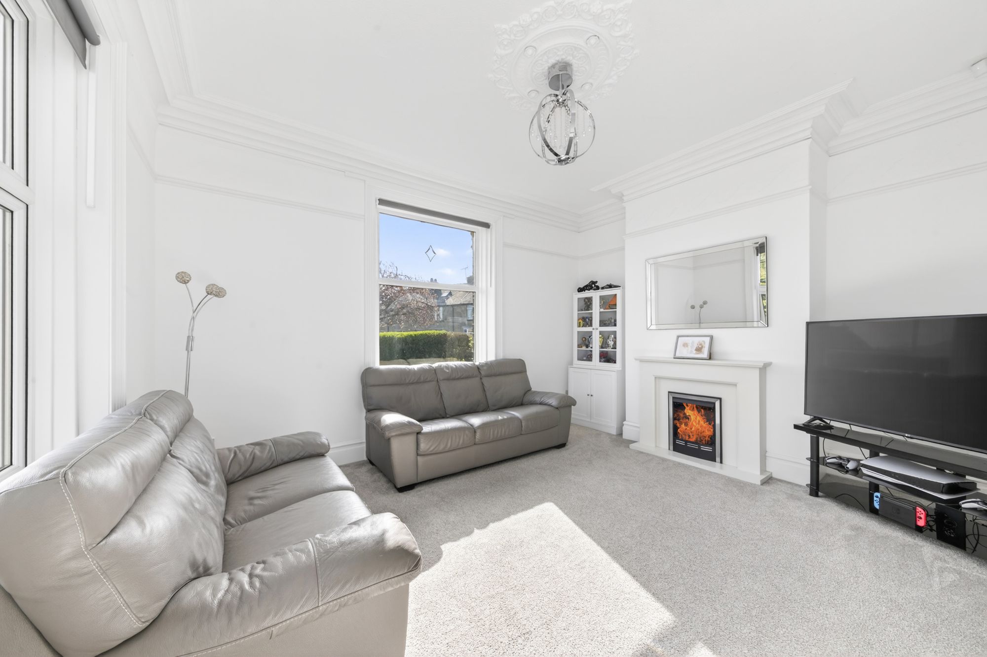 As the photography suggests, the lounge enjoys a wealth of natural light which cascades through the dual aspect double glazed windows to both the front and side elevations. There is a fabulous high ceiling with decorative cornicing, plate rail and ornate ceiling rose with ceiling point. There is a radiator and the focal point of the room is the electric fireplace with a decorative mantel and surround. The window to the front elevation, again taking full advantage of the elevated position of the property with superb views across the valley.