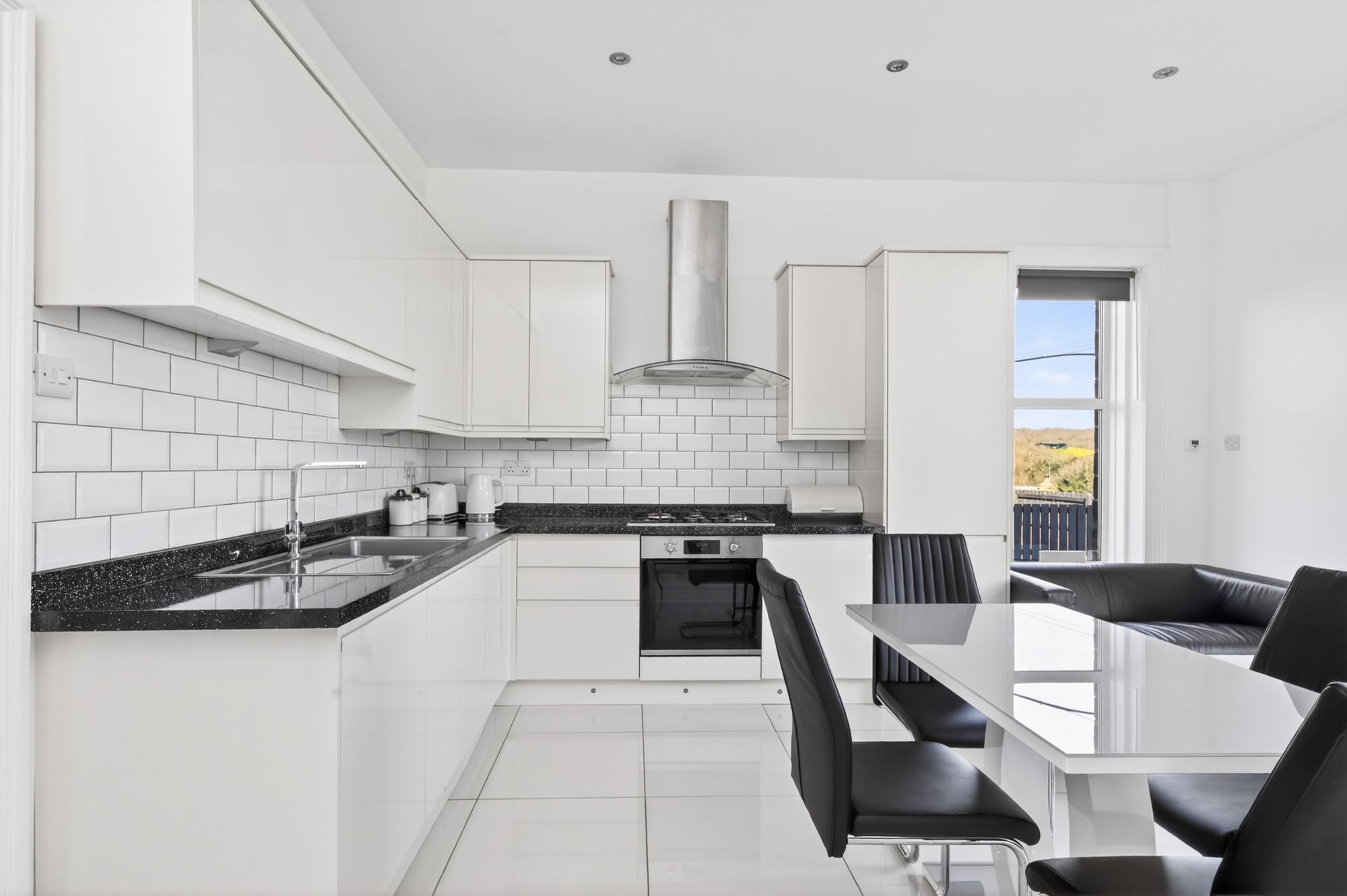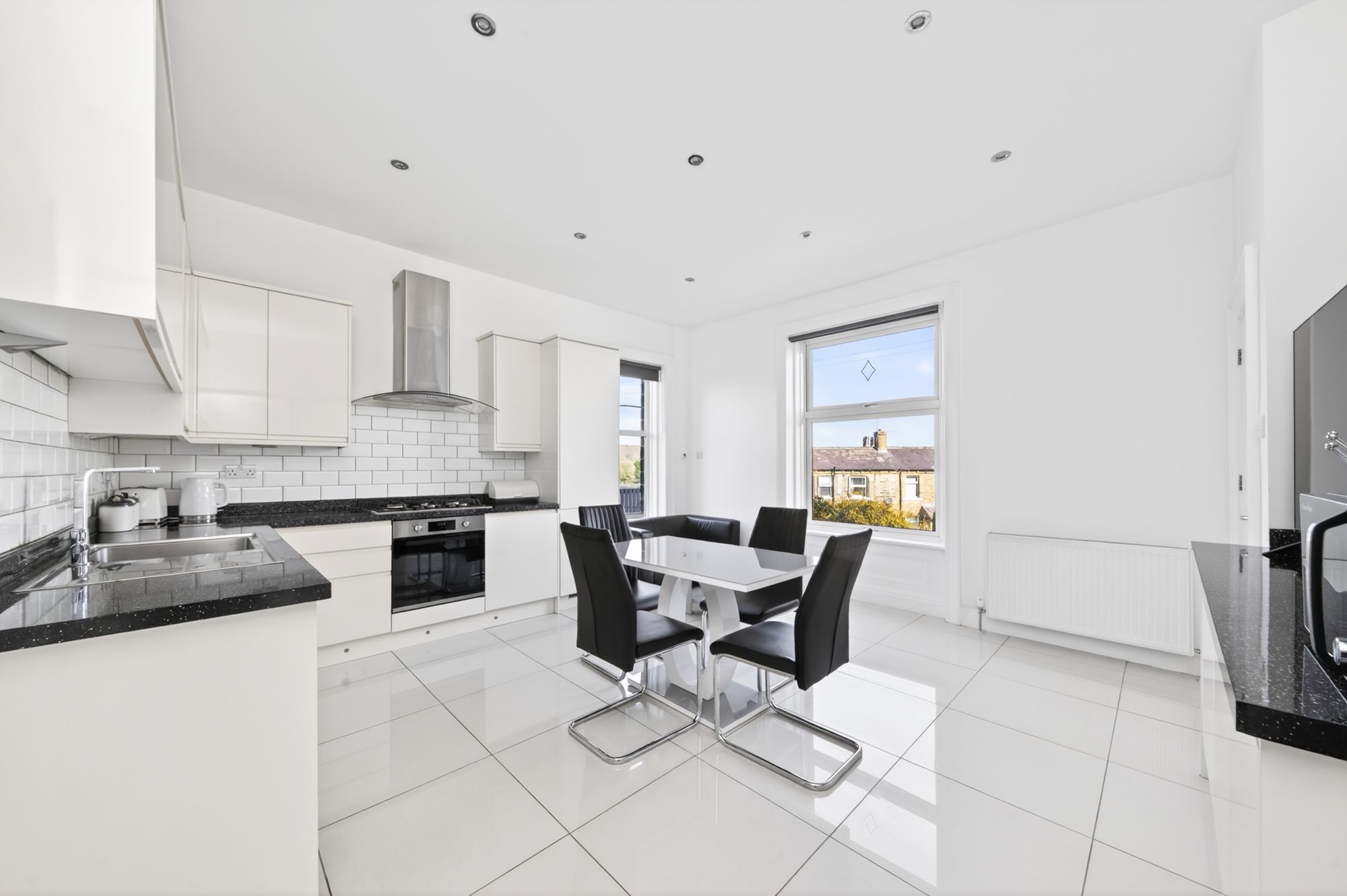 The attractive tiled flooring with underfloor heating continues through into the open plan dining kitchen, which again enjoys a great deal of natural light with dual aspect windows to the front and side elevations. There is inset spotlight into the ceiling, two radiators and doors provide access to the rear entrance and enclose the staircase descending to the lower ground floor.
