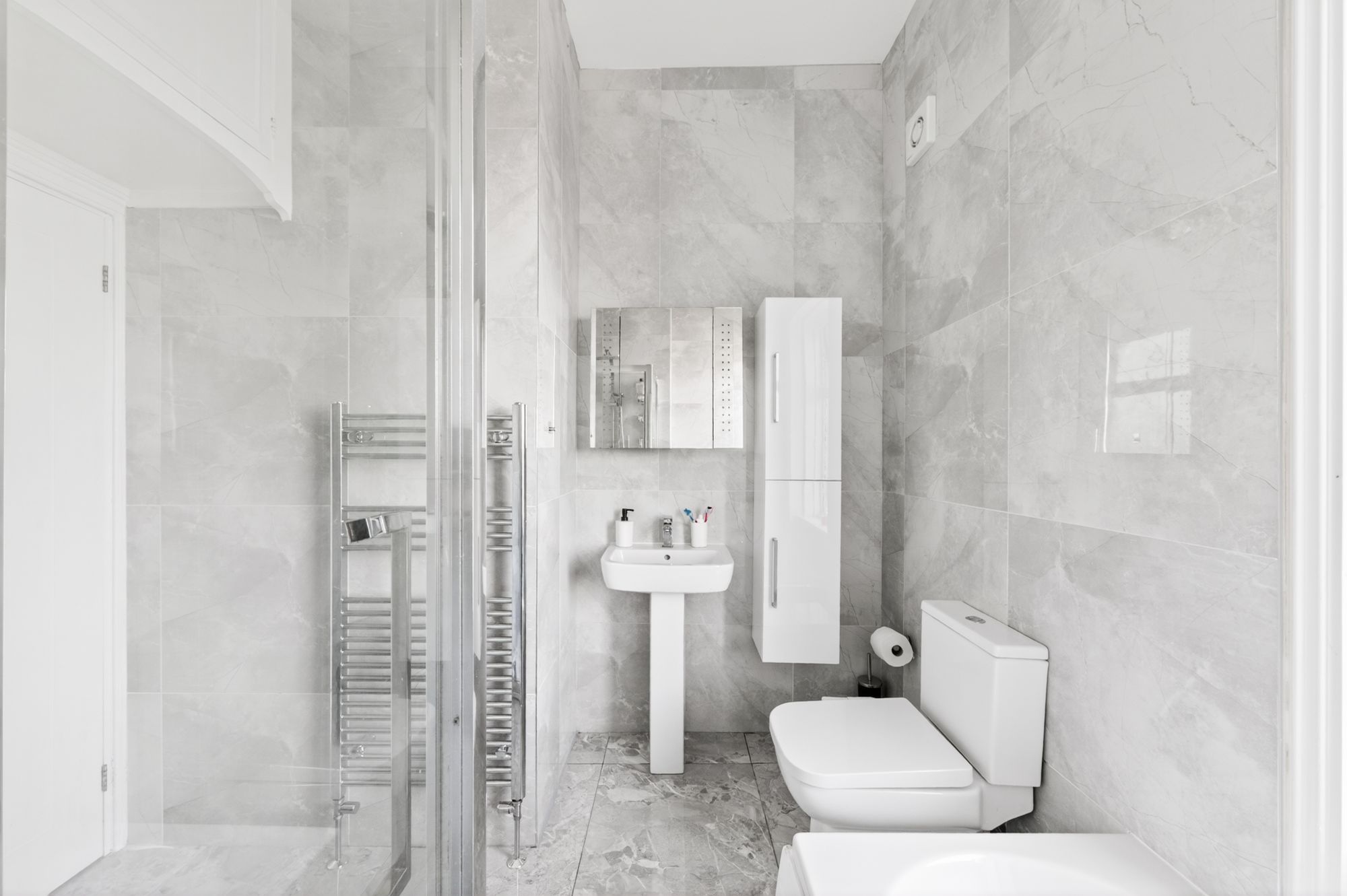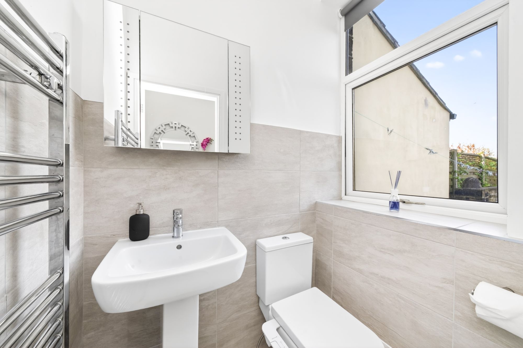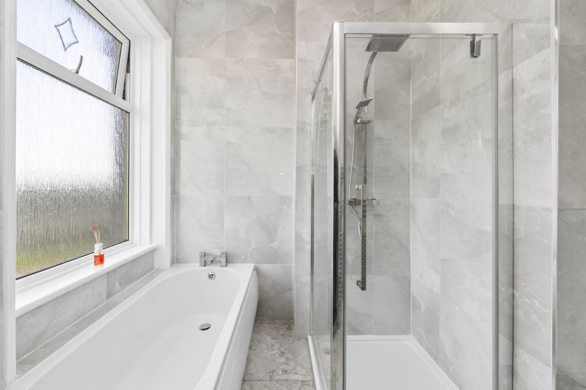 The house bathroom features a luxurious modern contemporary four-piece suite, which comprises fixed frame shower cubicle with thermostatic rainforest shower head and with separate handheld attachment, a panel bath, broad pedestal wash hand basin with chrome monobloc mixer tap and a low level w.c. with push button flush. There are attractive tiled walls and contrasting tiled flooring, inset spotlighting to the ceiling, a chrome ladder style radiator, extractor vent and a double-glazed window with obscure glass to the front elevation. Additionally, there is a useful storage cupboard over the entrance door.