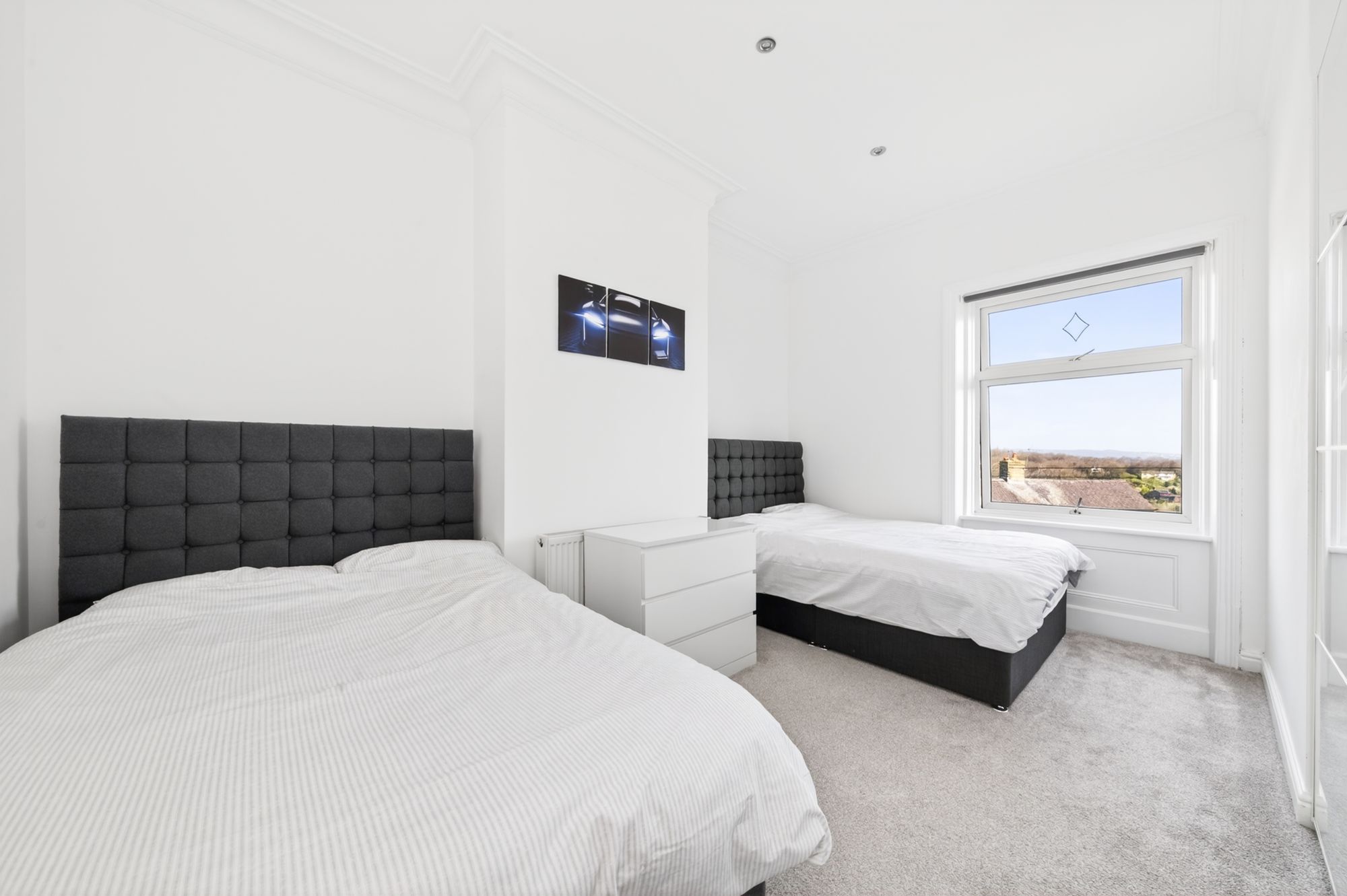 Bedroom two again is a generous proportioned double bedroom which has ample space for freestanding furniture with a double-glazed window to the front elevation again with panoramic open aspect views over rooftops across the valley. There is decorative coving to the ceiling, inset spotlighting, a radiator and a useful fitted storage cupboard over the entrance door for additional storage.
