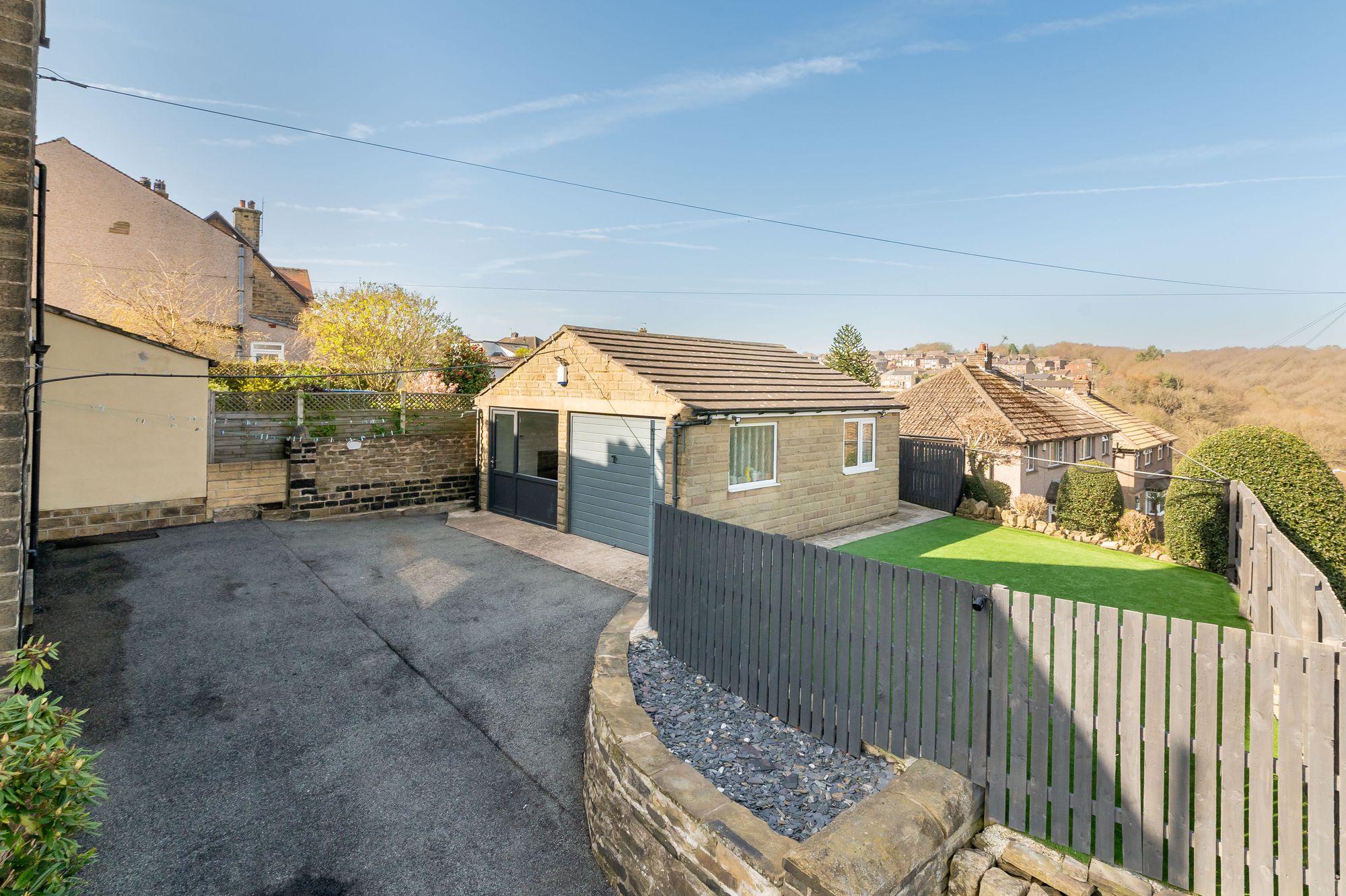 The ground floor accommodation briefly comprises of entrance, inner hallway, dual aspect lounge, open plan dining kitchen, rear entrance, utility room, downstairs WC and storm porch to the side elevation. To the first floor there are three double bedrooms and a luxury four-piece house bathroom. Externally there are lawn gardens to the front, to the side is a driveway with turning space providing off street parking for multiple vehicles, the drive then leads to a double detached garage which has converted into a useful home office and hobby room with separately accessed garage store. To the side there is an artificial lawn with fantastic views and a sheltered flagged patio for alfresco dining.