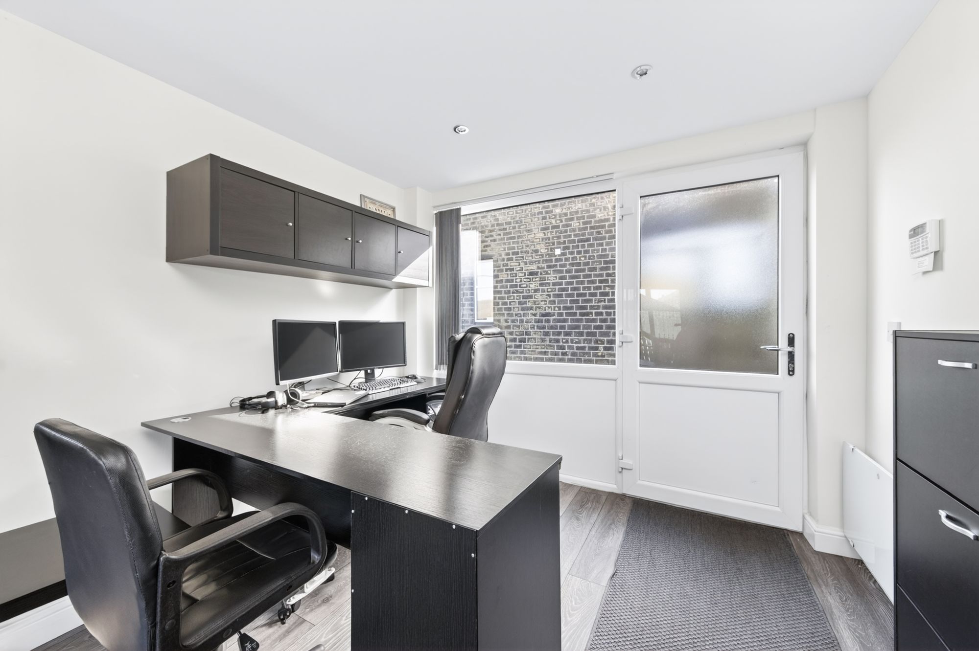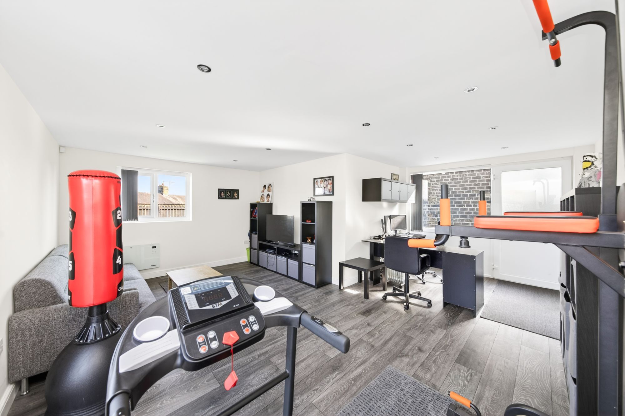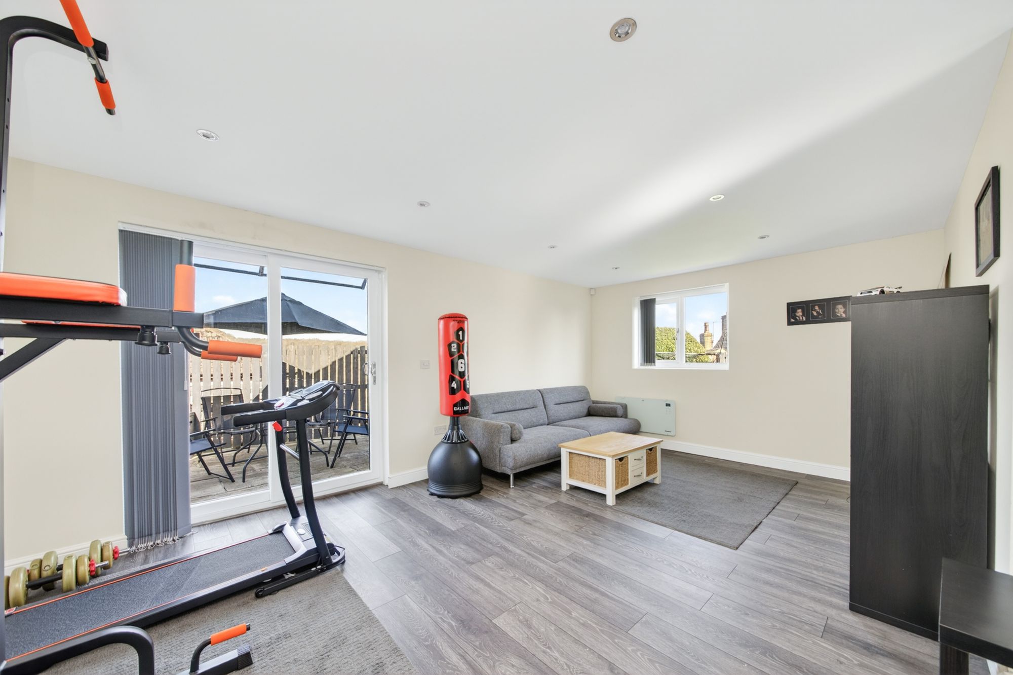 The double garage / studio has been converted into a multi-purpose and functional space, which is utilised as a home office / recreational area. There is a double-glazed pedestrian access door with adjoining window to the front elevation, high quality flooring, inset spotlighting and a bank of windows to the side elevation. There is a wall mounted electric heater and double-glazed sliding patio doors to the rear elevation providing access to the patio. The studio / garage is a most useful and versatile space and could be utilised for running a business, recreational use or a hobby room.